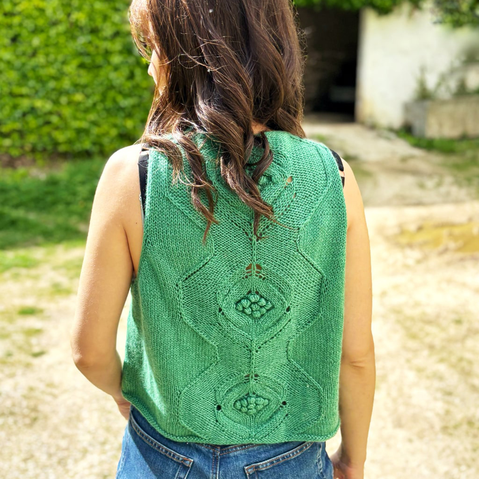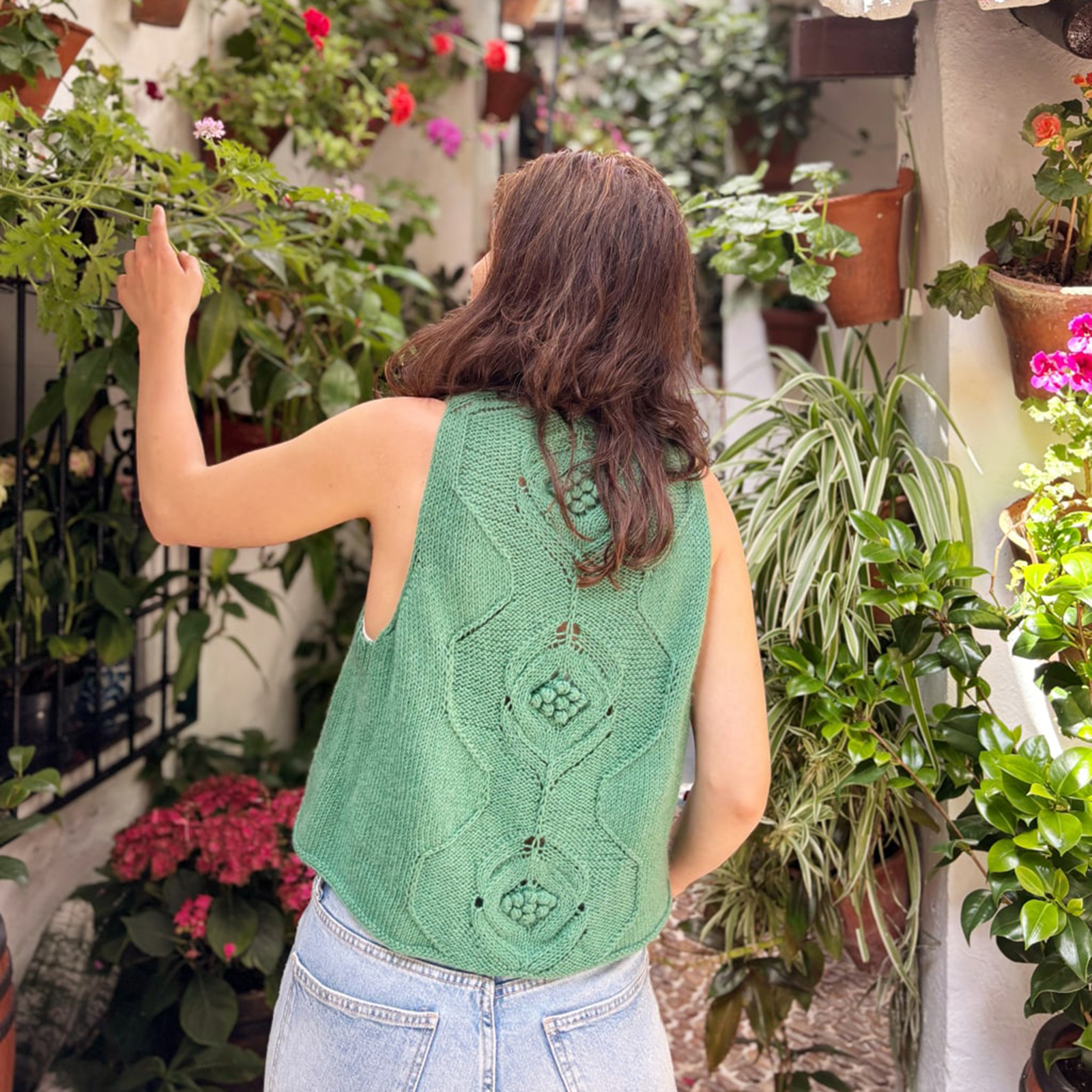 Aflora is a vest or tank born from yarn and patience, where each bobble blooms like a tiny budding flower. Inspired by baroque richness and quiet craft, it balances texture and lightness in a knitted garment.