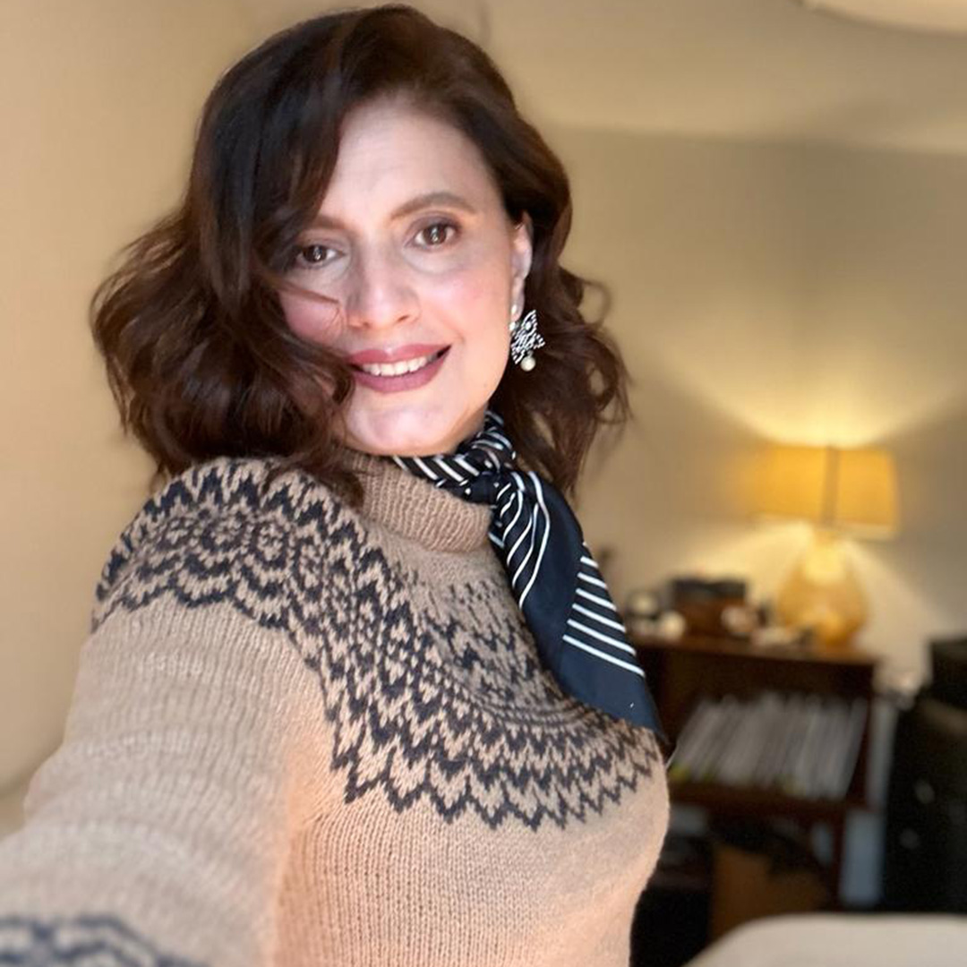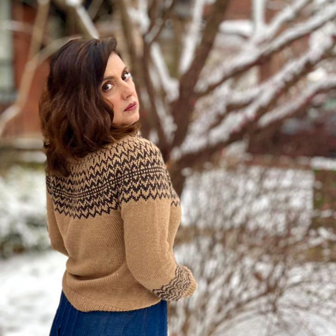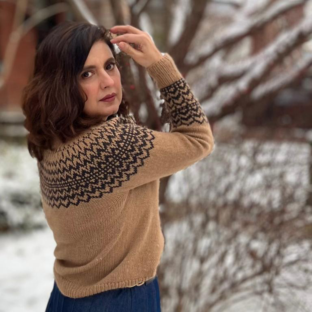 Alfonsina is a bottom up pullover with a matching stranded colourwork motif on the yoke and the forearms.