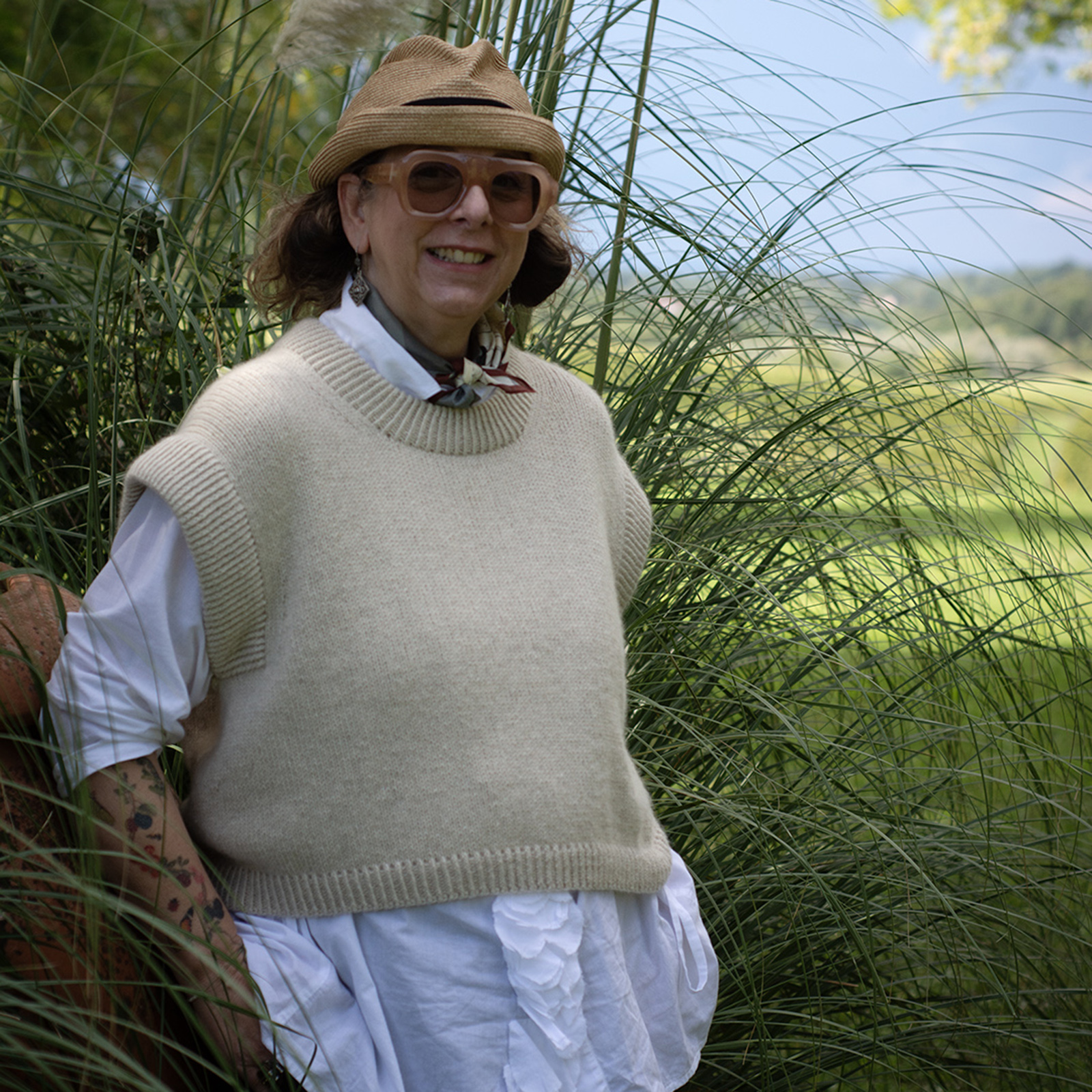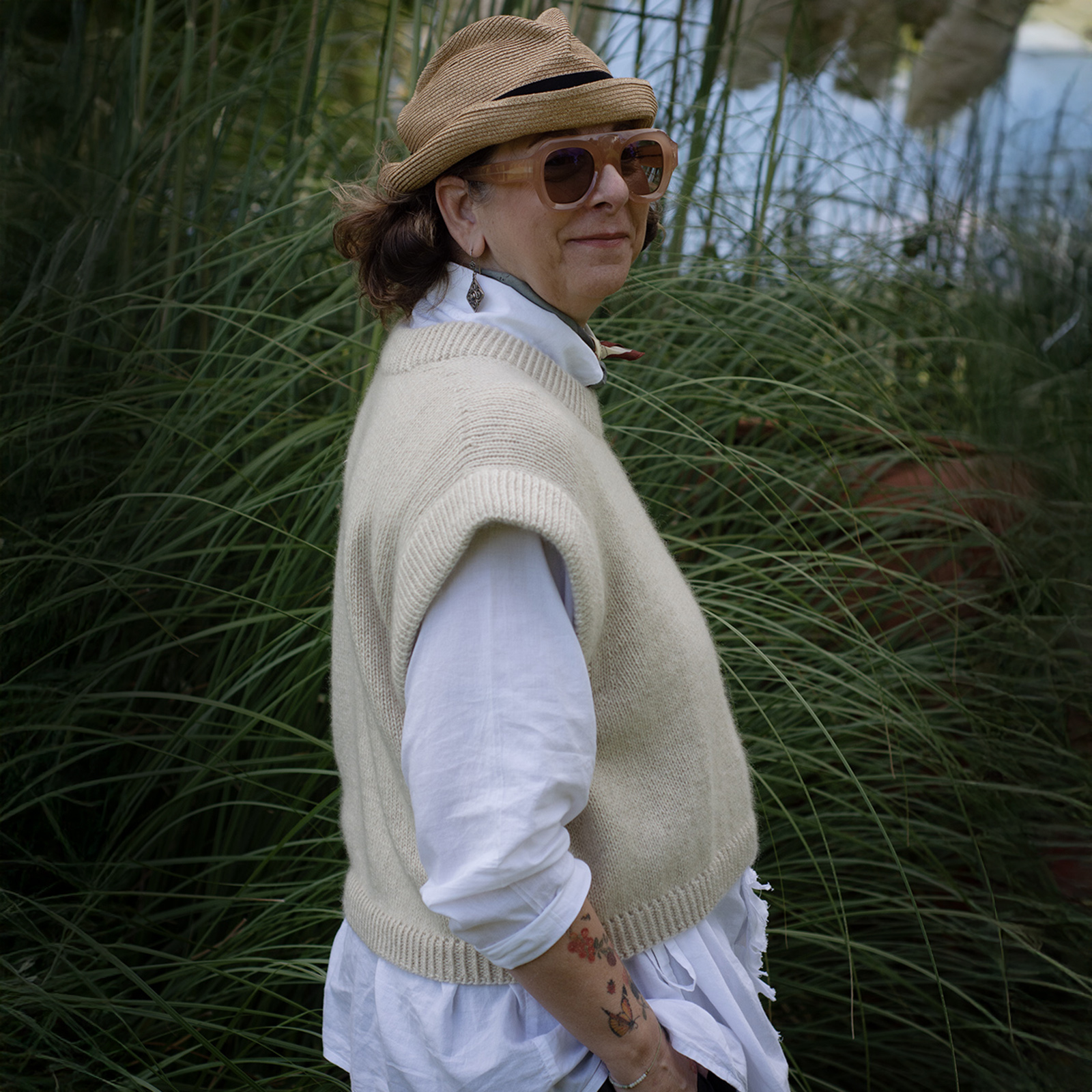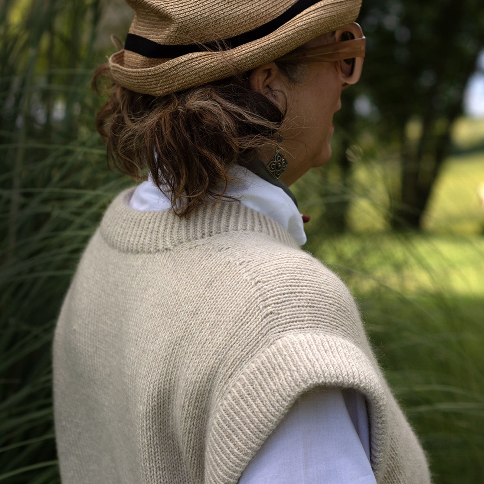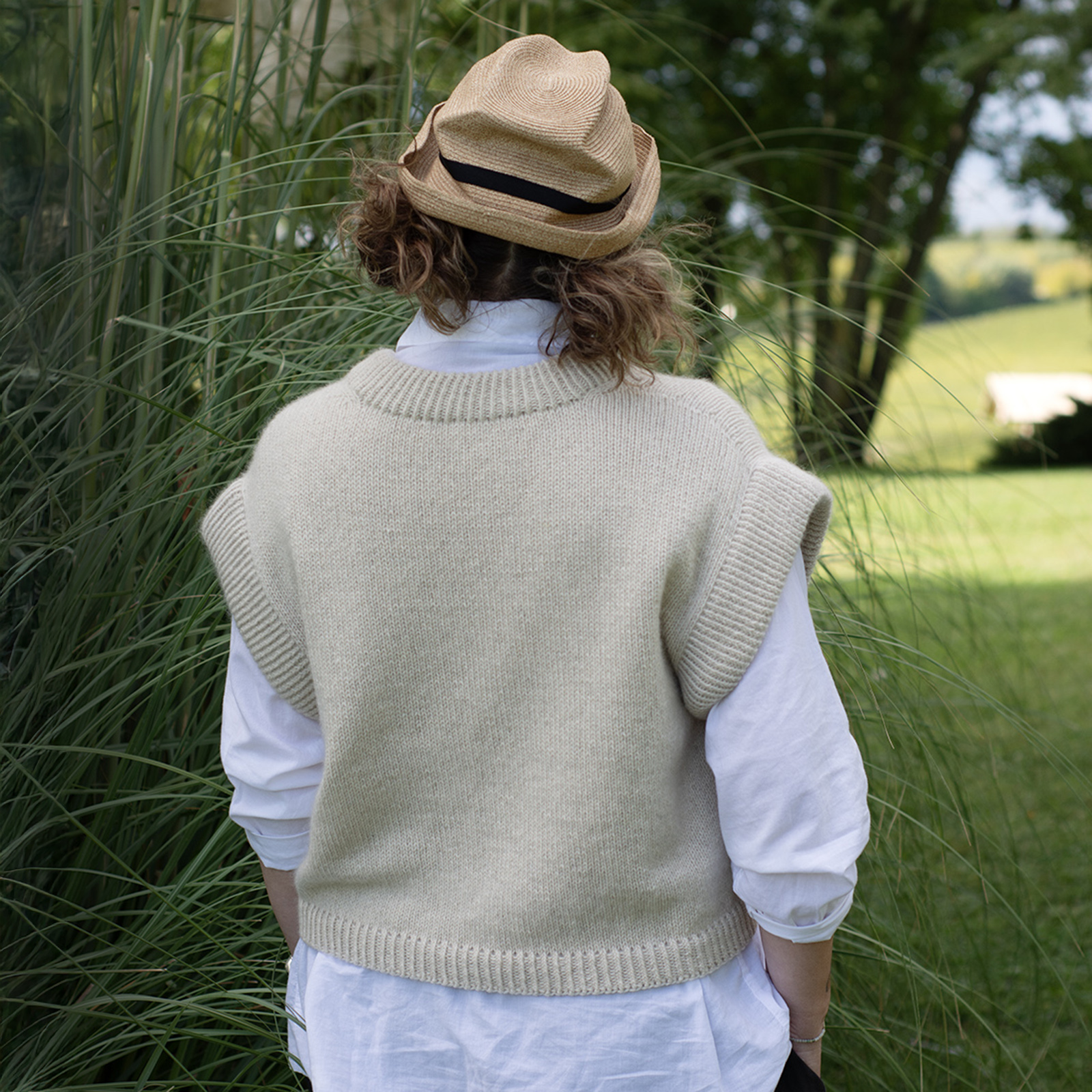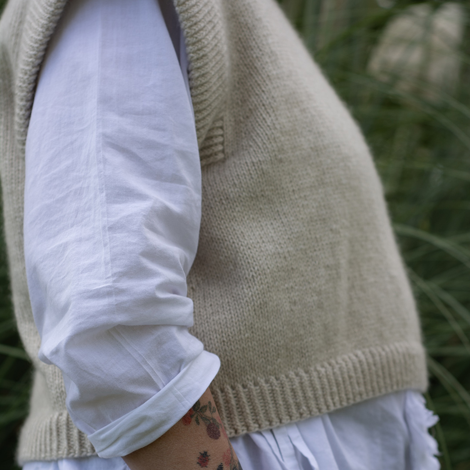 The Bruno Vest has an oversized, cropped fit and is designed to have approx. 20 cm 8 in of positive ease with slightly reduced ease in larger sizes, to ensure a more comfortable fit. This means the garment’s measurements will be approx. 20 cm 8 in larger than your actual bust circumference.
