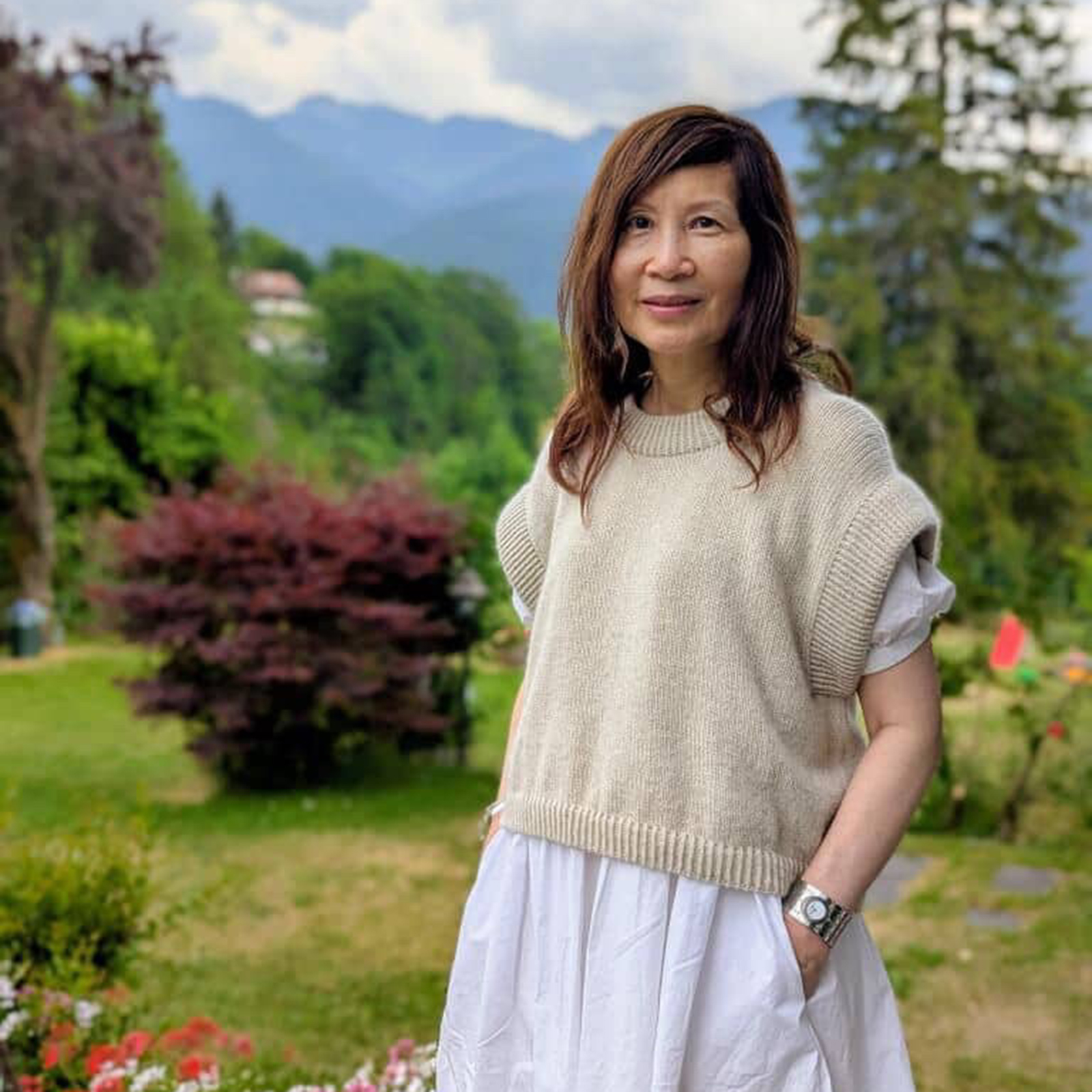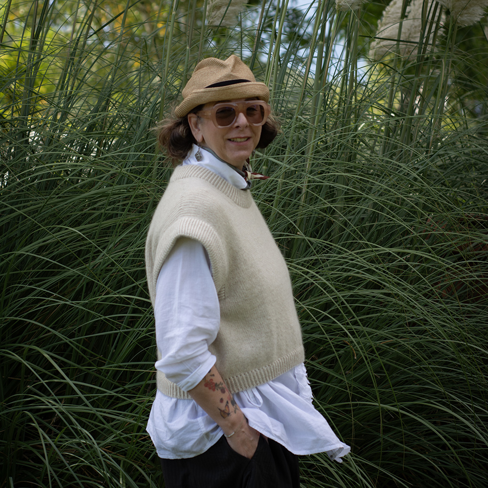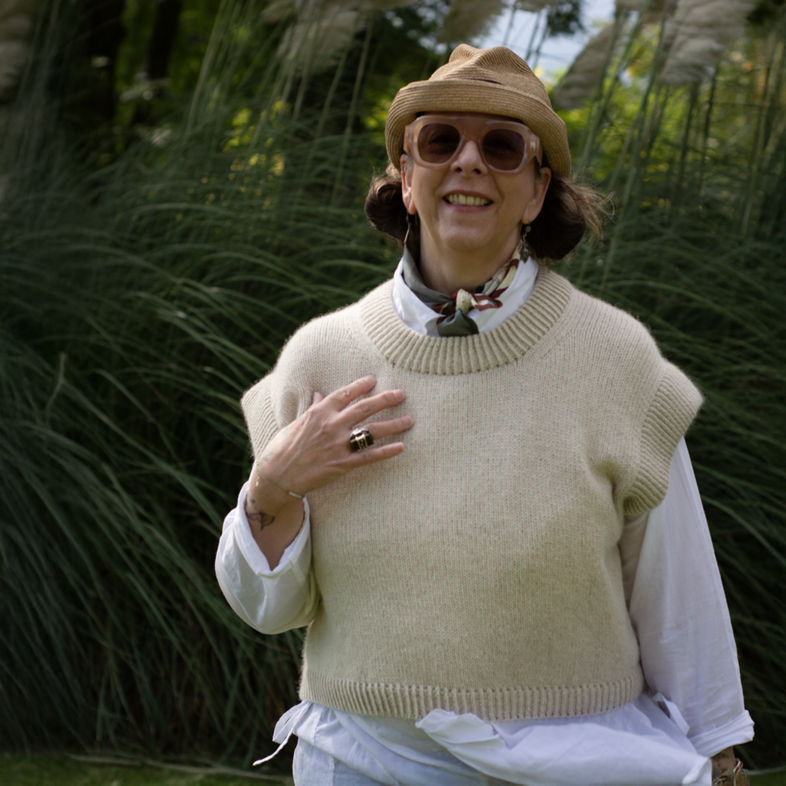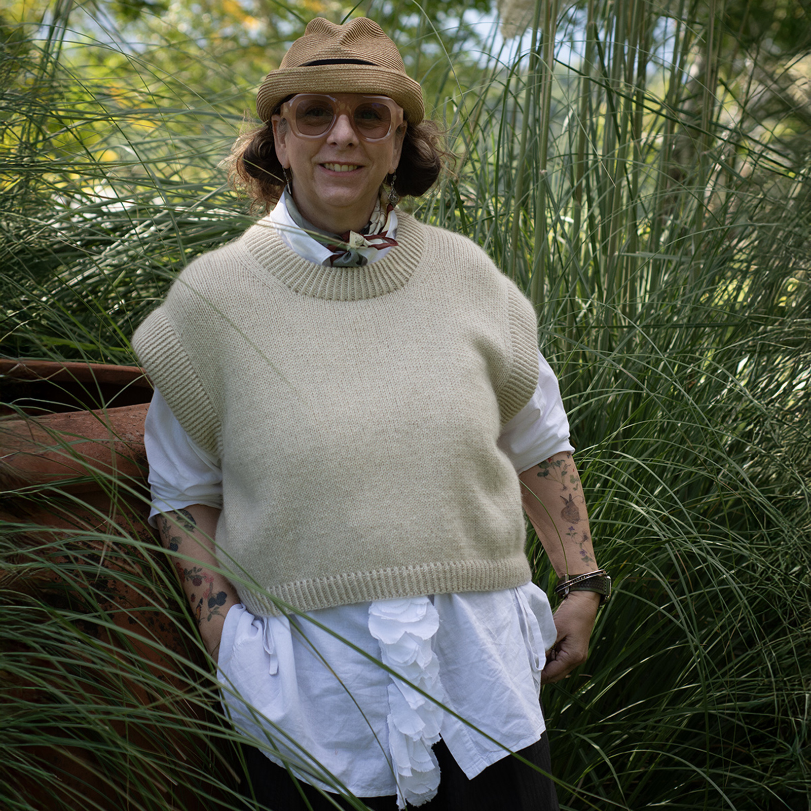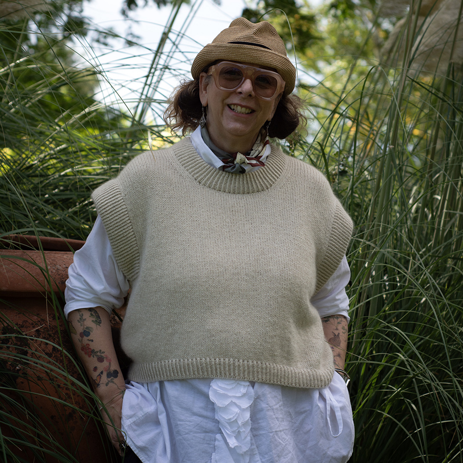 The Bruno Vest has an oversized, cropped fit and is designed to have approx. 20 cm 8 in of positive ease with slightly reduced ease in larger sizes, to ensure a more comfortable fit. This means the garment’s measurements will be approx. 20 cm 8 in larger than your actual bust circumference.