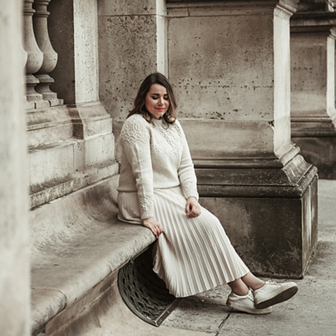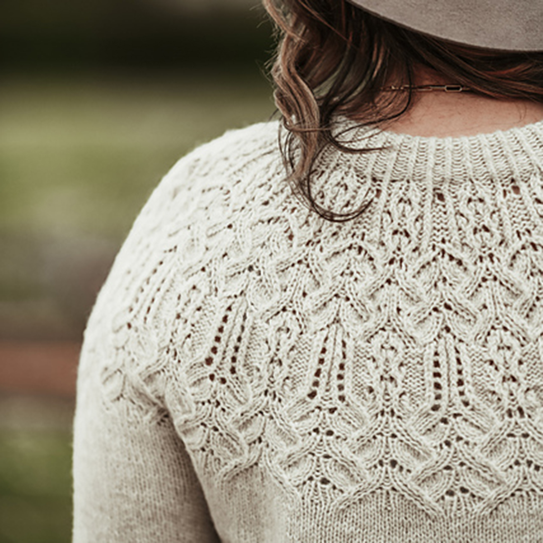 The Calliope pullover is knitted seamlessly top-down starting at the neckband. A beautiful lace pattern is worked on the yoke and the cuffs. The sleeves and body are separated at the underarm and knitted separately. The back is shaped with short-rows to give it a bit more length and to improve the fit.