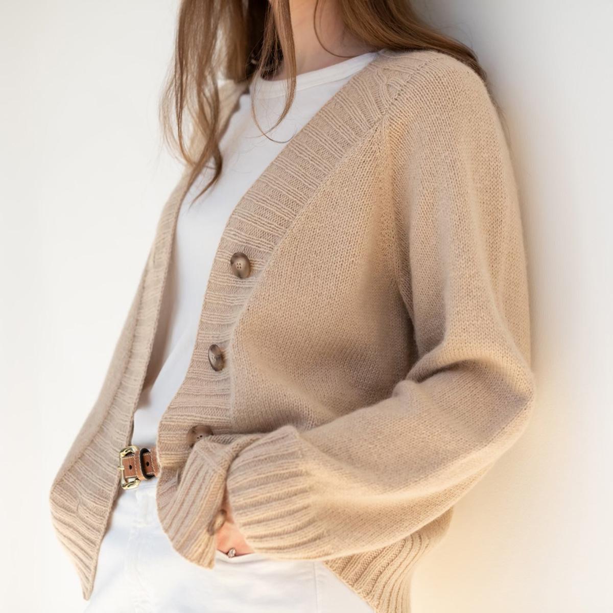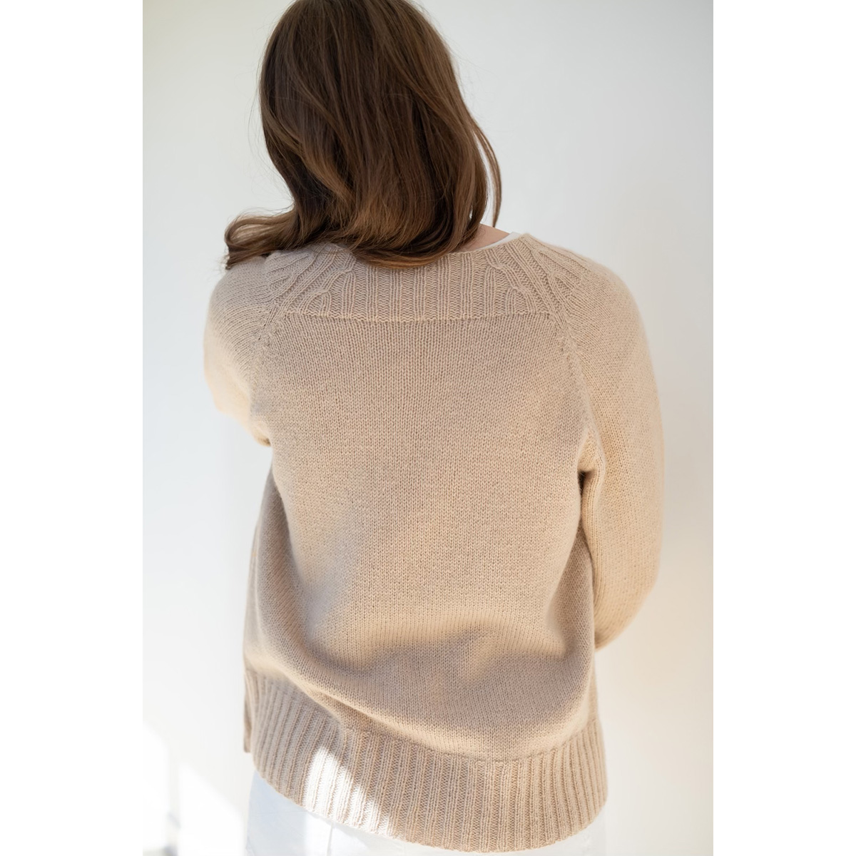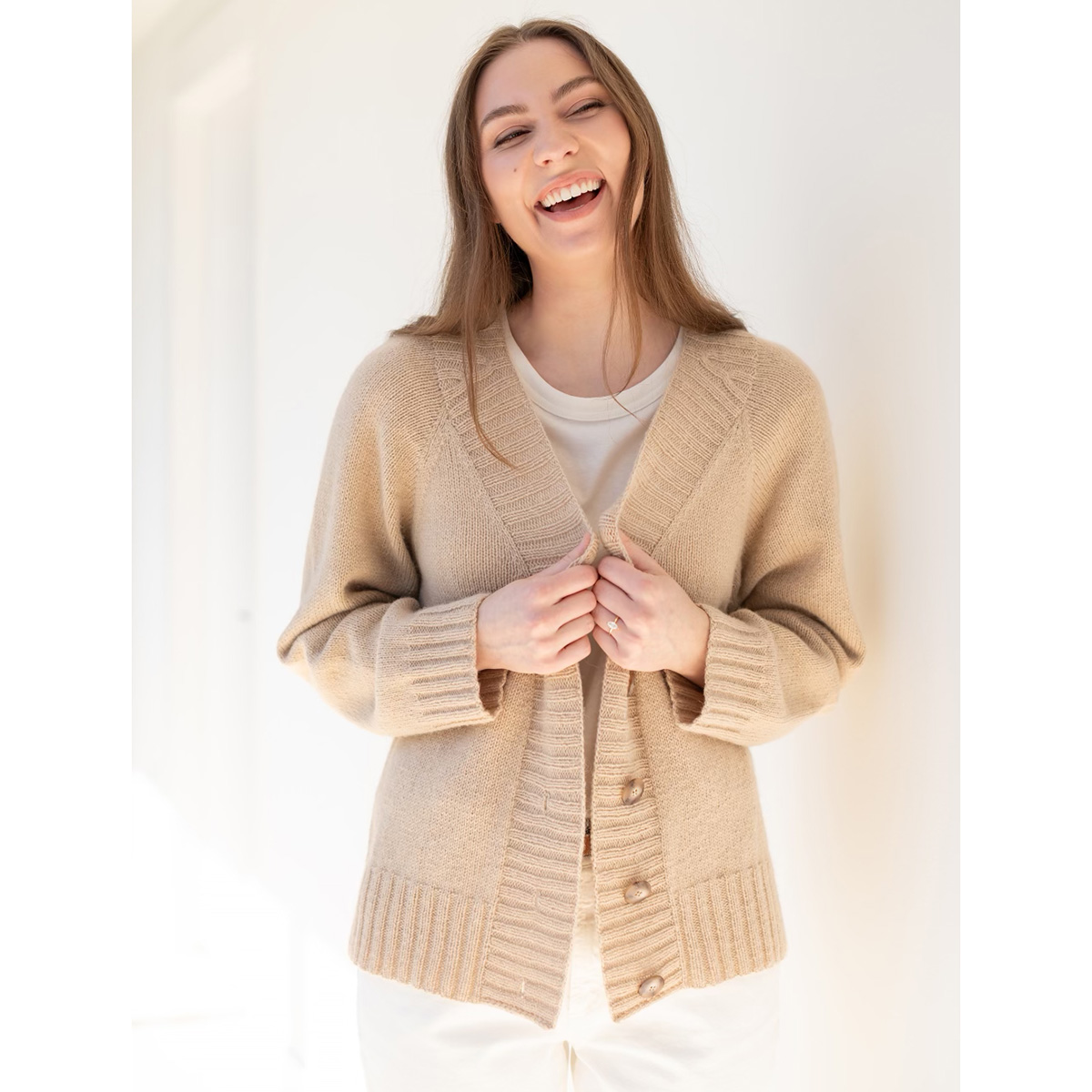 Cardigan is worked flat in pieces from the bottom up and sewn together. Neckband is picked up and worked flat after assembly. A circular needle is used to accommodate the large number of stitches.