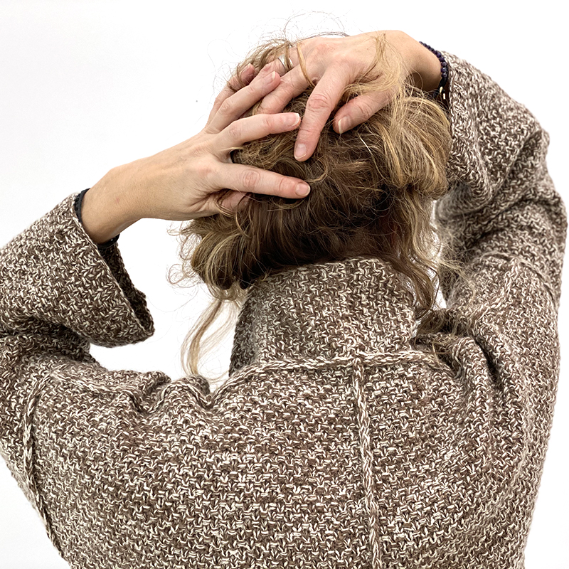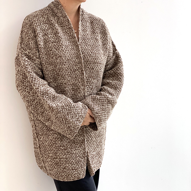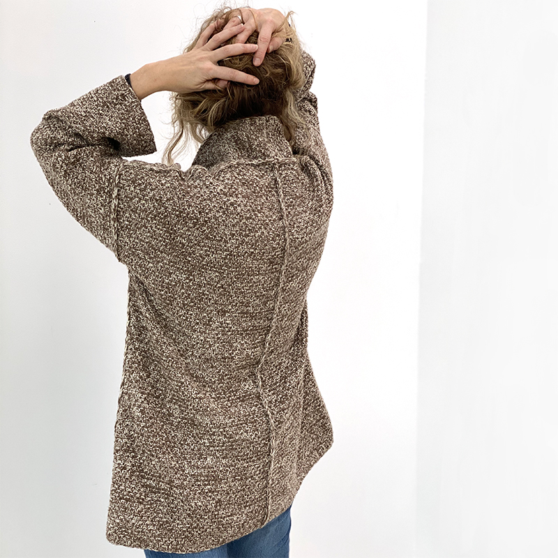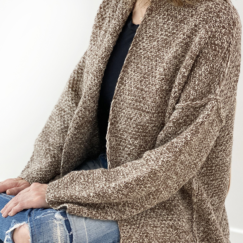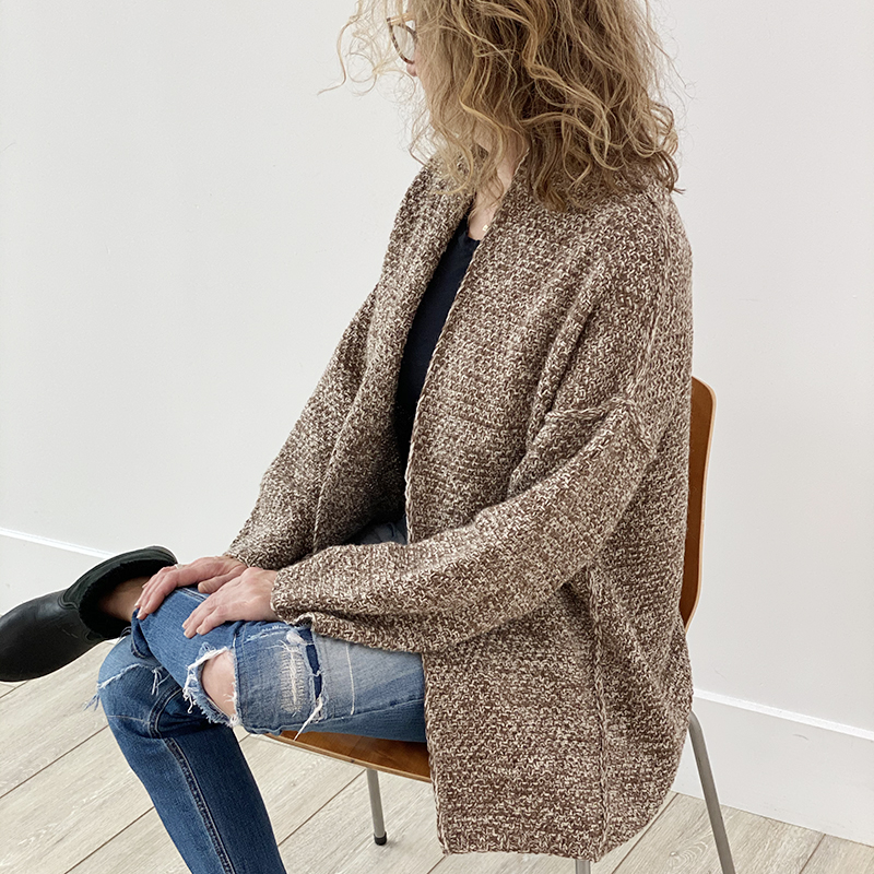 Dane is an oversized exposed-seam cardigan worked flat in pieces, from the bottom up. Pieces are sewn together with seams exposed on the right side; but since the fabric is reversible, Dane can also be worn with seams turned to the inside.