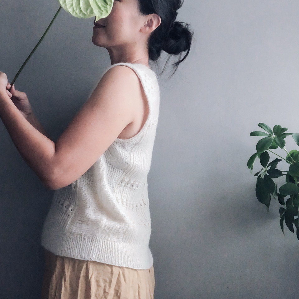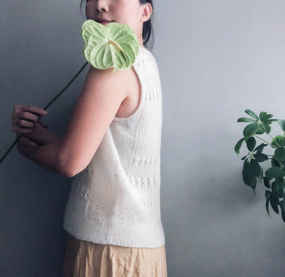 Dawa is a seamless slipover with ribbing and lace patterns on the front and back. Knitted top-down and beginning with a cable panel across the shoulders on the back, the front and back are worked flat off the edges of this cable panel, then joined with sideway-knitted panels with armhole shaping. The lace weight yarn is held double for the most part of the slipover, which gives good stitch definition to the cables and ribbing. Highlighting the lightness of lace yarn, side panels are knitted in a single strand to create a slightly sheer fabric for contrast and to make the slipover a light layering piece.