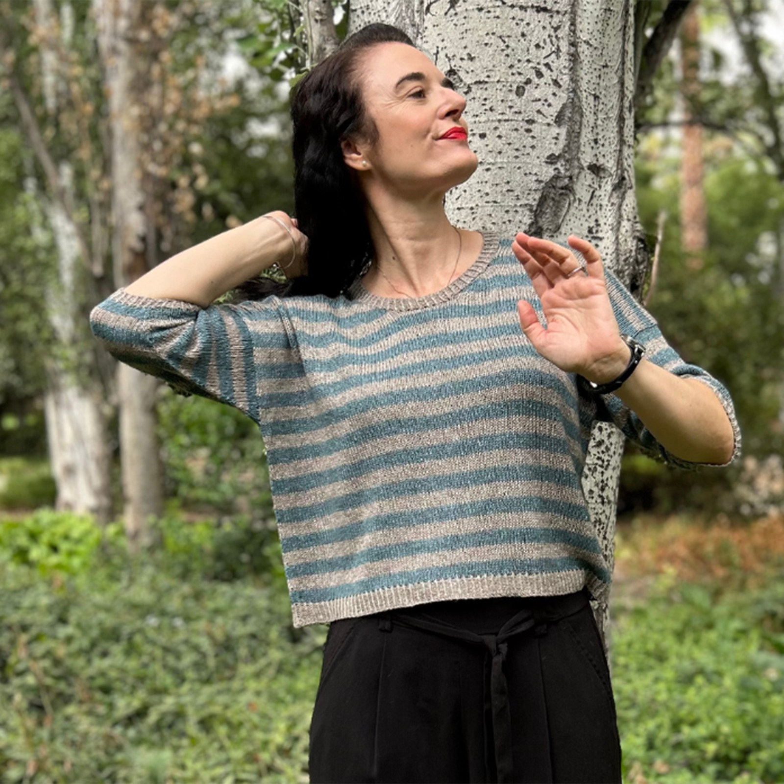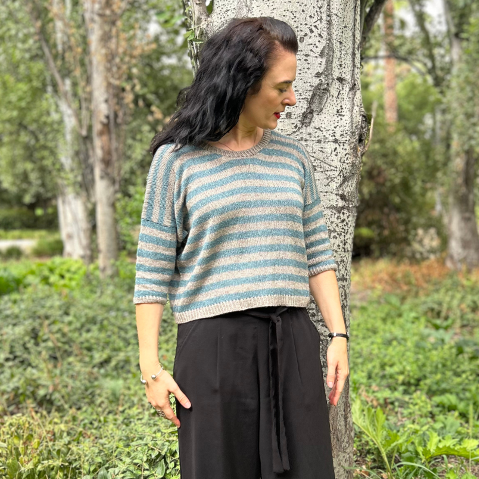 Equinoccio is a T-shirt designed for those days when summer is waning and autumn is beginning to show, when the mornings are fresh, but there is still a golden light in the afternoon. The stripes alternate shades of colour like day and night, while the batwing sleeves offer comfort for the change in climate.
