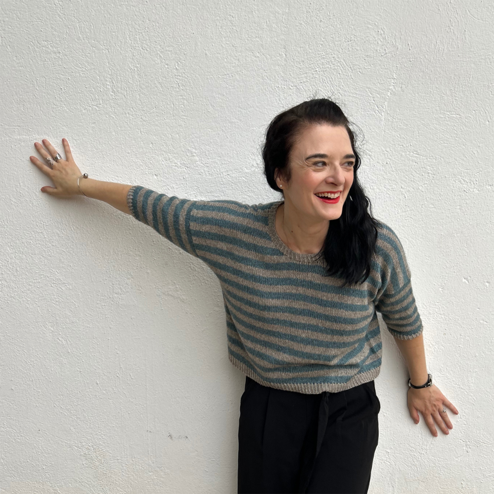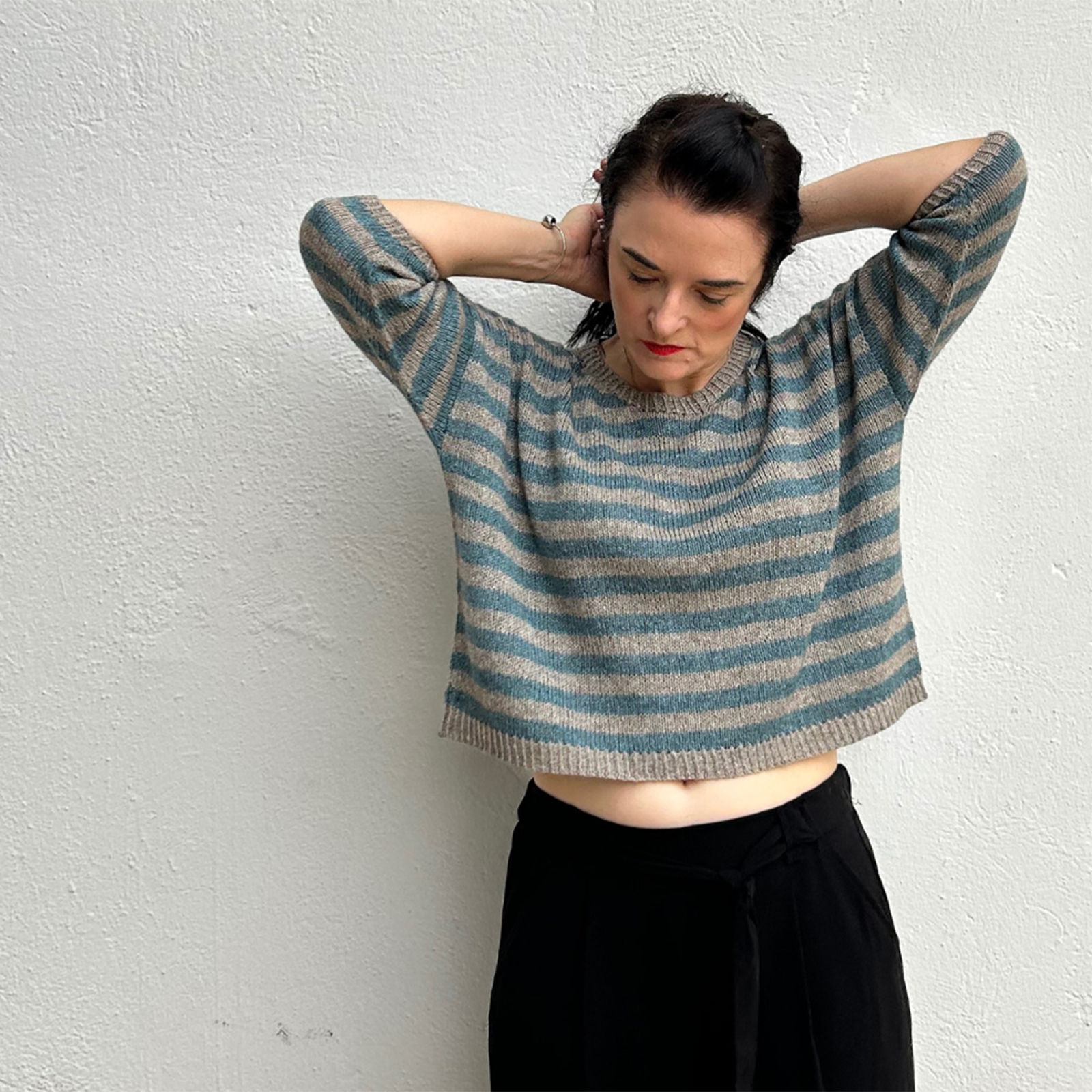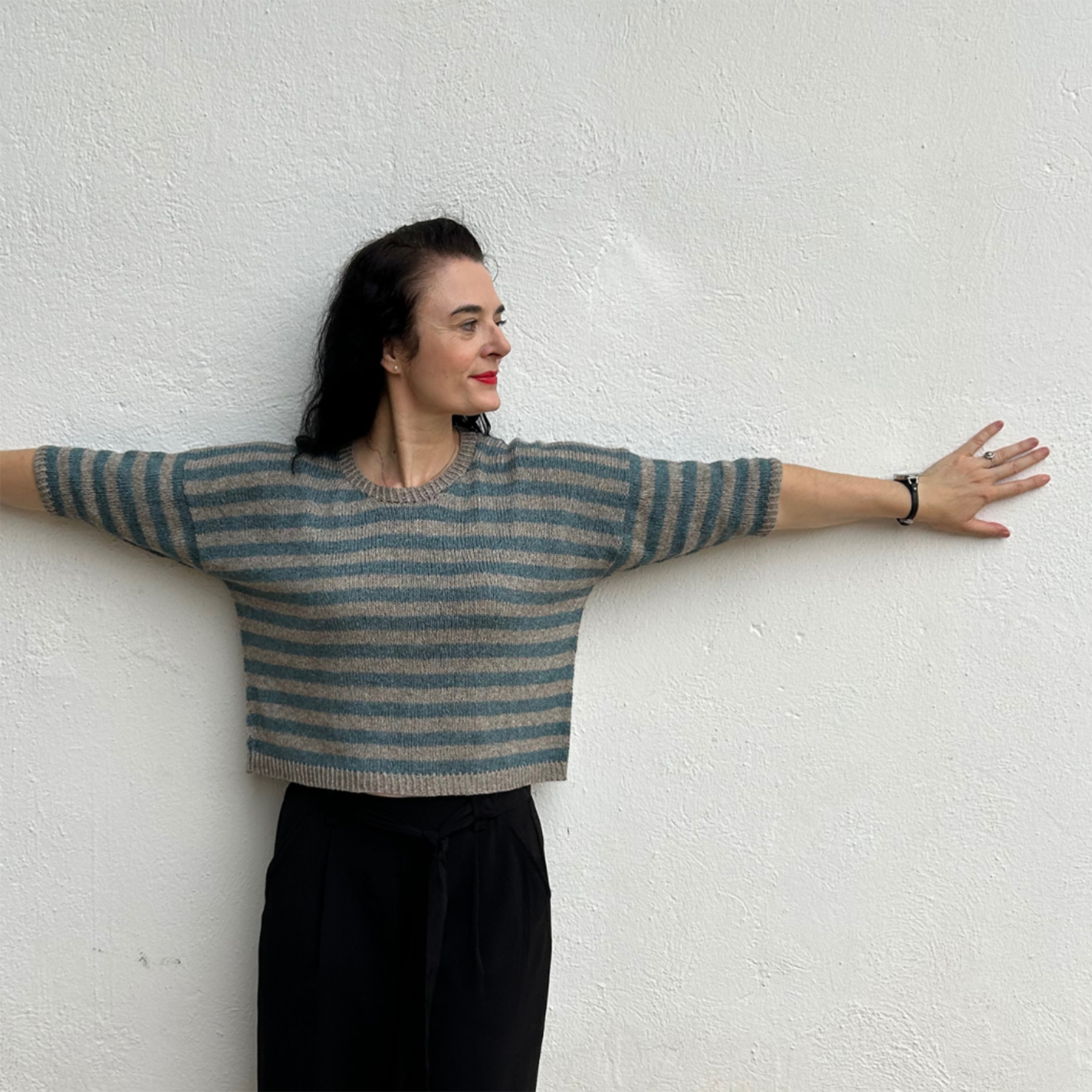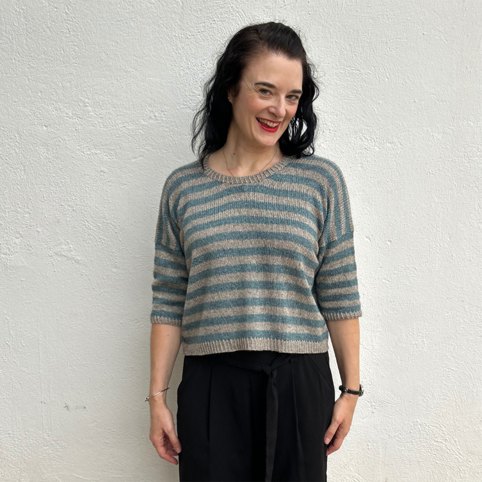 The shirt is worked top-down seamlessly. We begin at the back with a provisional cast-on and work flat in the stripe pattern down to the underarm. At which point, the back stitches are put on hold while we pick up stitches from the provisional cast-on to work the fronts of the shoulders, shaping the neckline at the same time. At the underarm, the front stitches are joined to the back stitches, and we continue working the body in the round. Afterwards, we pick up stitches around the armholes to shape the batwing sleeves, working decreases every 3 rounds. Finally, we pick up stitches around the neck to work a ribbed edging to finish the garment.