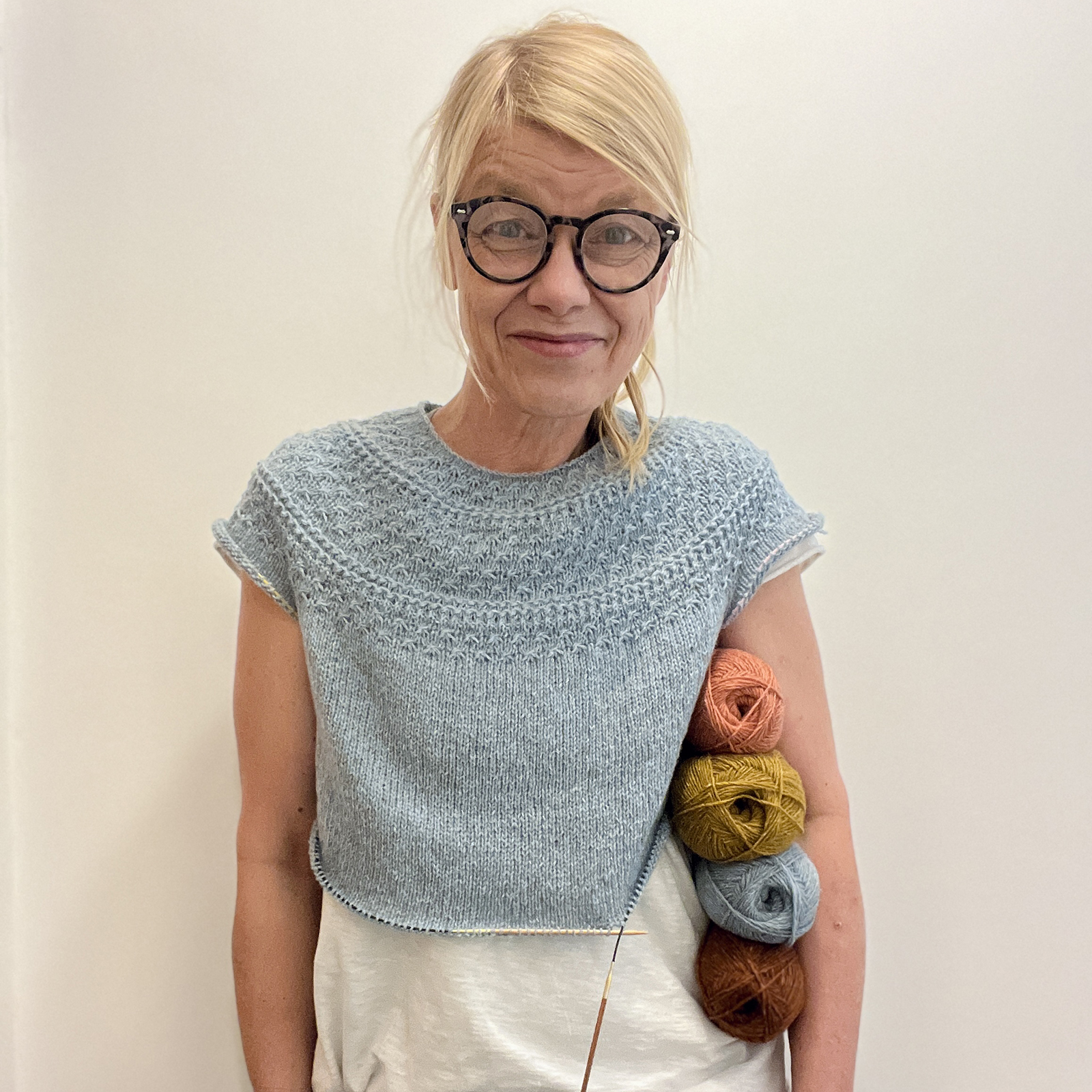 Fiorellino is worked seamlessly from the top down. Starting with the neck shaping, short rows are worked back and forth to create a higher back neck. The yoke is then worked in the round to sleeve separation. Increases are worked into the textured part of the yoke, followed by raglan increases for the lower part of the yoke. Sleeve stitches are placed on hold to work the body top down. The short sleeves are worked top down in rounds to the cuffs. No finishing required.