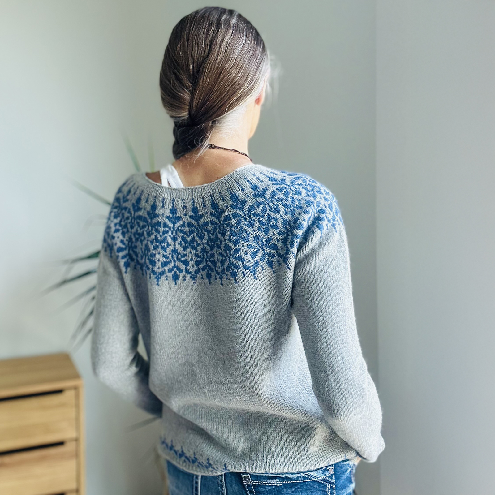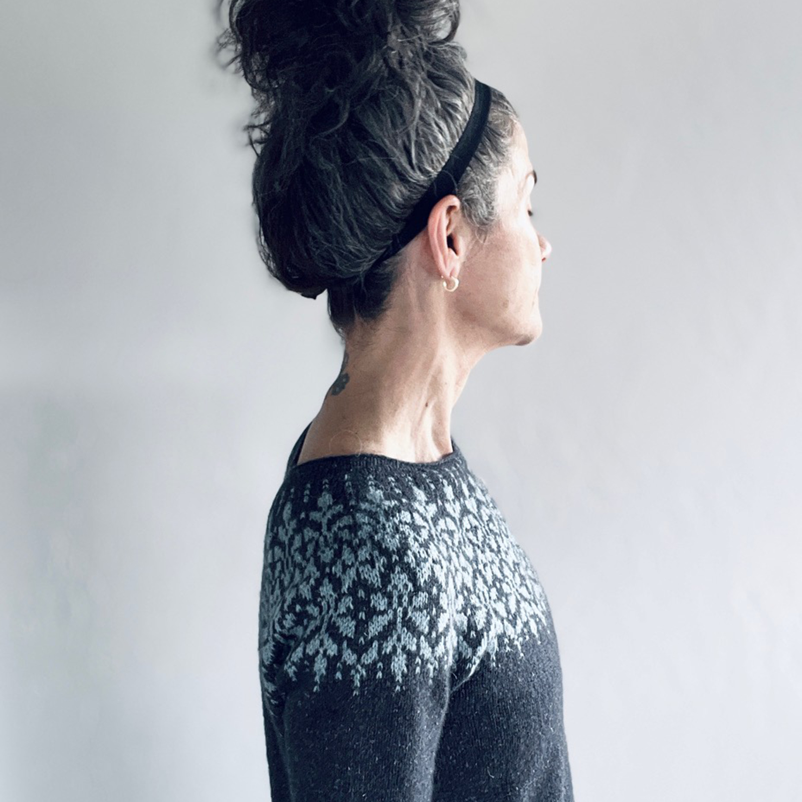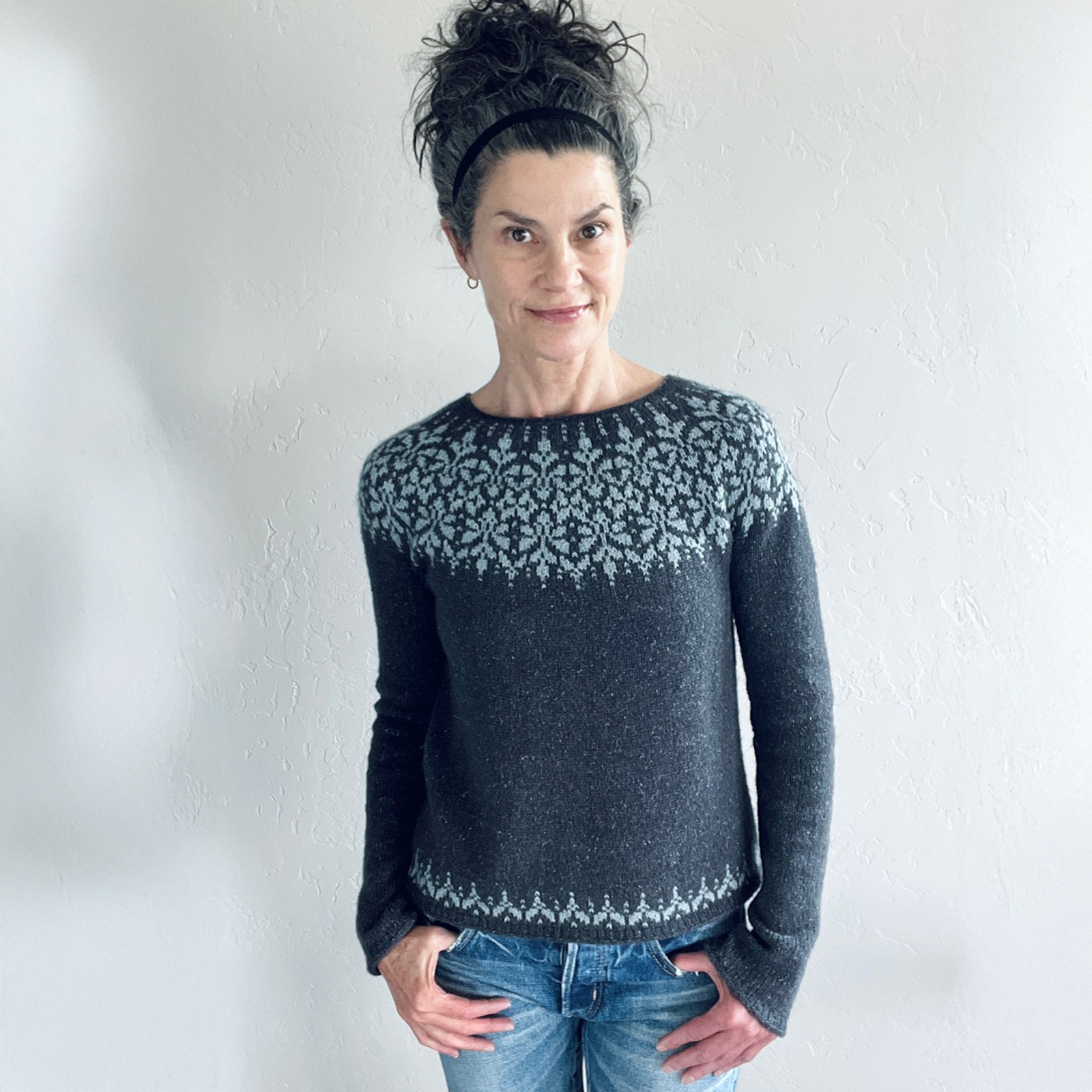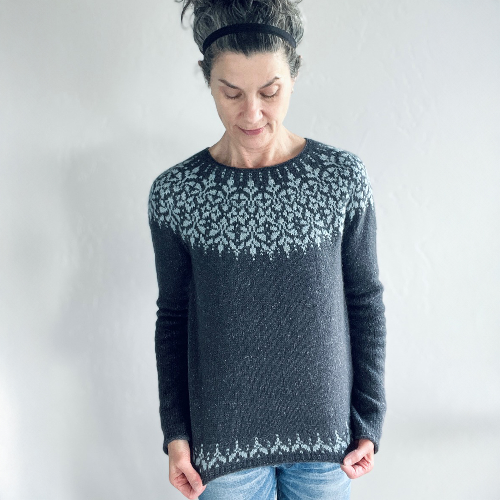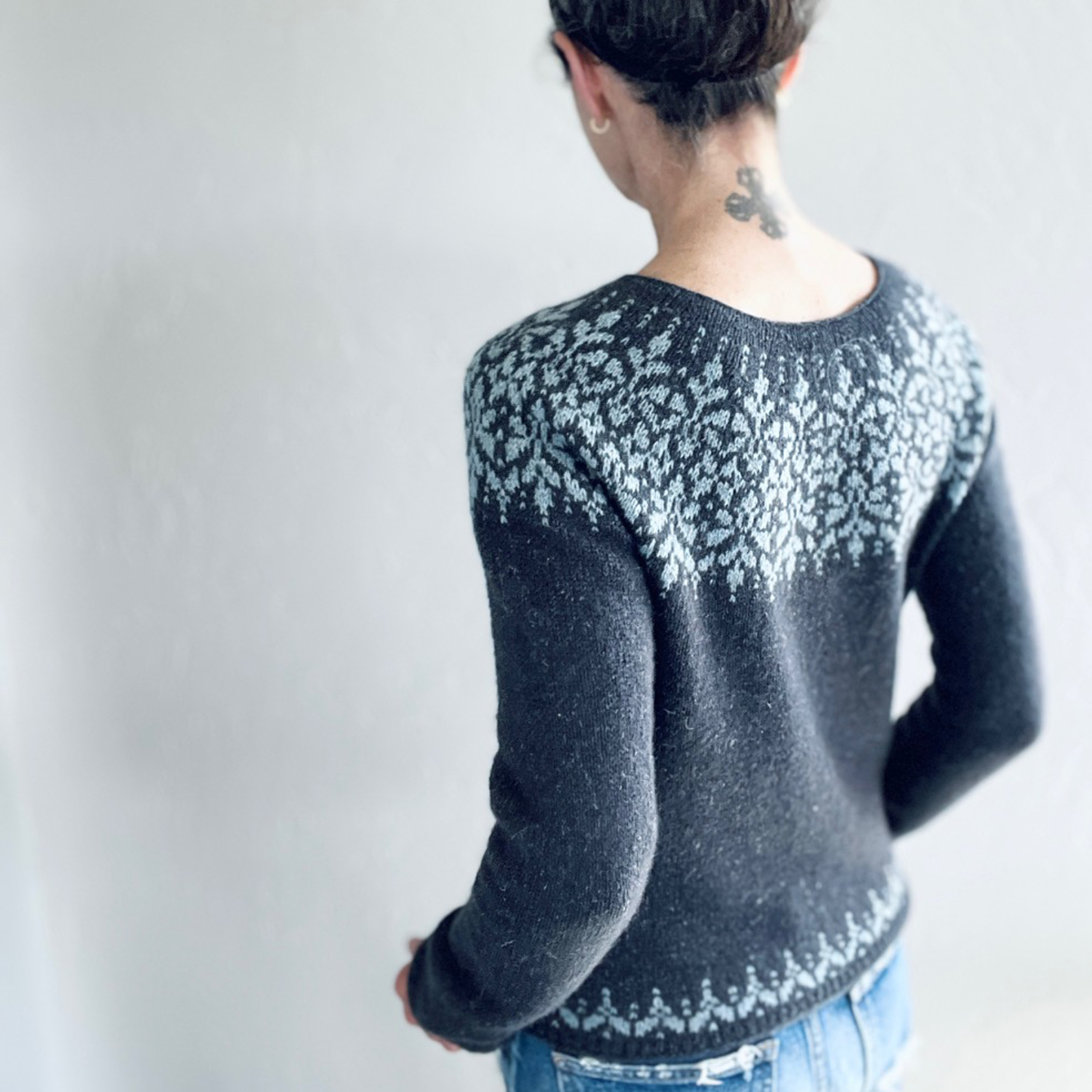 Giardino is worked seamlessly from the top down. First some short rows are worked back and forth to create a higher back neck and then the yoke is worked in the round with beautiful ornamental colorwork to sleeve separation. The body is then worked in rounds down to the colorwork and hem. Sleeves are worked top down to the cuffs last. No finishing required.