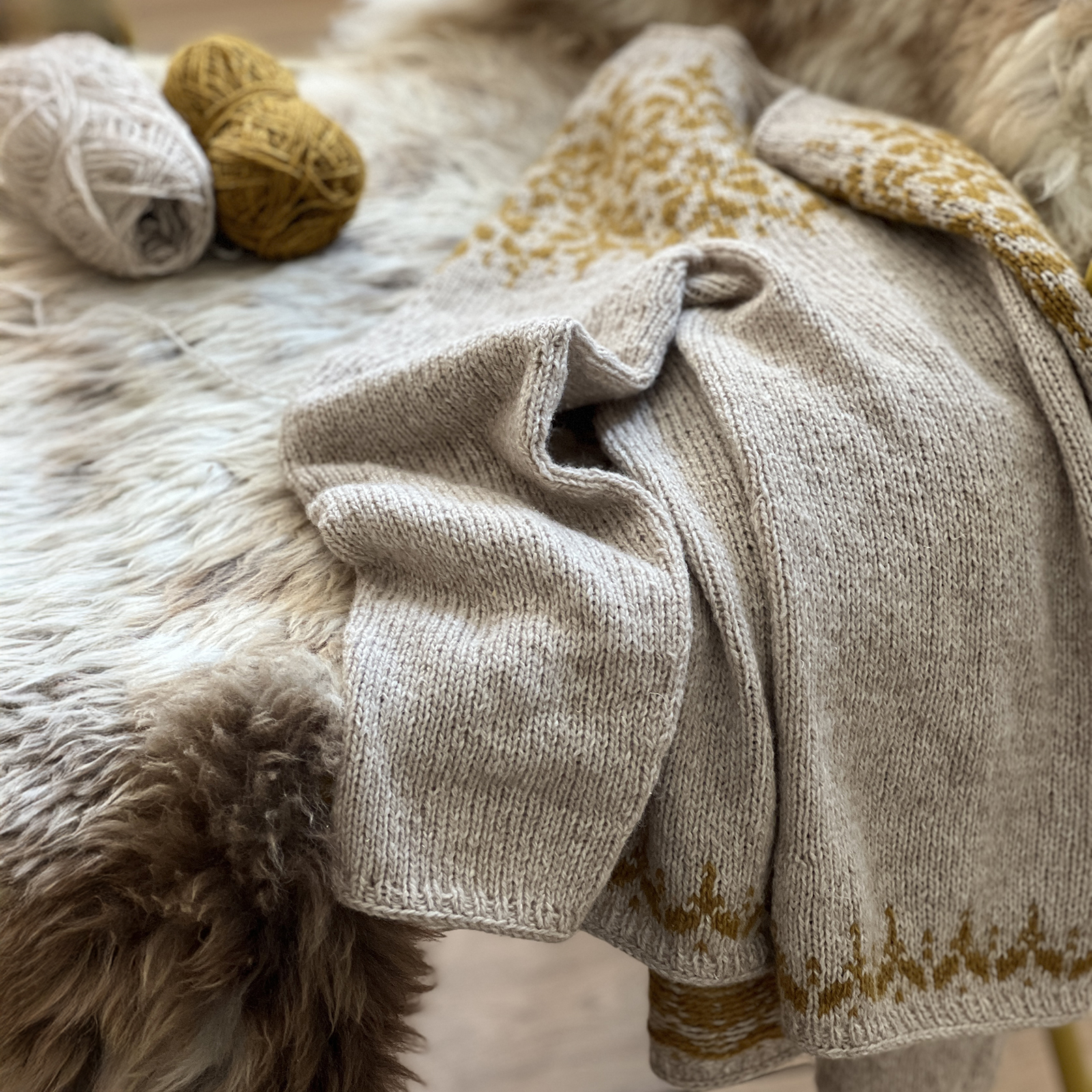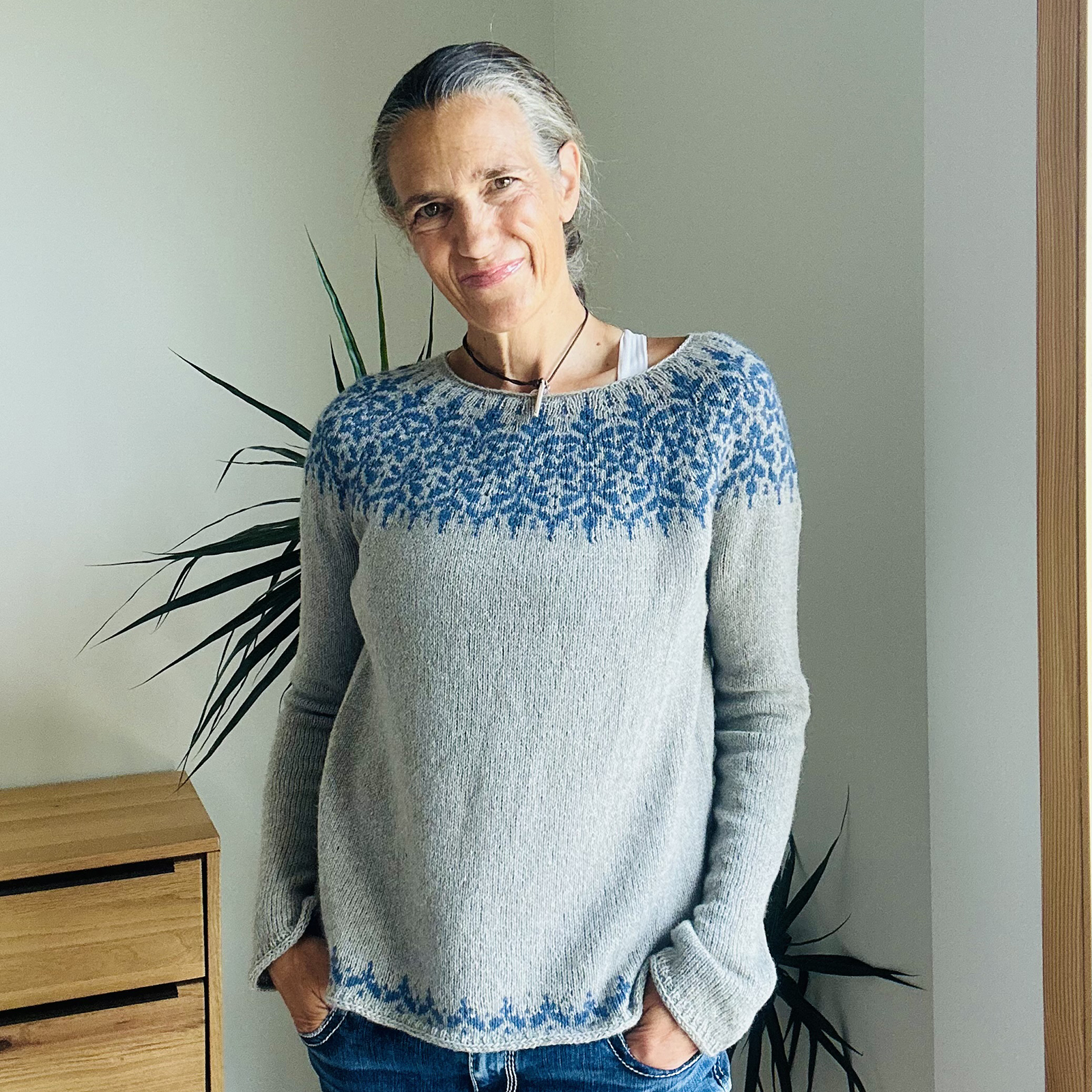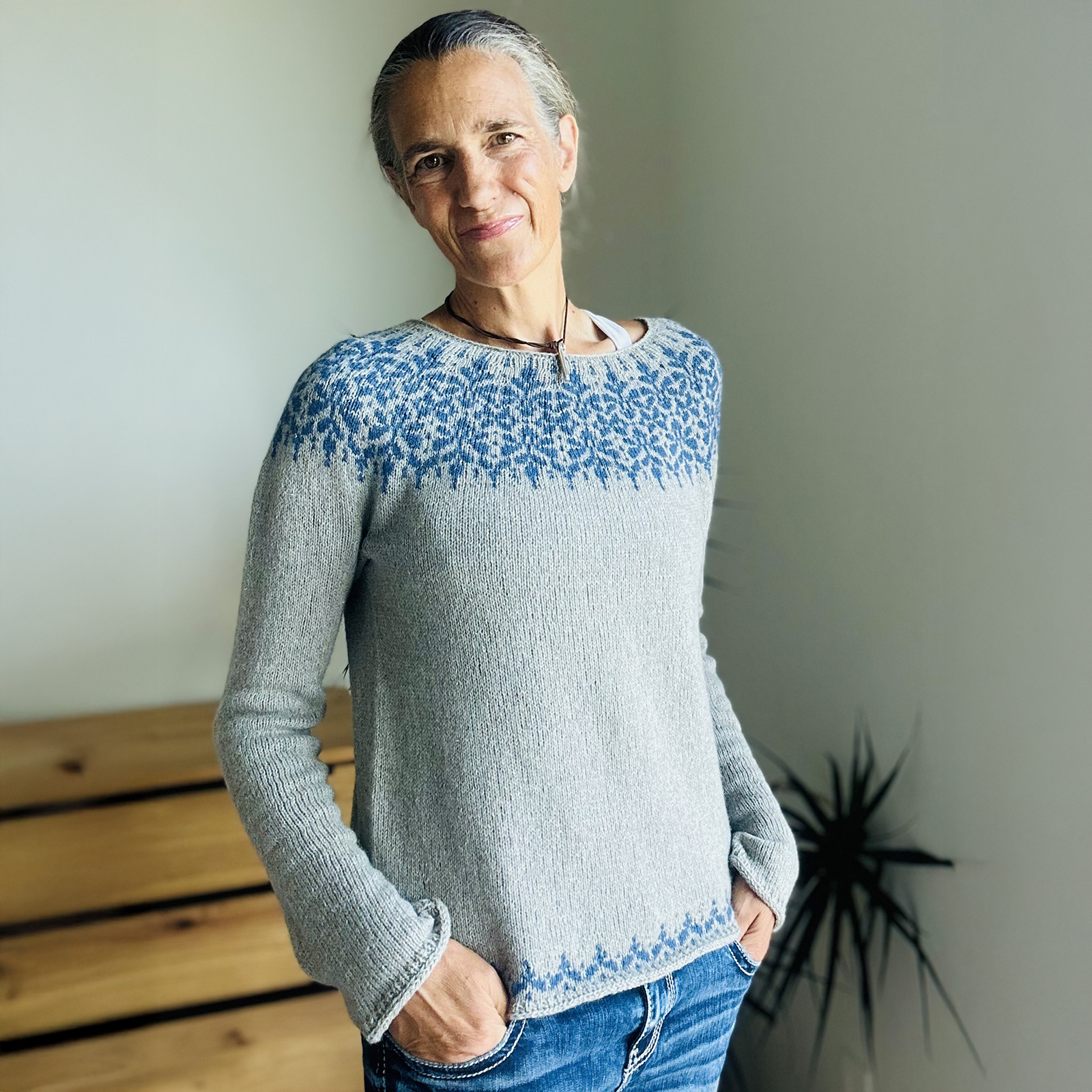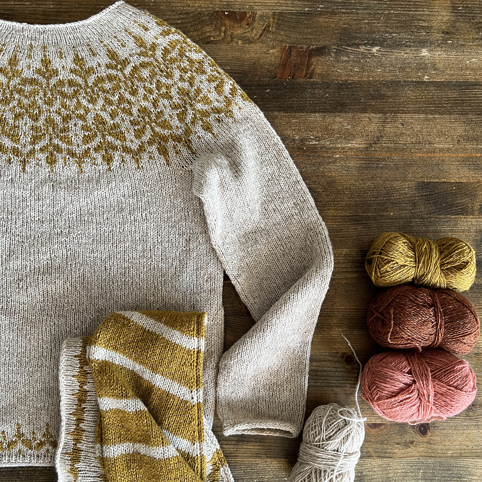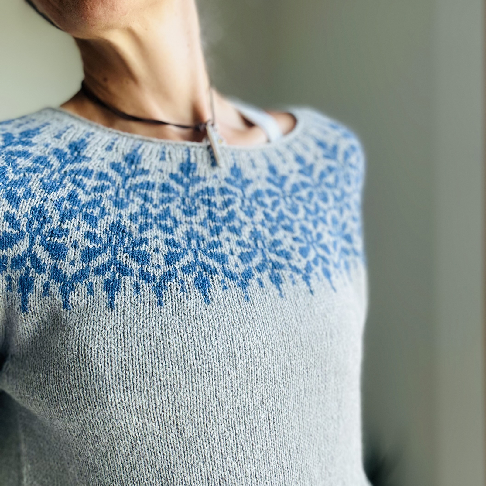 Giardino is worked seamlessly from the top down. First some short rows are worked back and forth to create a higher back neck and then the yoke is worked in the round with beautiful ornamental colorwork to sleeve separation. The body is then worked in rounds down to the colorwork and hem. Sleeves are worked top down to the cuffs last. No finishing required.