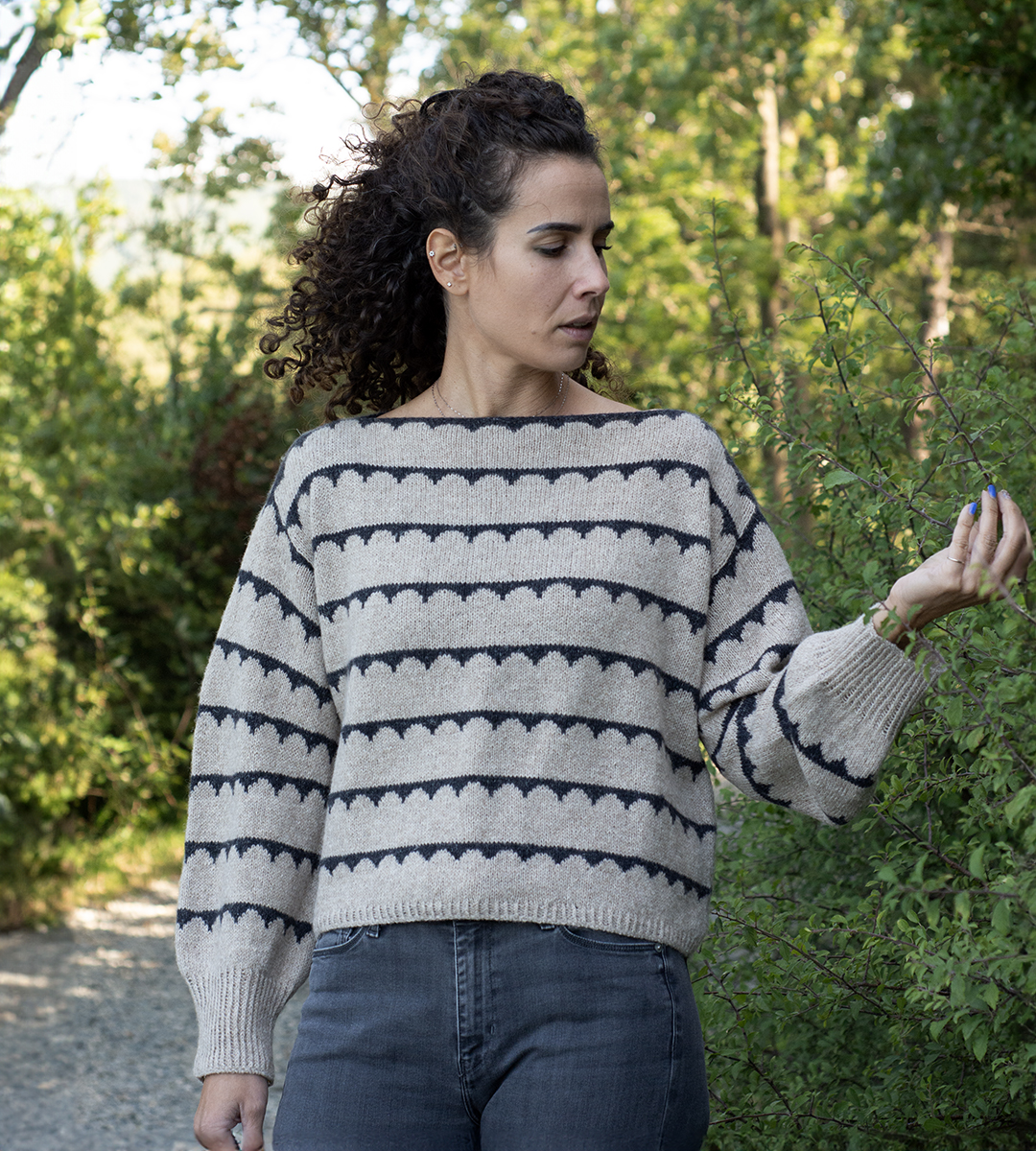 GRAPE TEE is worked in stockinette stitch with an elegant slipped stitch pattern. The slipped stitch pattern is straight-forward. In this project, what looks like a stranded pattern is knitted with one color at a time, lowering the difficulty level.