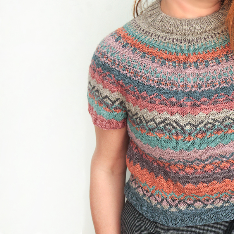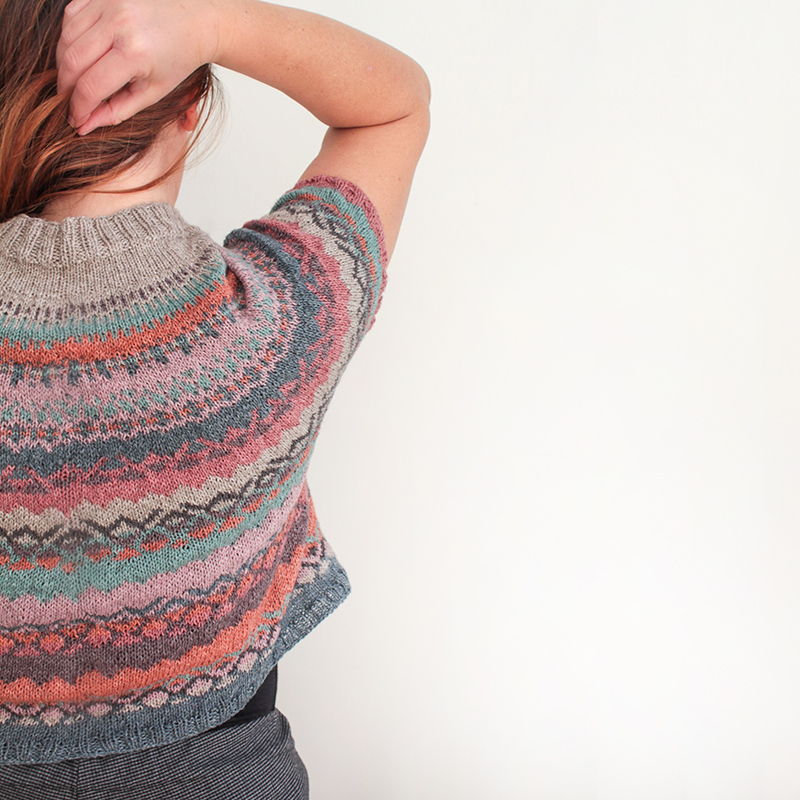 Iro s a short-sleeved crop worked from the top-down with circular needles. Gradual increases are made in the yoke up to the sleeves that will be put on hold onto holder or scrap yarn and then resumed later. This way there will be no seams. This pattern features stranded knitting technique. The yoke is made up of a single chart that contains the increases. A sequence of very simple bicolored motifs is distributed in yoke, body and sleeves. We have chosen to use all the colors of the wonderful Kupa yarn, the eight shades of color as well as being beautiful are all well together and in any way they are combined they create a pleasant chromatic balance.