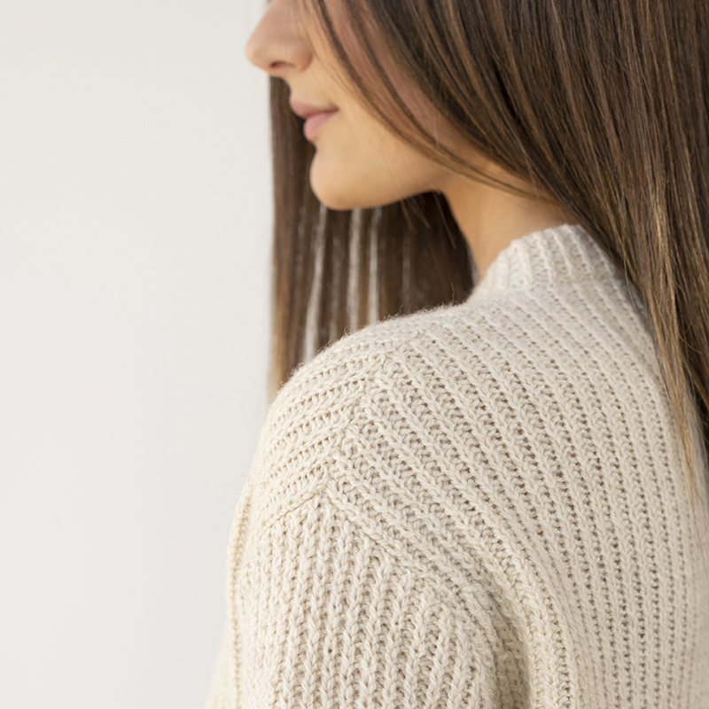 A striking pullover worked in an all-over half-twisted rib stitch with minimal shaping to create an understated and modern silhouette. (This also allows you to adjust the length of the pullover easily to suit your taste.)