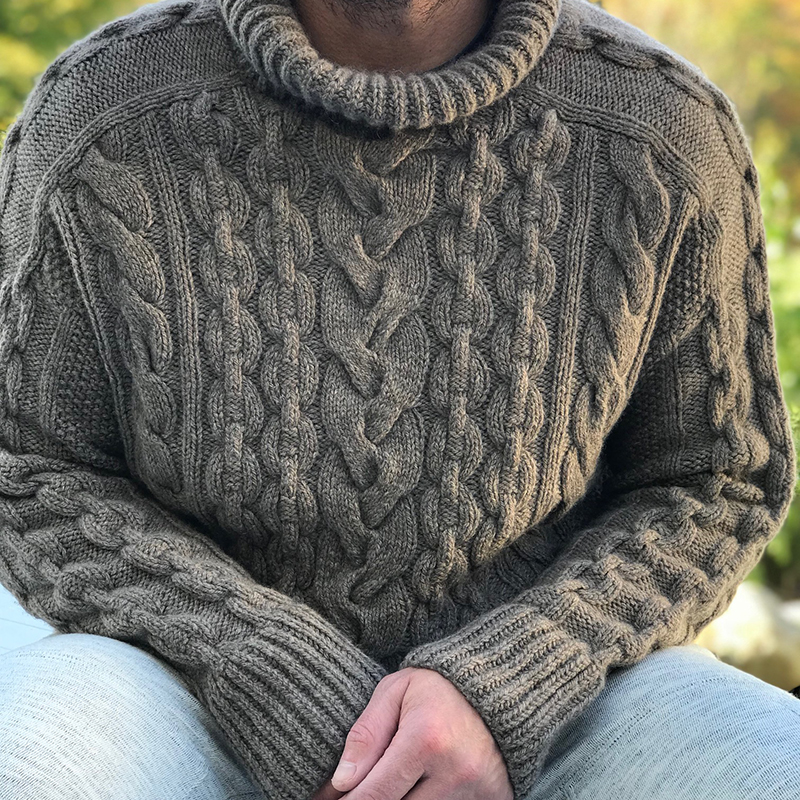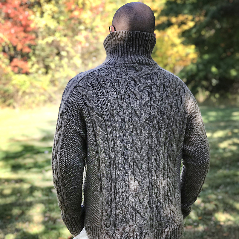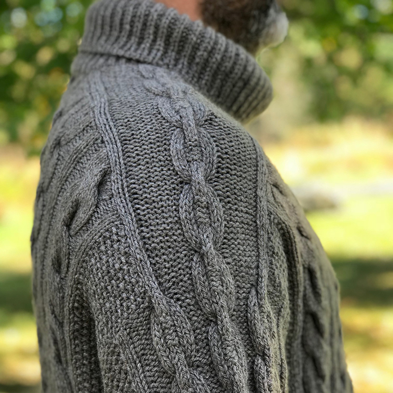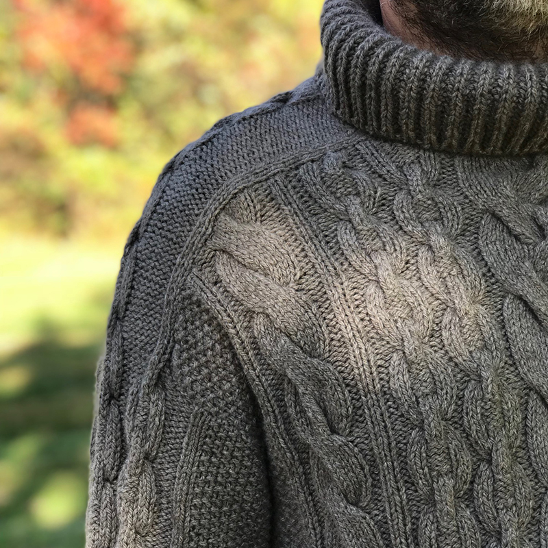 This design is full of delightful details that will keep you interested every step of the way. The turtleneck has an all over cable pattern with garter and seed stitch backgrounds. A saddle shoulder construction makes this sweater infinitely cozy to pull on and wear. The tubular cast on and bind off allows the squishy fisherman’s rib to seamlessly flow off the edge of the garment. Knit in cozy worsted weight mYak baby yak Medium, this sweater might be the warmest and softest thing in the wardrobe.