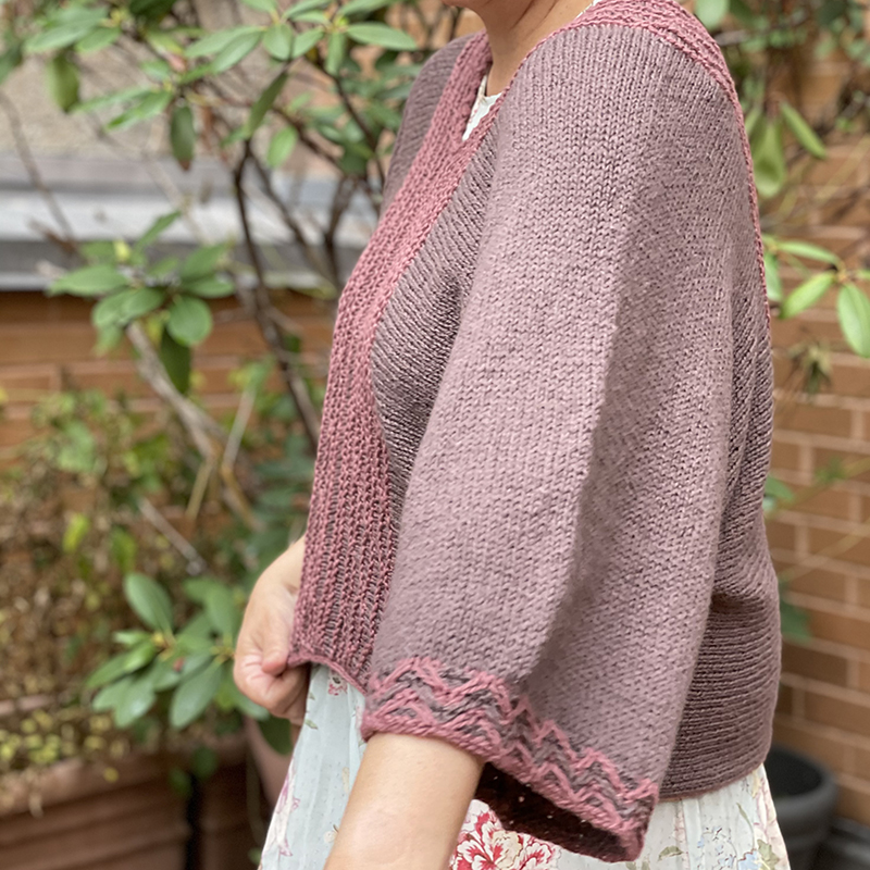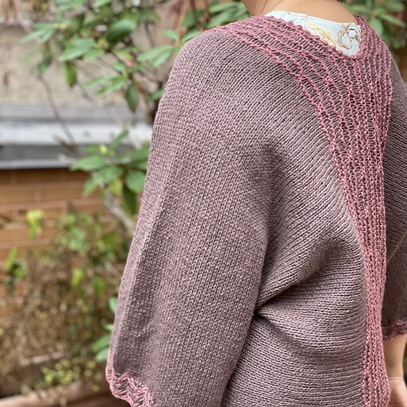 Kurumi is poncho-like oversized pullover with dolman sleeves. It is warm and relaxed fit and intended to be worn as layering piece. Starting from the cuff, to the sleeve, and to the body, left and right symmetrical parts are knitted sideways and later joined at the center line front and back. Neckline is completed with Bobble bind-off. At last finish the piece by seaming from the cuffs to the side and I-cord bind-off the hem.
