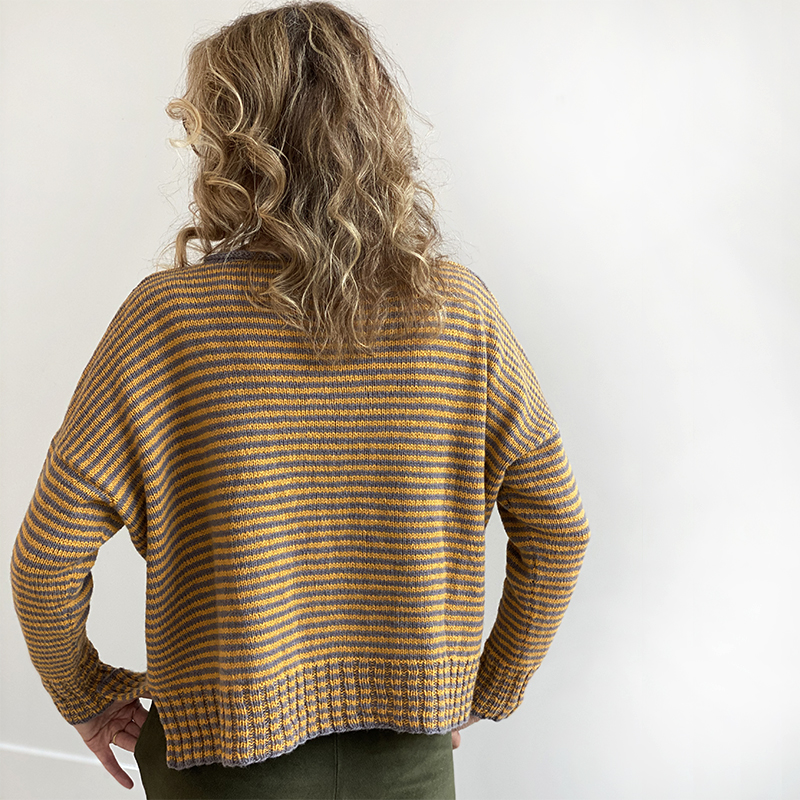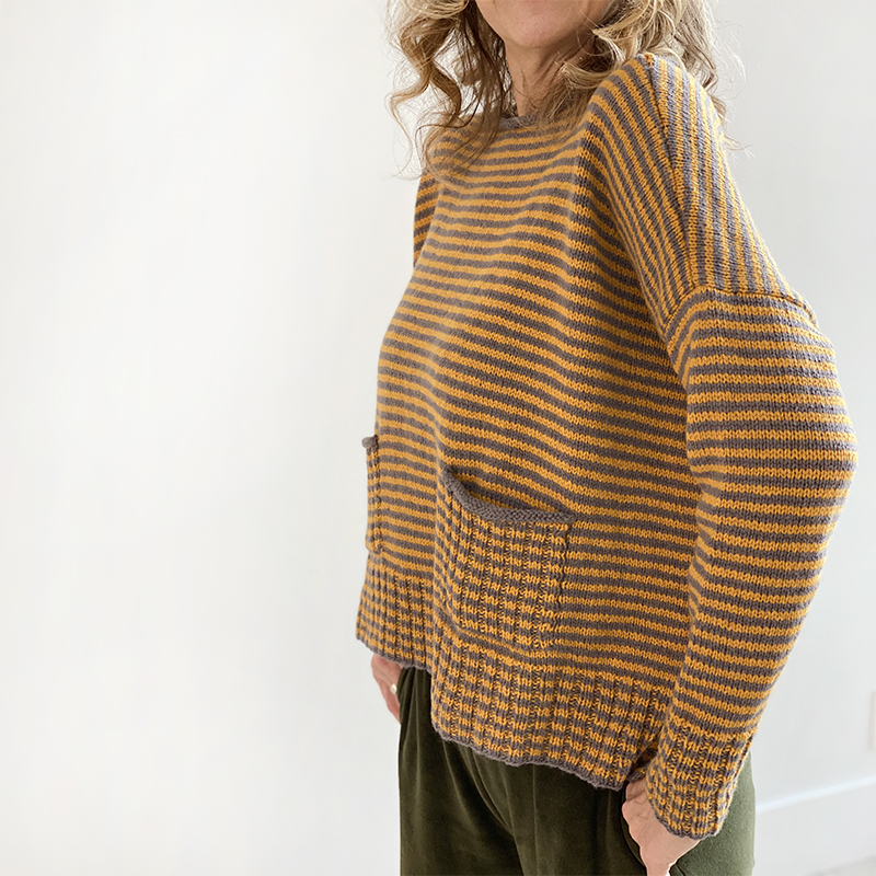 This timeless, oversized knitted sweater is worked with two colors of a DK weight. A boxy shape and ribbed pockets create a casual, contemporary feel.