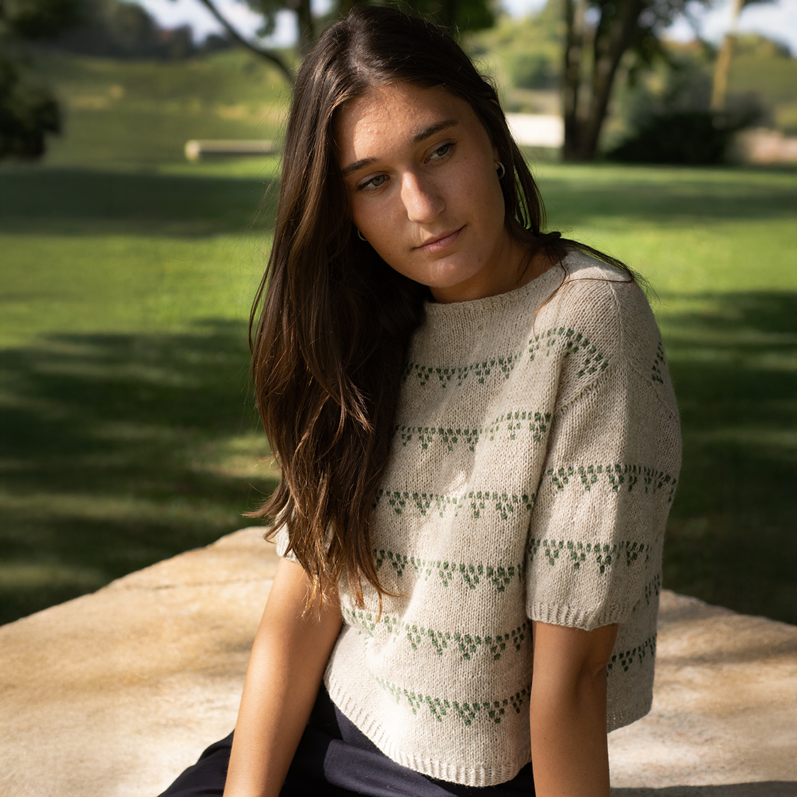 MONO SWEATER is a roomy sweater in stockinette stitch with elegant dotted lines along the shoulders, armholes, and neckline.