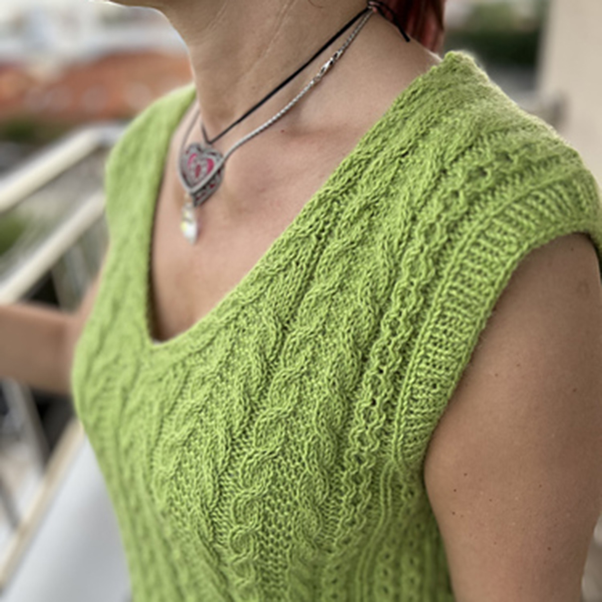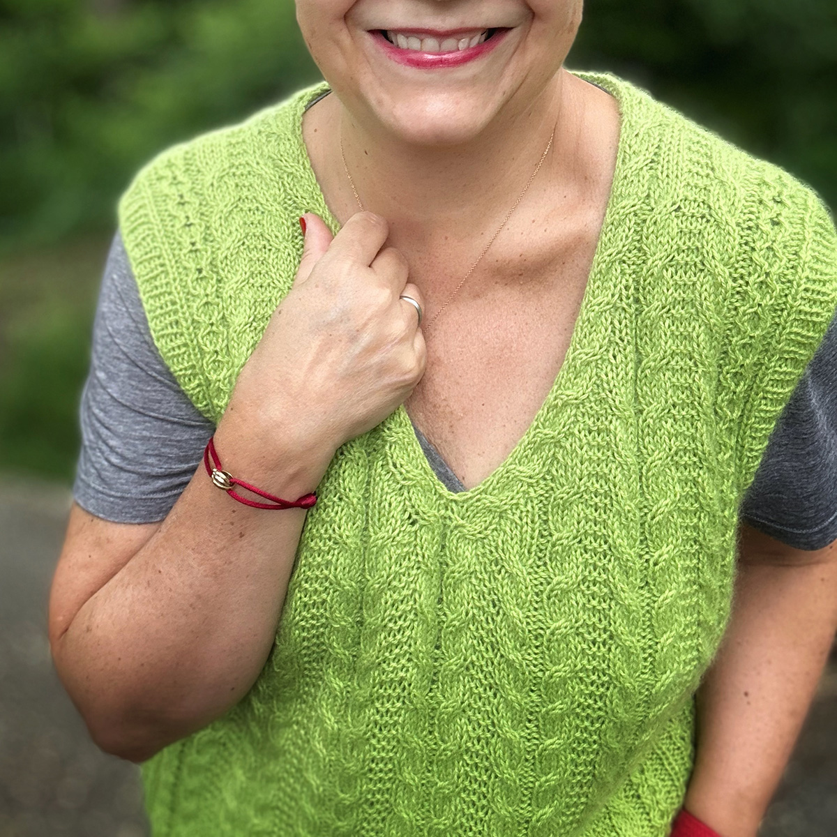 The Oban Vest features an even number of cable repeats across front and back, allowing for a perfectly centered V-neck. In addition to shoulder modification, the pattern also has notes on altering length from hem or customizing your fit around the body, as well as changing the upper body depth and armhole circumference.