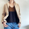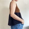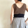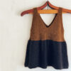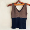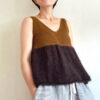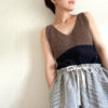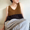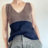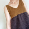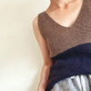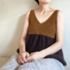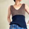 Quon is a ribbed tank top knitted top-down. Begin knitting each back shoulder and join the pieces to make the upper back. Then pick up stitches from the shoulder cast-on edge to knit each left and right front, and finally join the front parts to the back to start round knitting. Once underarm reaches specified length, select Style A (straight line) or Style B (flared line) then work to the hem accordingly. At the color transition, Style A adds Knots stitch and continues ribbing to the hem; Style B adds horizontal chain stitch, while the CC in the original sample in Style B is knit in Mohair, you can still use our Baby Yak lace held double and obtain a similar flared shape
