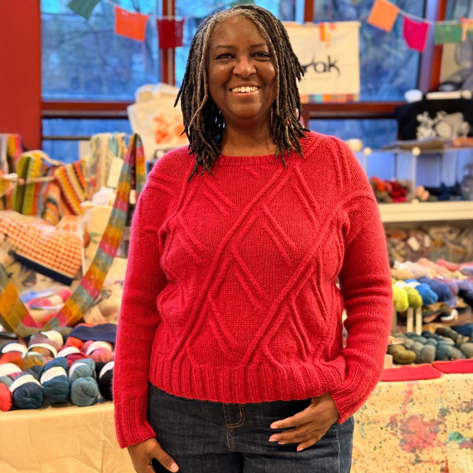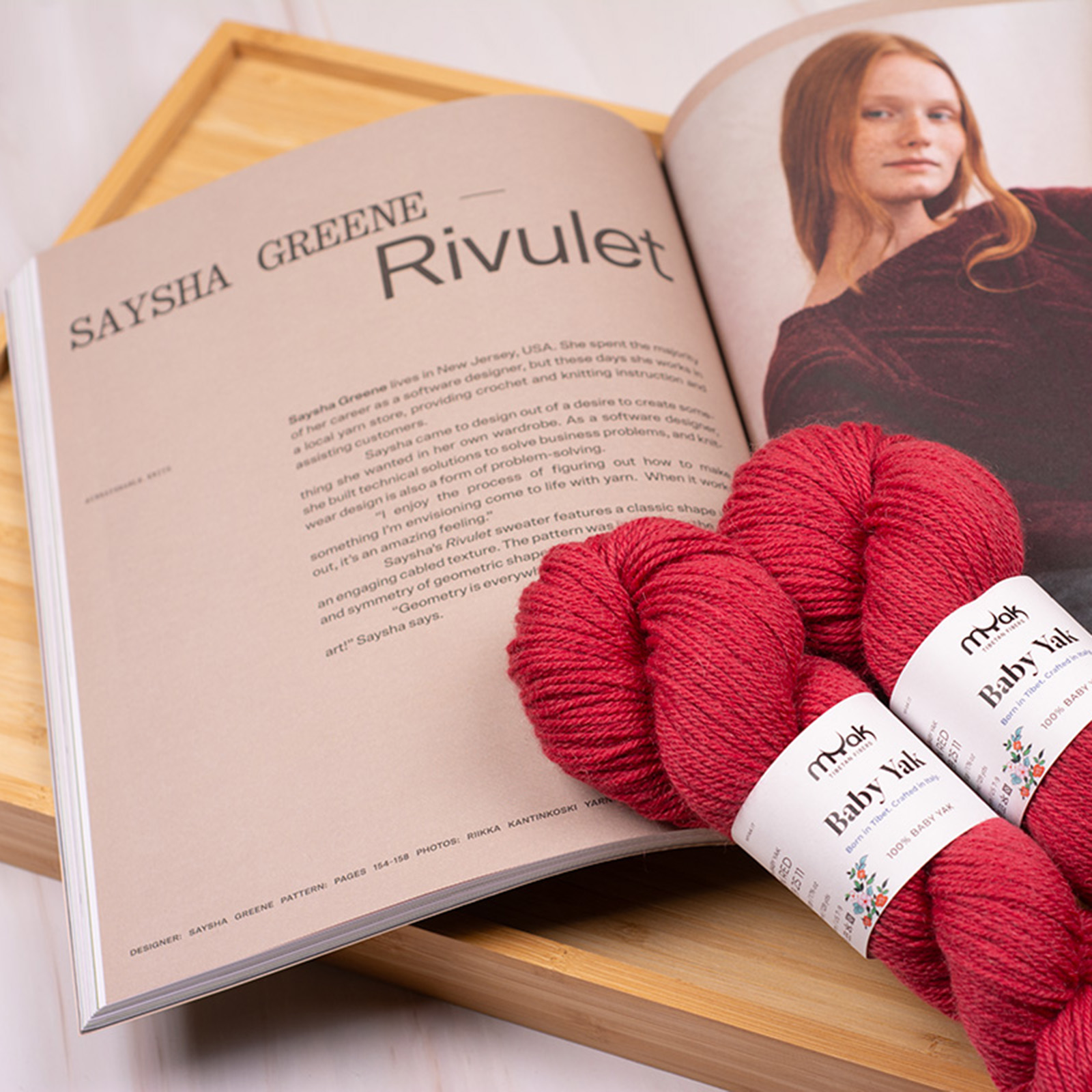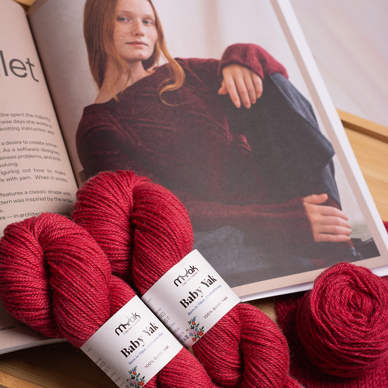 The sample is shown in Passion Red, but you can also create your own color combination by choosing your skeins from the Baby Yak Medium palette.