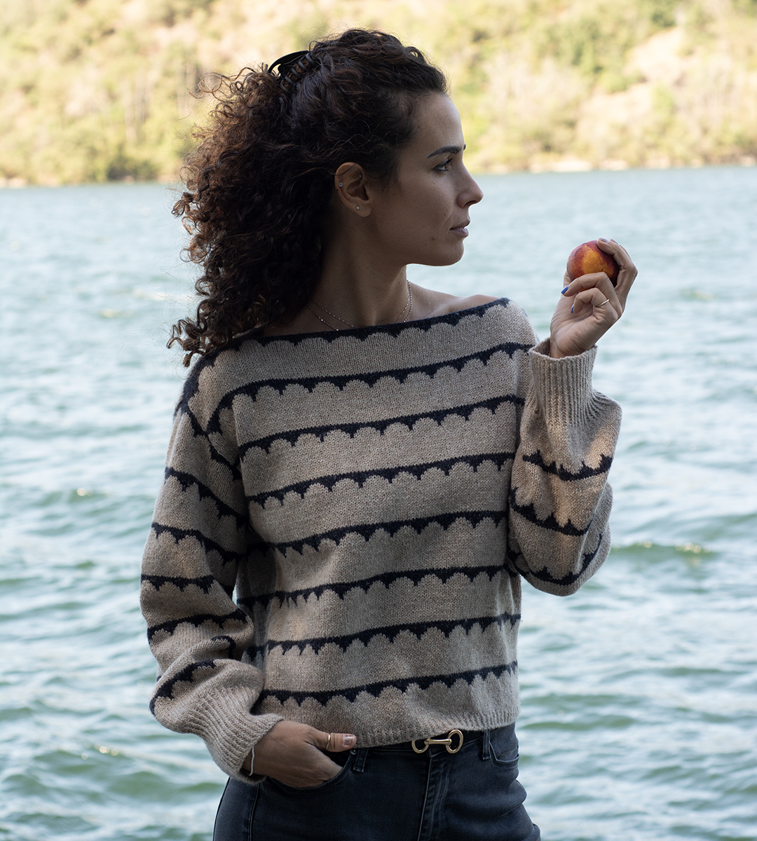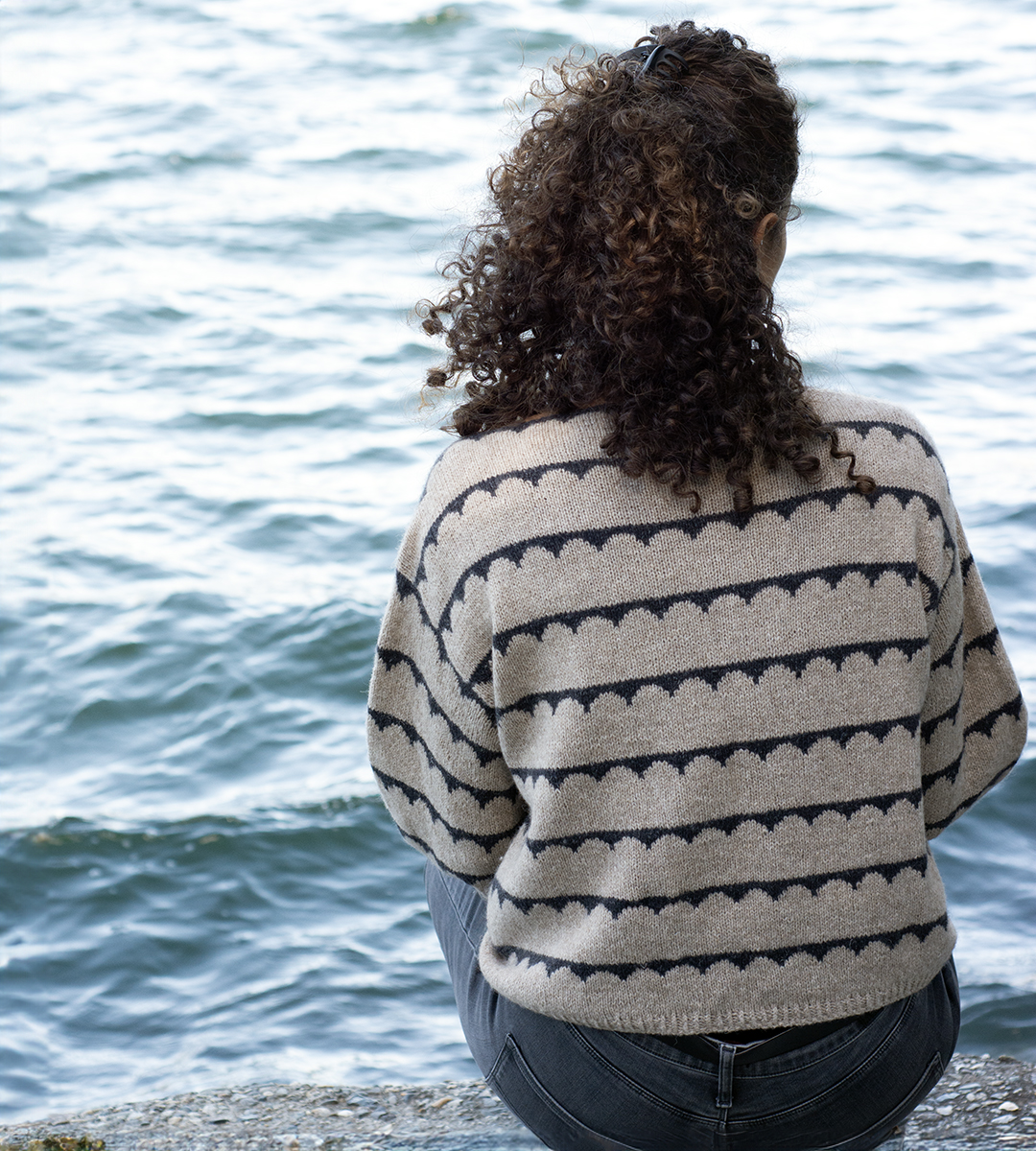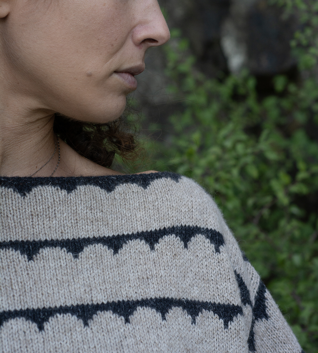 ROBINIA LIGHT is a soft and feminine sweater with an elegant pattern worked in stranded knitting. The sweater is worked from the top down. First, the back and front yoke are worked flat and afterward joined for the body worked in rounds. Stitches are picked up along the armholes, and the sleeves are worked down and finished with cuffs in twisted rib. The yoke and sleeves are shaped with short rows to create an excellent fit.