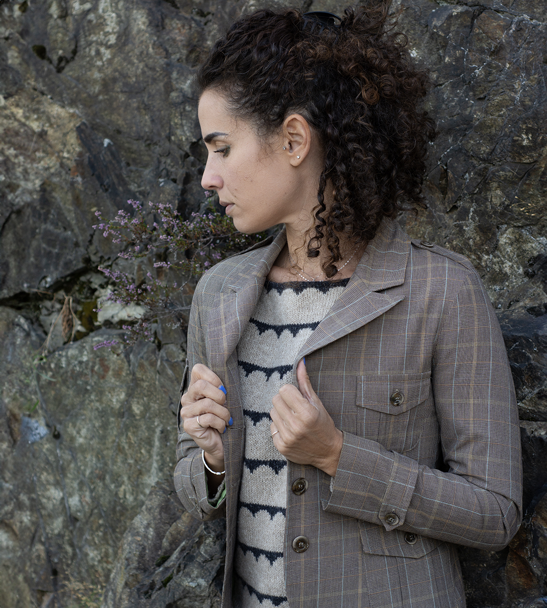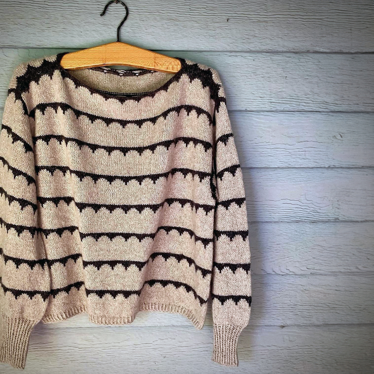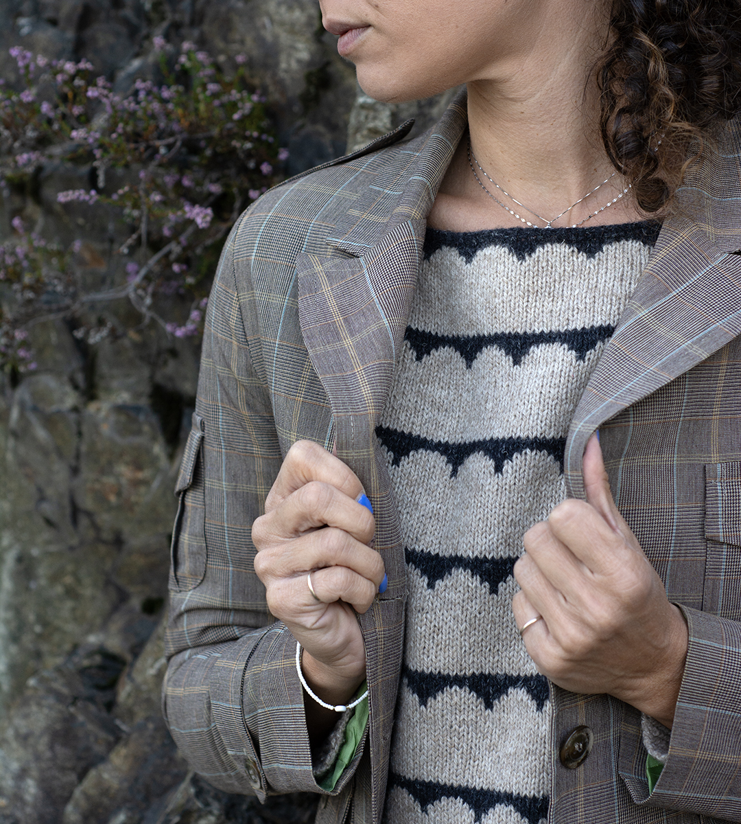 ROBINIA LIGHT is a soft and feminine sweater with an elegant pattern worked in stranded knitting. The sweater is worked from the top down. First, the back and front yoke are worked flat and afterward joined for the body worked in rounds. Stitches are picked up along the armholes, and the sleeves are worked down and finished with cuffs in twisted rib. The yoke and sleeves are shaped with short rows to create an excellent fit.