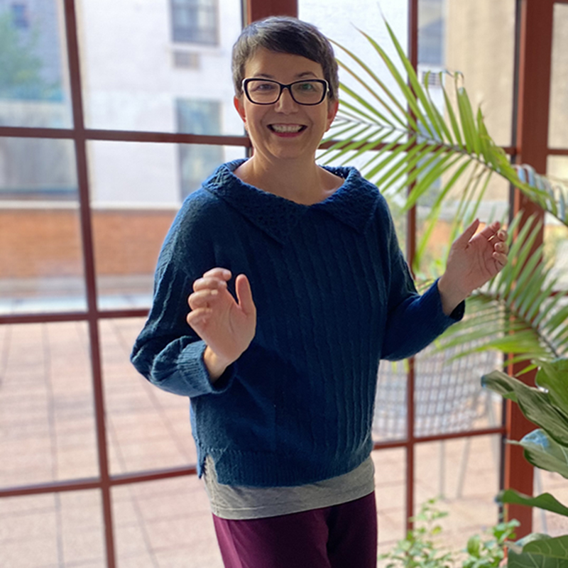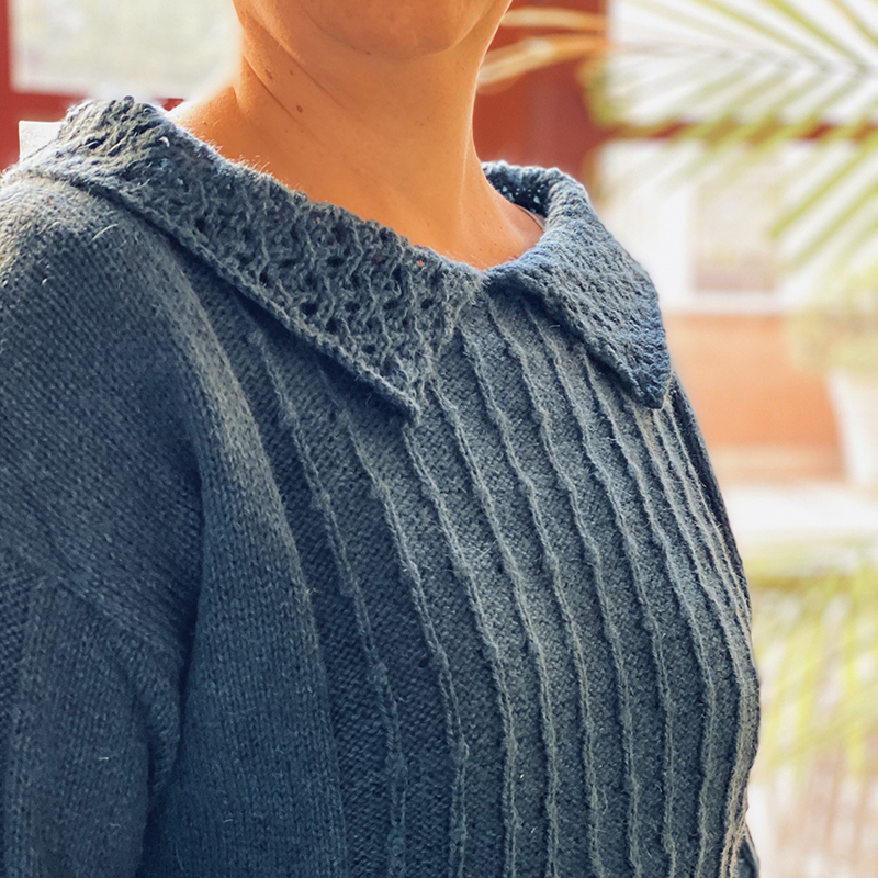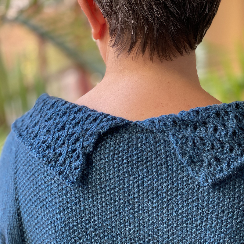 The Say Hello blouse is worked from the bottom hem to the underarm in the round, knitting the ‘Knobby stitch’ on the front, and the ‘Moss stitch’ panel on the back. The front and back are then worked separately. After joining the front and back at the shoulders, the stitches for the sleeves are picked up and worked top-down and in the round. The collar stitches are picked up from the neckline, and knitted flat. Recommended to be worn with 10–50 cm / 4–20” positive ease. (Rievive)