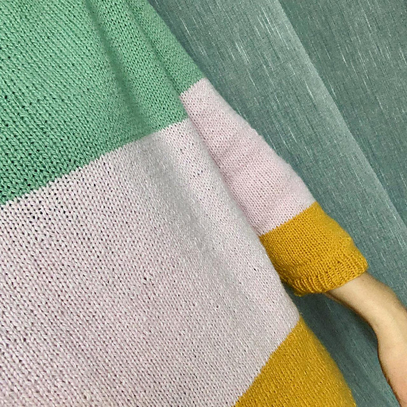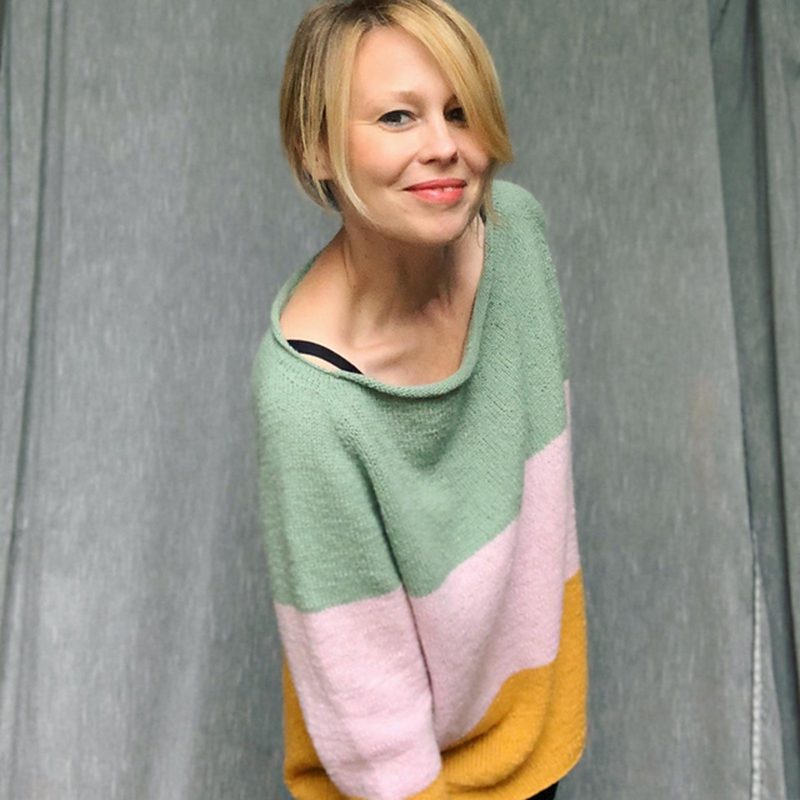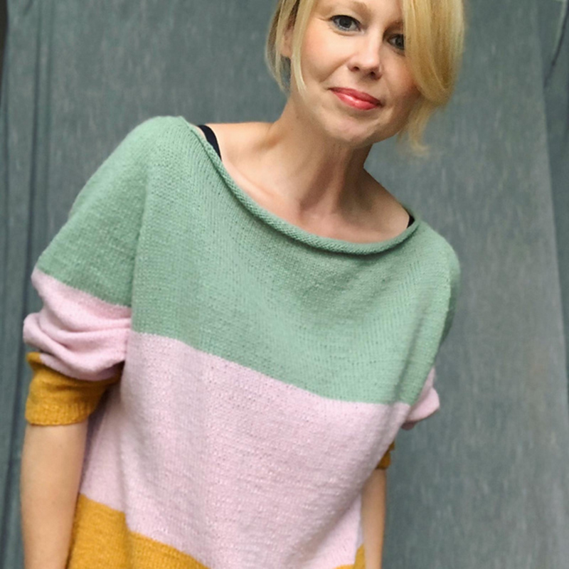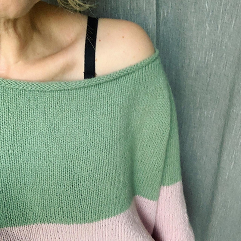 Sisding is a casual oversize sweater with an extra wide neckline. So, it can be worn loosely over the shoulder. The arm hole is very deep and continues into ¾ long batwing sleeves. Striped or plain, it can be worn comfortably with everything.