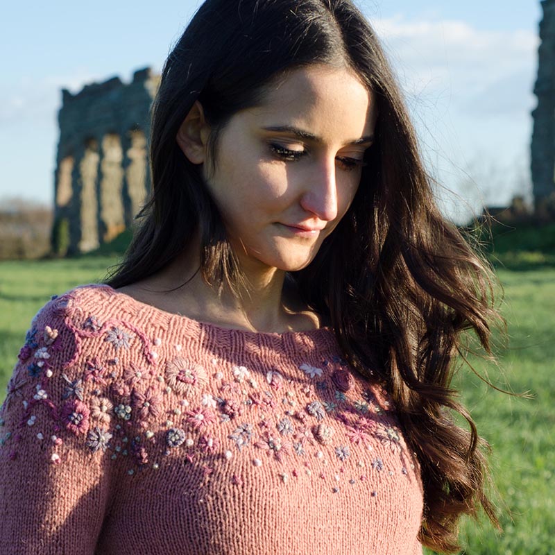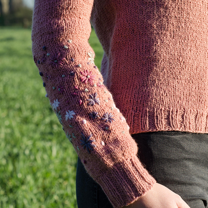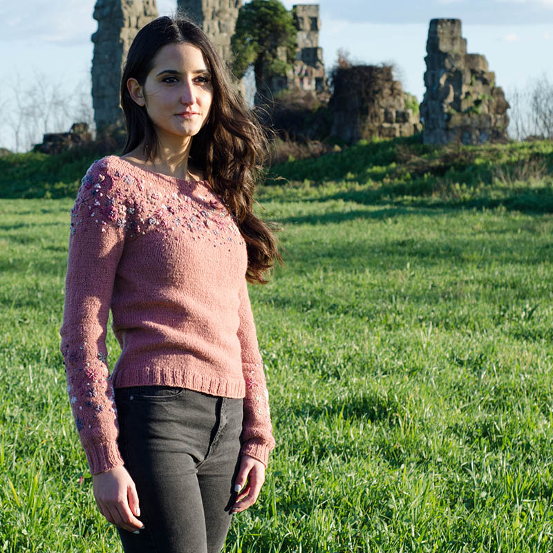 Il ricamo presente sullo sprone è molto semplice da farsi e conta davvero pochi punti ricamo. Tuttavia, per agevolare il lavoro, consiglio di procedere con il ricamo una volta terminato lo sprone e prima di aver separato i punti per le maniche. I punti di ricamo utilizzati, infatti, al contrario del punto maglia e del punto croce solitamente utilizzati su lana, necessitano di inserire l’ago sul diritto del lavoro e riprenderlo sul rovescio e viceversa; poter lavorare solo sullo sprone vi agevolerà notevolmente in questo lavoro. Allo stesso modo, consiglio di iniziare il ricamo sulle maniche prima di aver lavorato i polsini a coste.