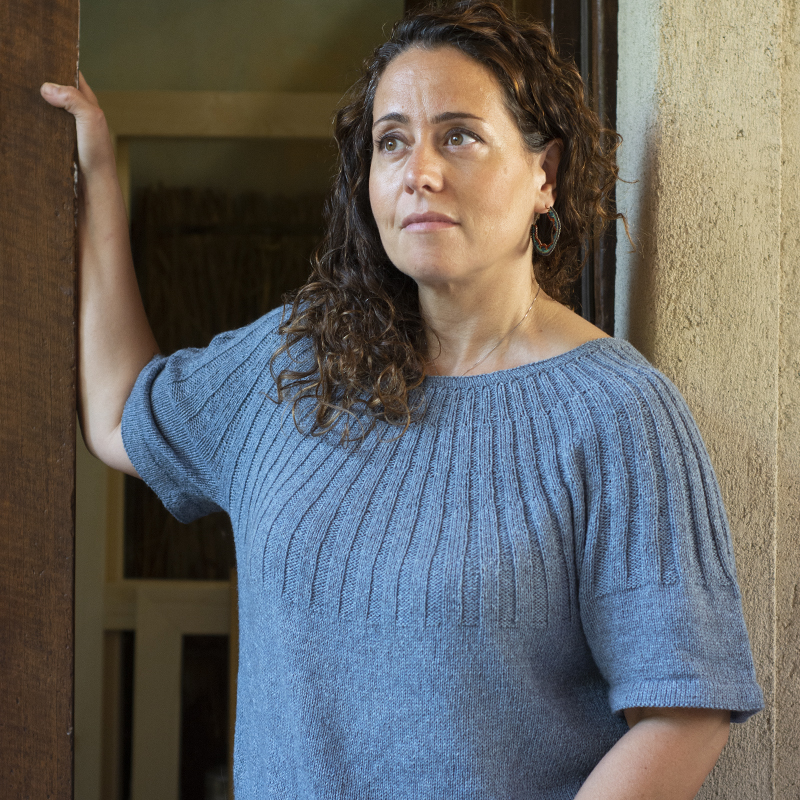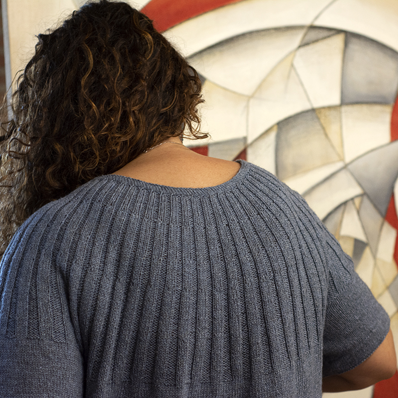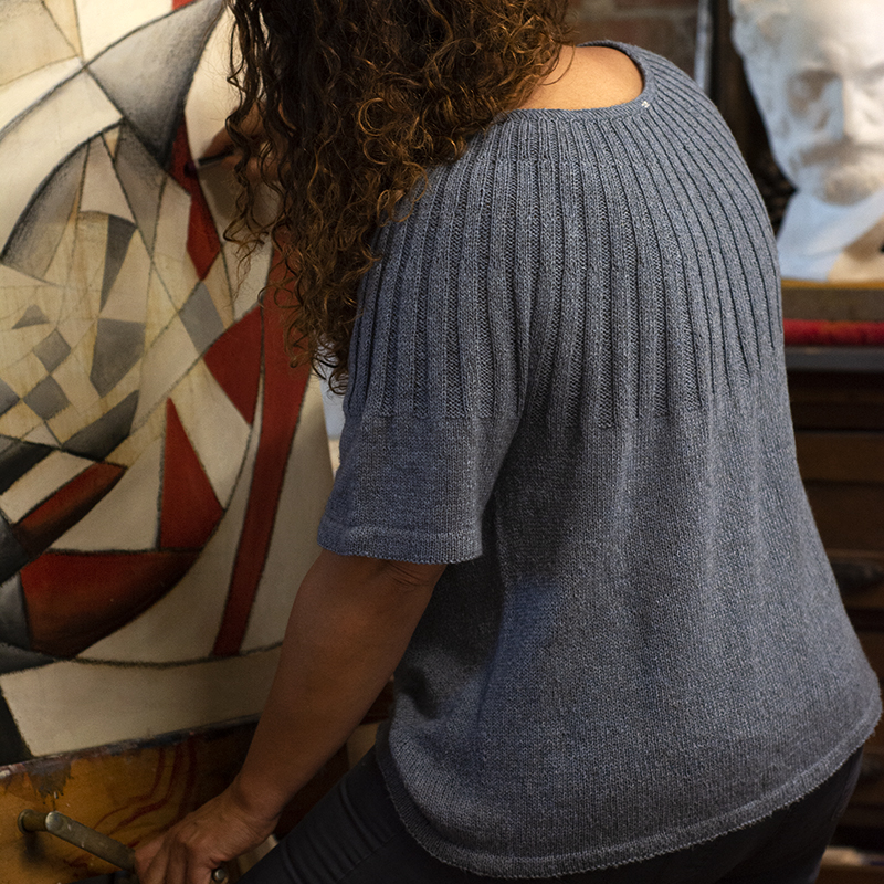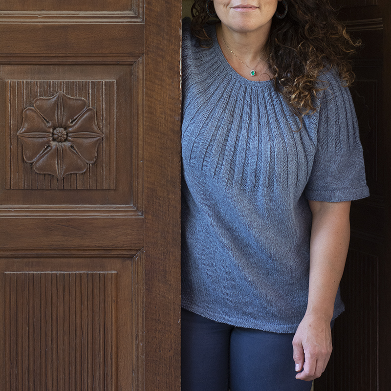 The Sunday Tee is knit from the top down. The circular yoke is worked in the round in rib pattern, shaped with increases. Body and sleeves are worked in the round in stockinette stitch and are finished with a folded edge.