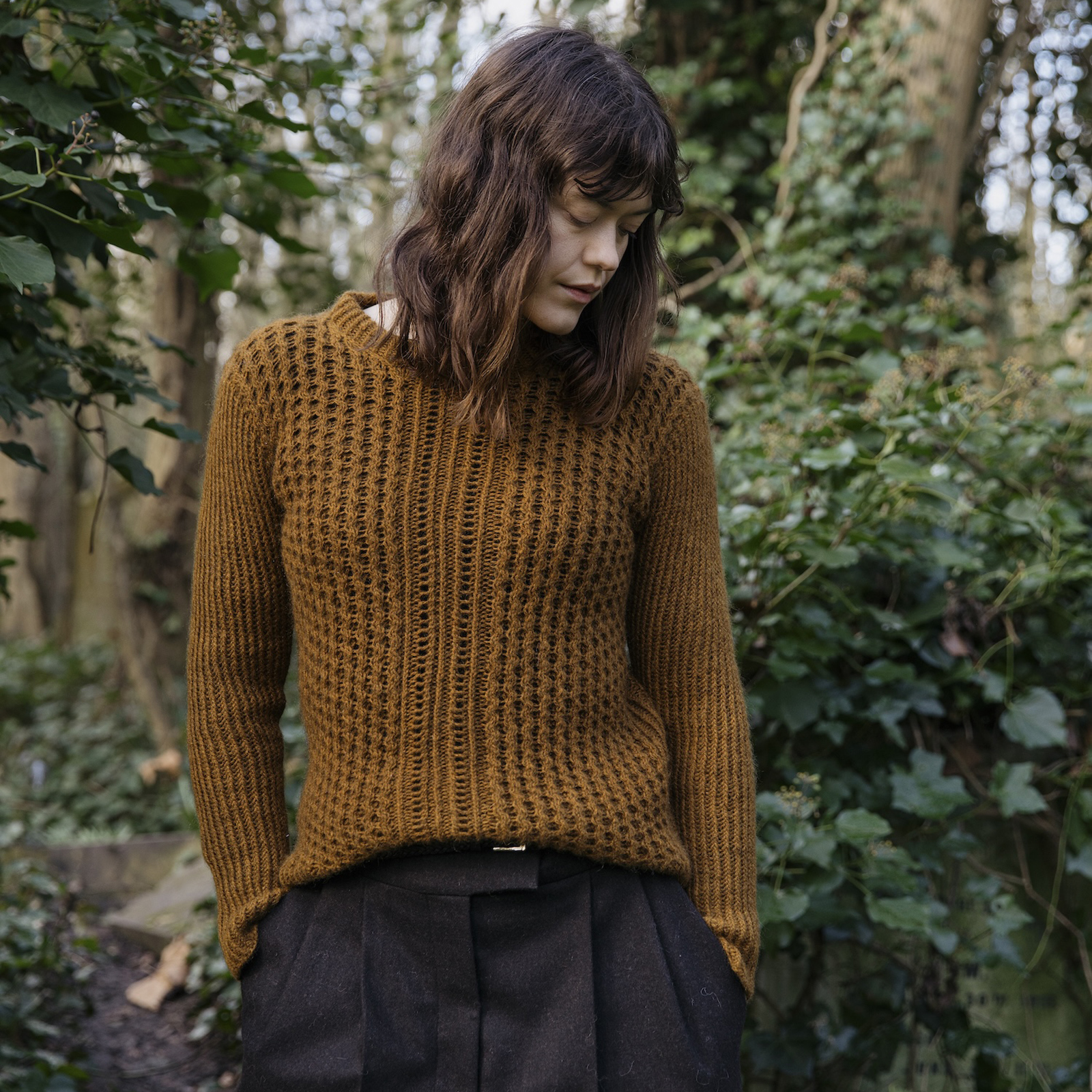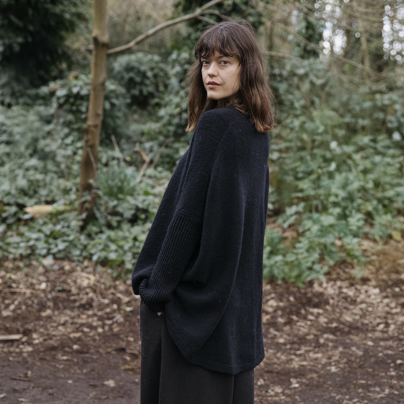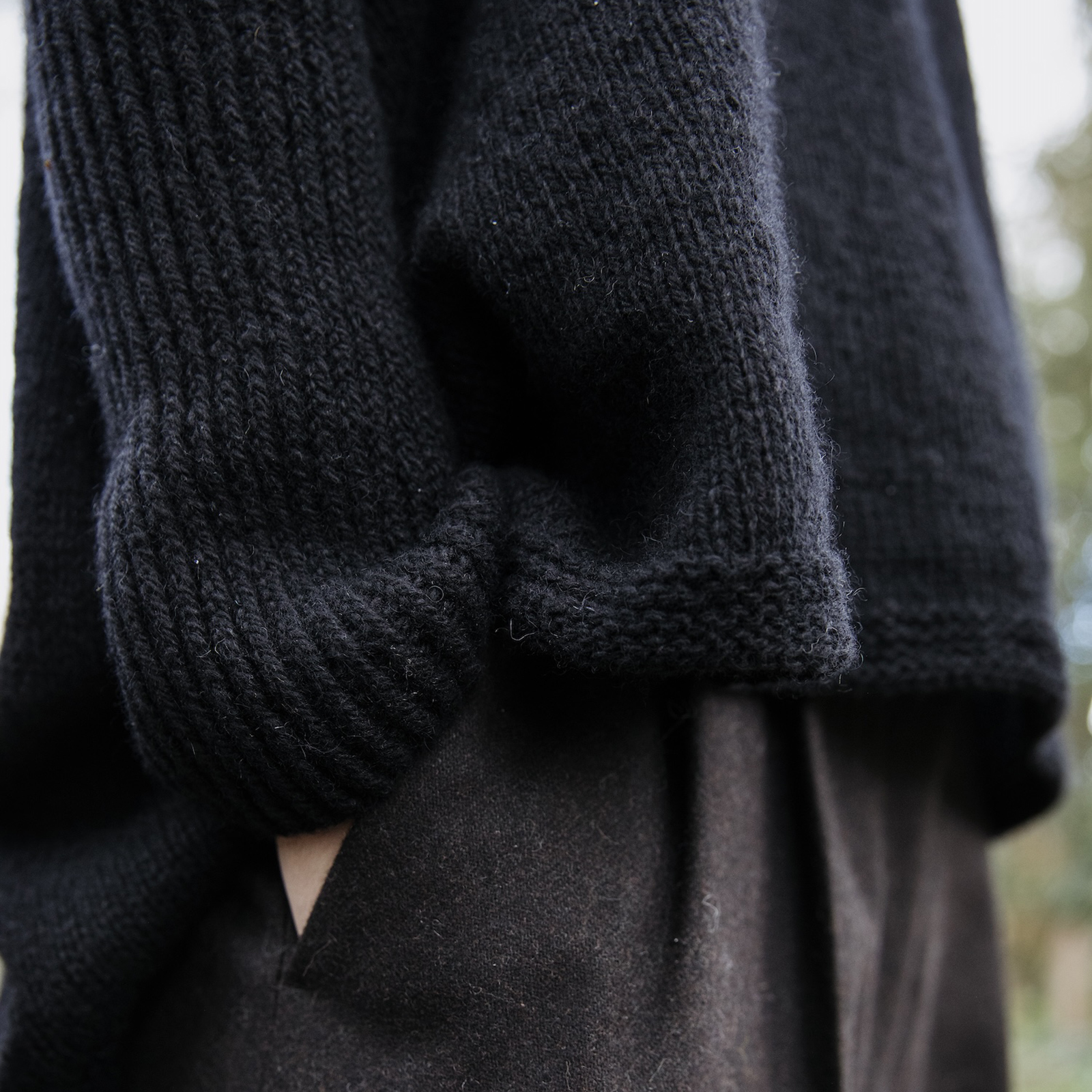 Swoncho Cape is worked from the top down, both flat and in the round, seamlessly – in stockinette stitch. The back yoke is worked first, followed by each side of the front yoke before connecting into one piece. Once the underarm is reached, the front and back join together for some stockinette in the round and a garter stitch hem. A simple collar and sleeves are worked in half twisted rib stitch, to finish the project.