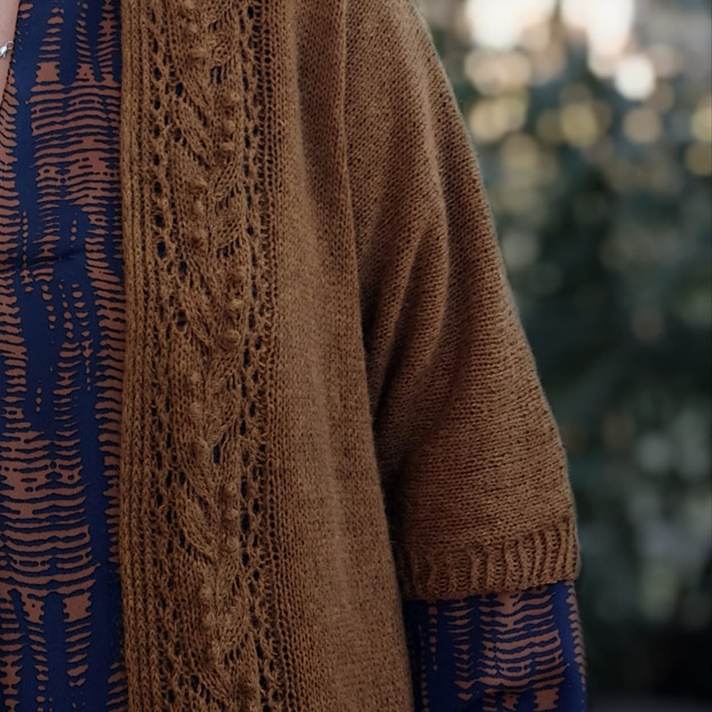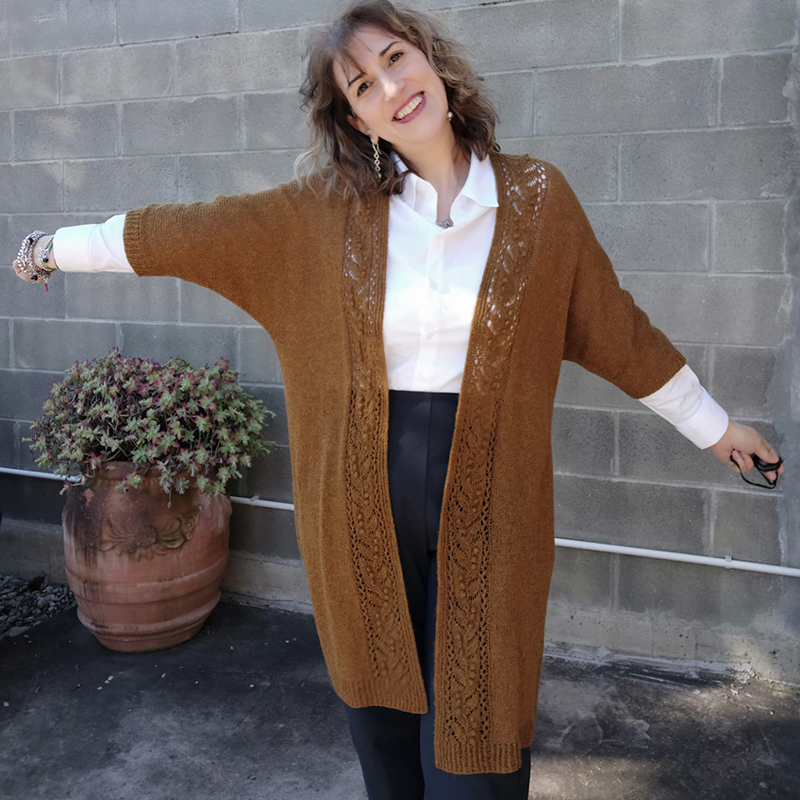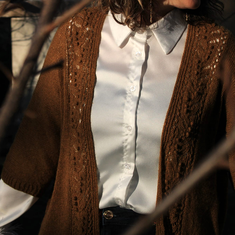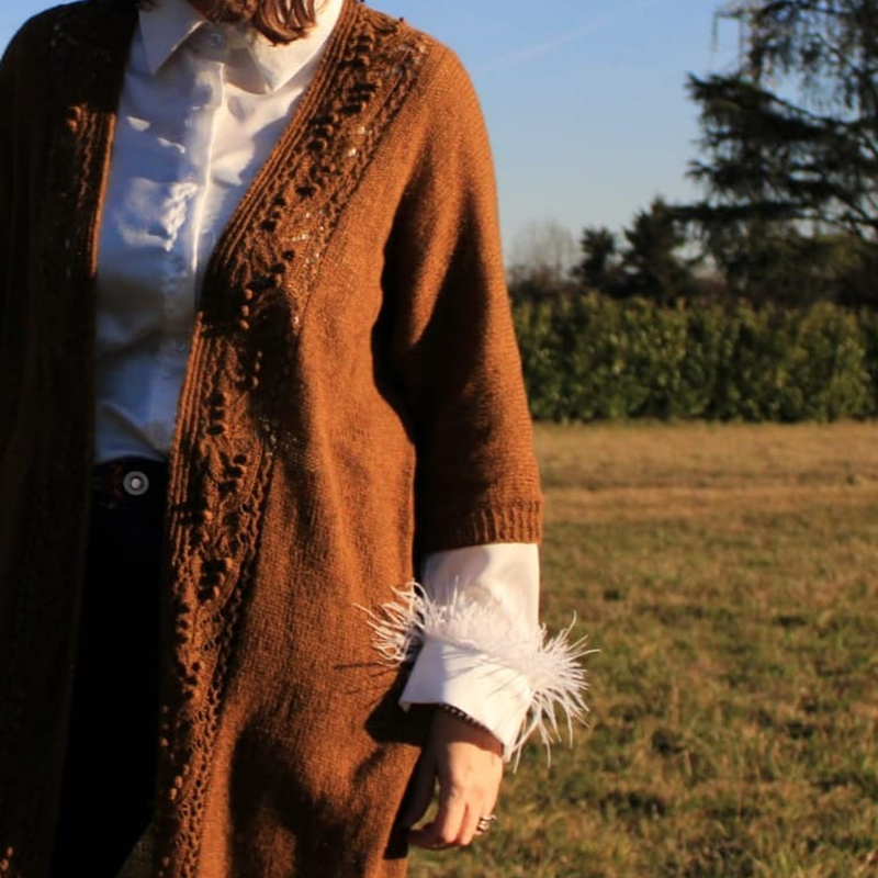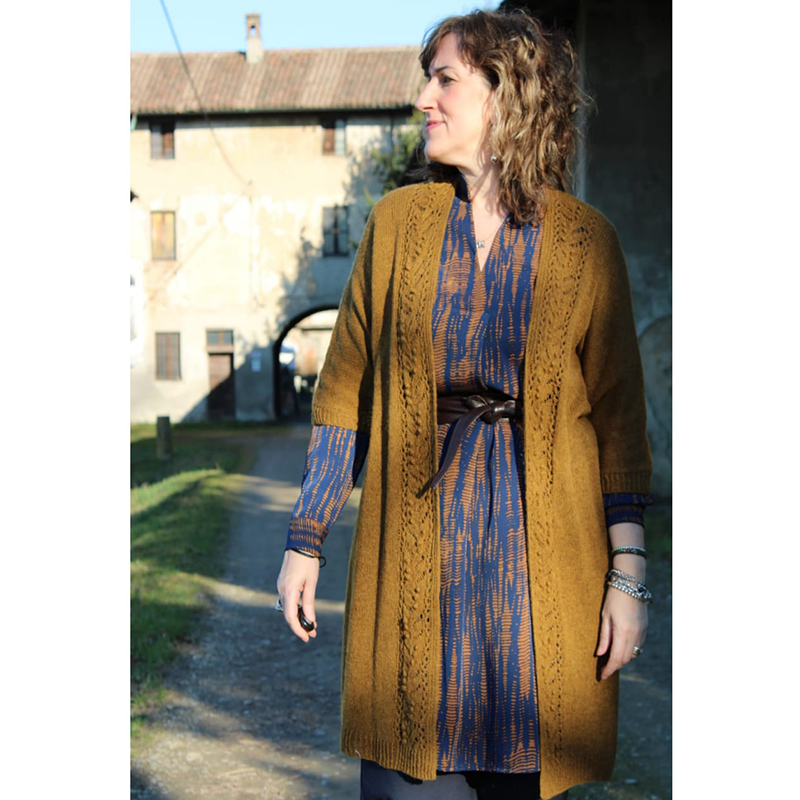 Ukiyo è un elegante cardigan lungo, in stile giapponese, con le maniche a pipistrello sotto il gomito e un delicato motivo in pizzo che delinea tutto il capo. Il suo tessuto arioso lo rende un capo indossabile e senza tempo, perfetto in primavera o per le fresche serate estive, ma anche da indossare in inverno, un abbinamento perfetto per ogni tipo di outfit.