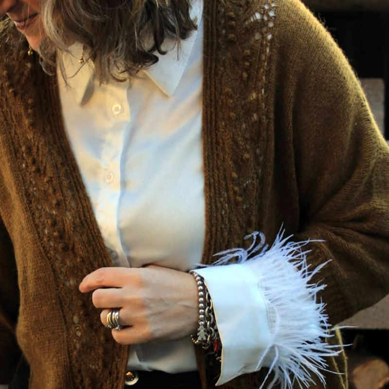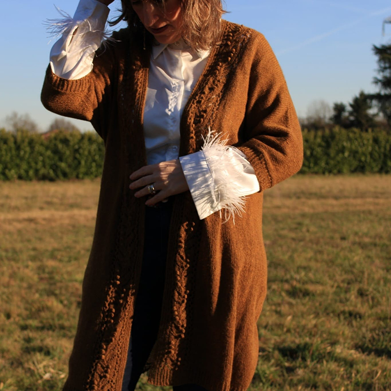Ukiyo is an elegant, long cardigan in Japanese style, with elbow-length batwing sleeves and a feminine lace motif that outlines the collar. Its delicate, airy fabric makes it a wearable, timeless piece, perfect in spring or for cool summer evenings, but also for layering in winter, a perfect match to more type of outfits.