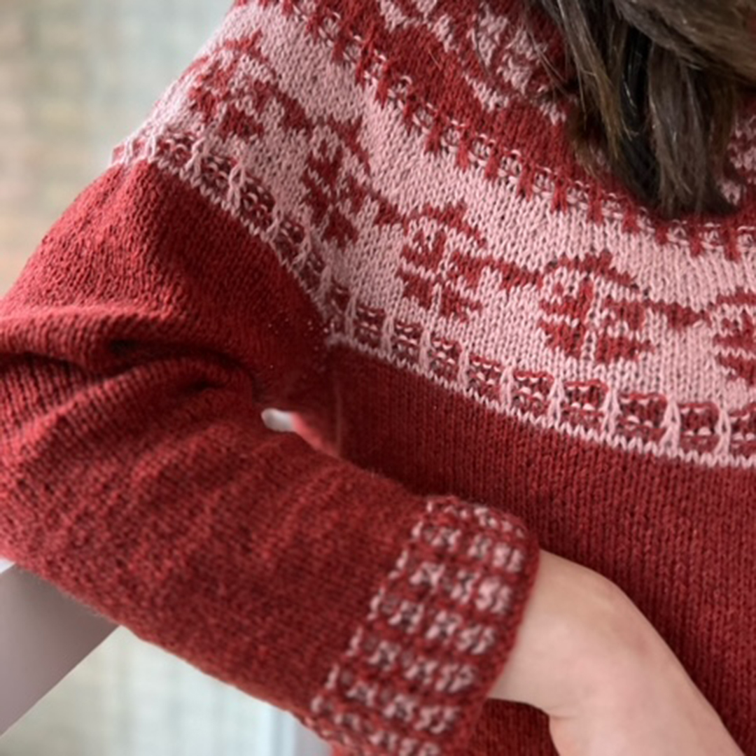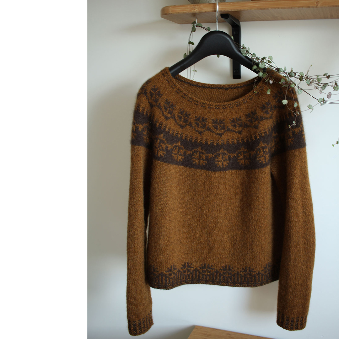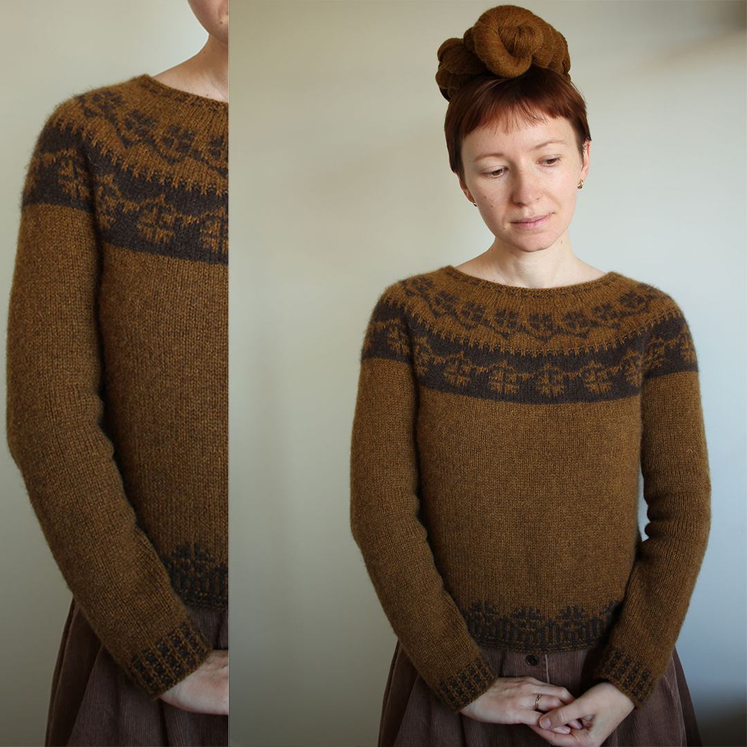 Voloshka or Cornflower in Ukrainian is inspired by this beautiful meadow flower. It is frequently used in traditional Ukrainian embroidery, especially in the farmland regions. Cornflowers are often found in the fields of wheat and cereal crops, where they look like beautiful blue eyes in the sea of yellow. This round-yoke pullover is closely fitted with only about 6 cm (2.25 in) of recommended positive ease, and is knit top down in the round. You can take a closer look at my sample and discover the design process with all its intermediate versions for your inspiration in this podcast episode. Two charted versions of the yoke colourwork are provided with a MC (light) and CC (dark) background for those who prefer a more minimalistic look of the first version.