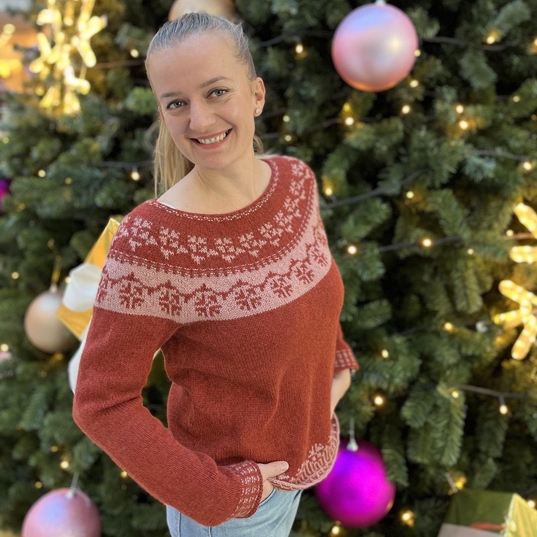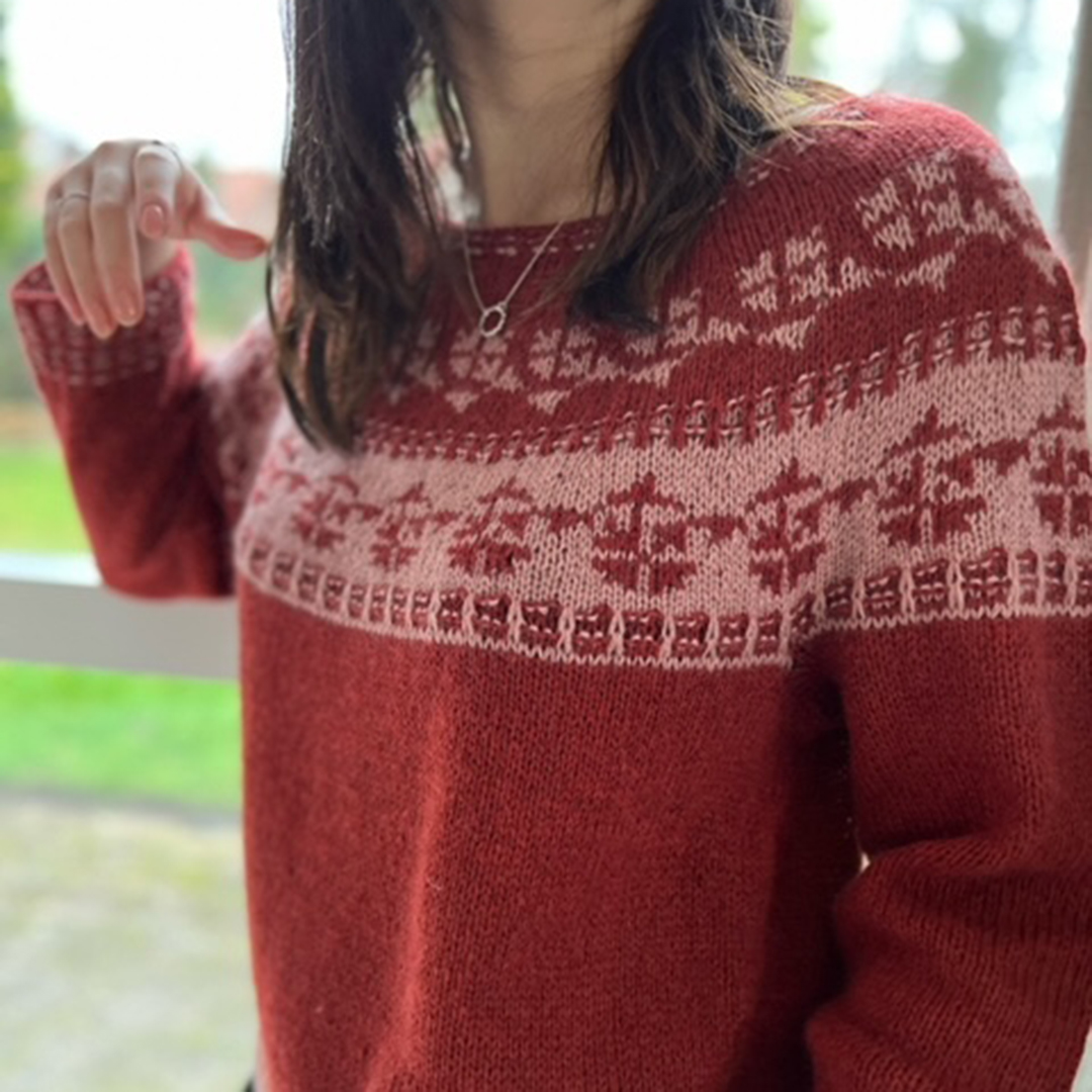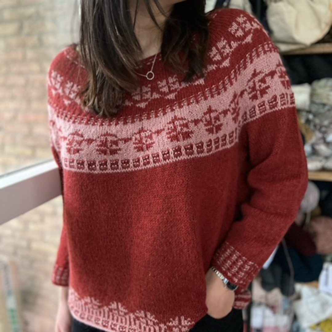 Voloshka or Cornflower in Ukrainian is inspired by this beautiful meadow flower. It is frequently used in traditional Ukrainian embroidery, especially in the farmland regions. Cornflowers are often found in the fields of wheat and cereal crops, where they look like beautiful blue eyes in the sea of yellow. This round-yoke pullover is closely fitted with only about 6 cm (2.25 in) of recommended positive ease, and is knit top down in the round. You can take a closer look at my sample and discover the design process with all its intermediate versions for your inspiration in this podcast episode. Two charted versions of the yoke colourwork are provided with a MC (light) and CC (dark) background for those who prefer a more minimalistic look of the first version.