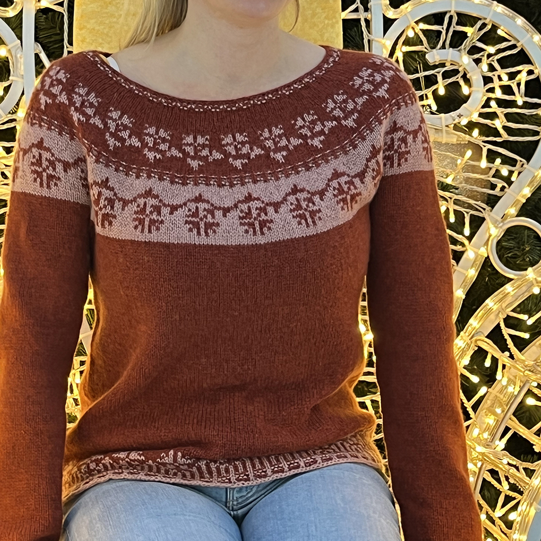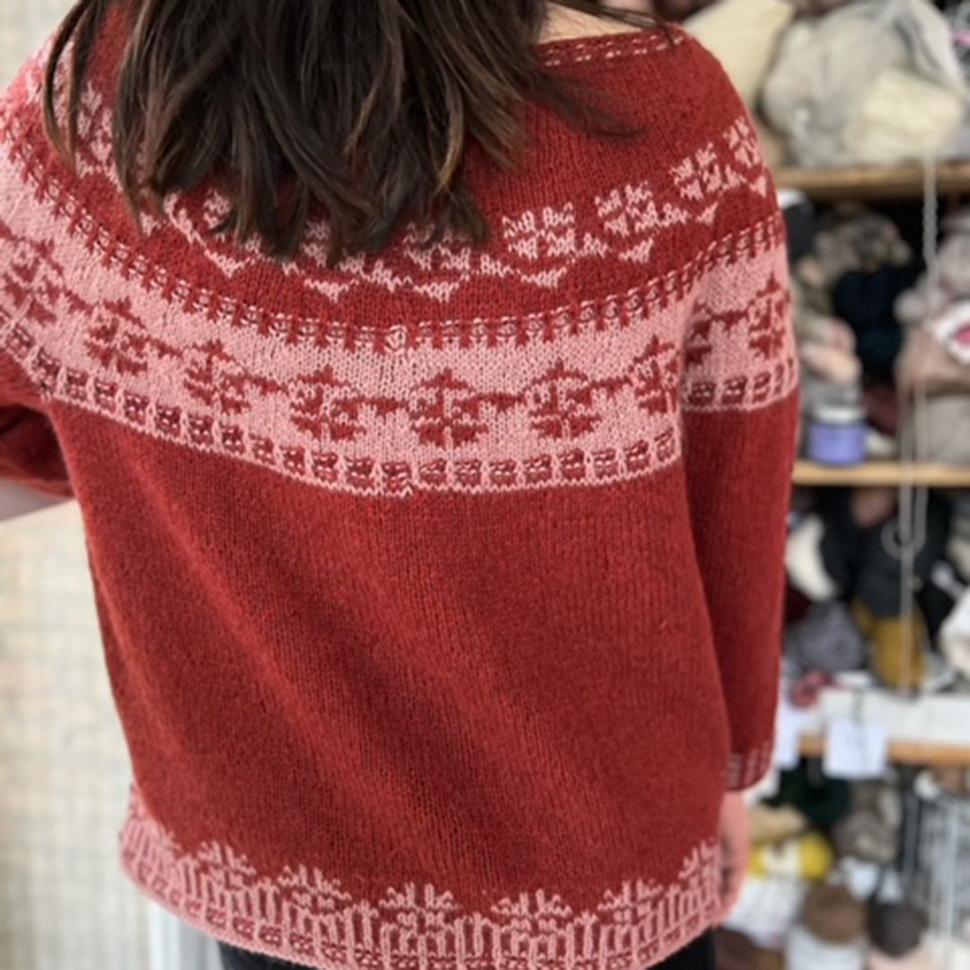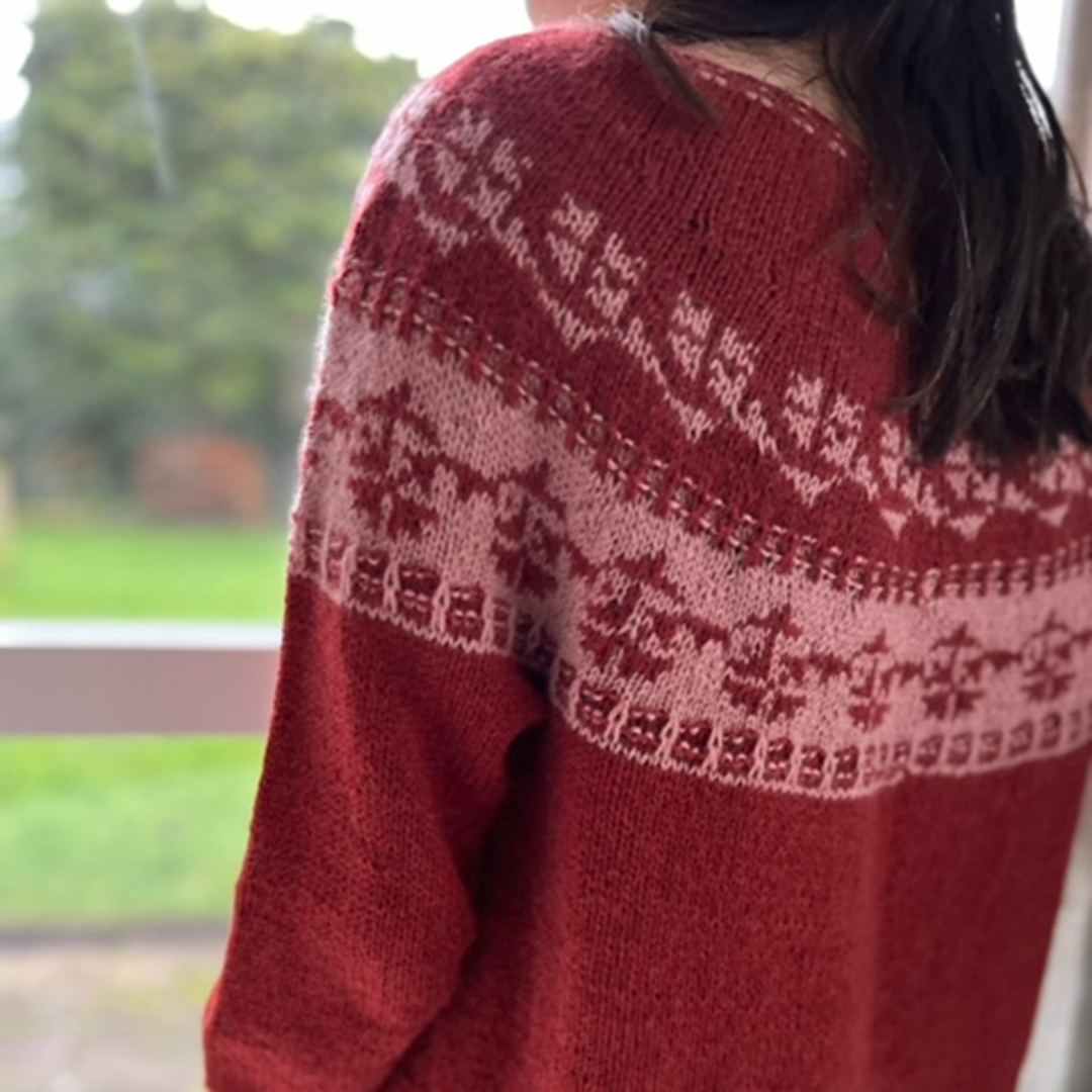 3.5 mm (US 4) needles measured over colourwork pattern of the yoke worked in the round after blocking.