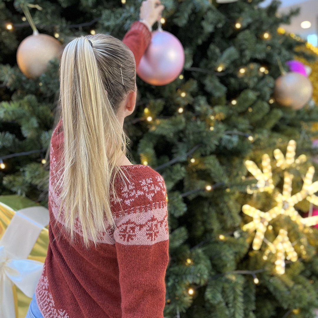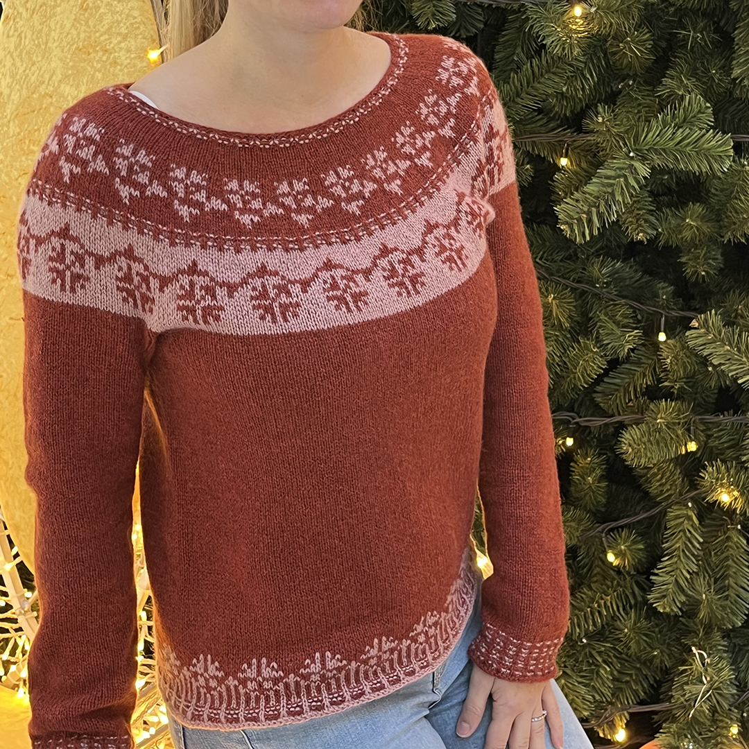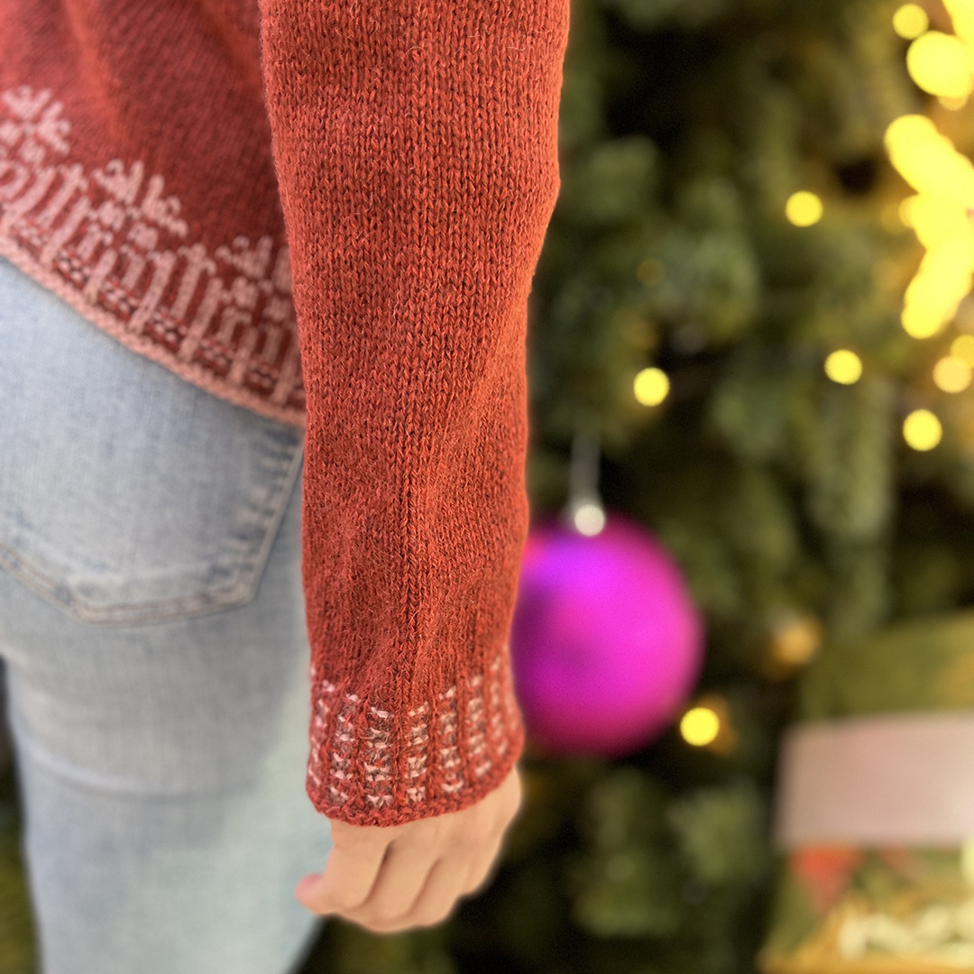 3.5 mm (US 4) needles measured over colourwork pattern of the yoke worked in the round after blocking.