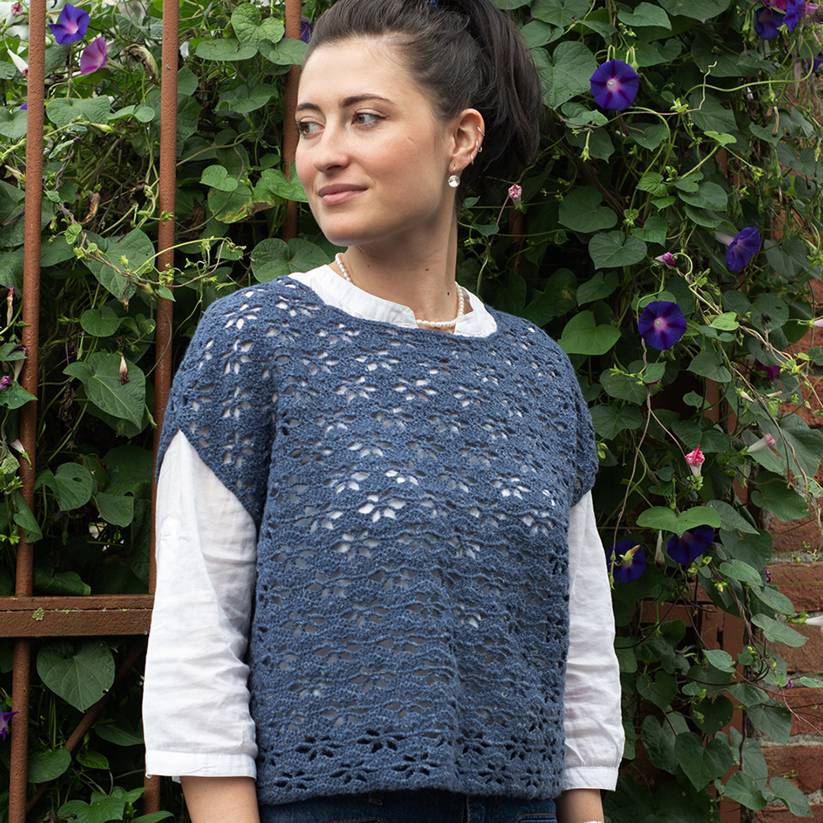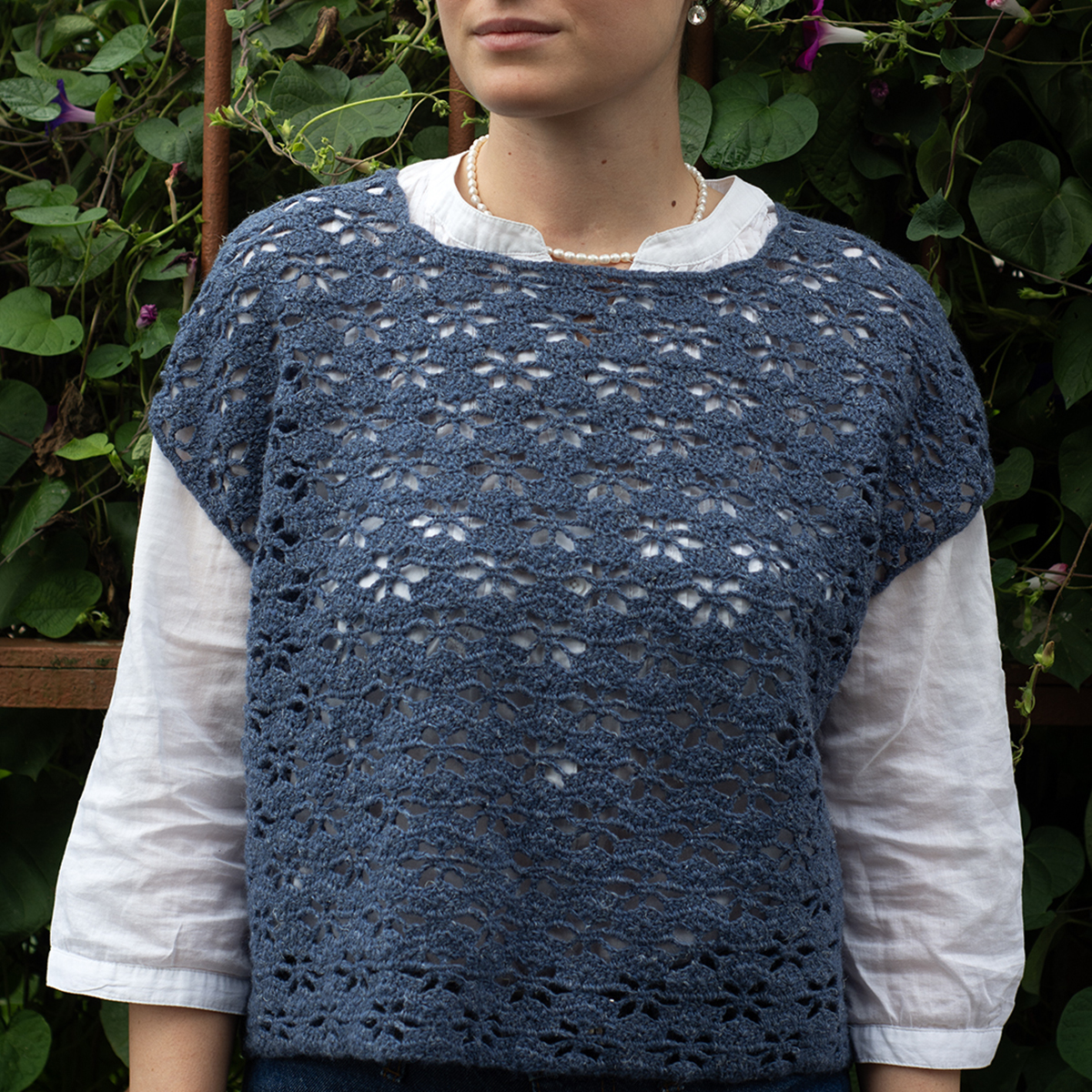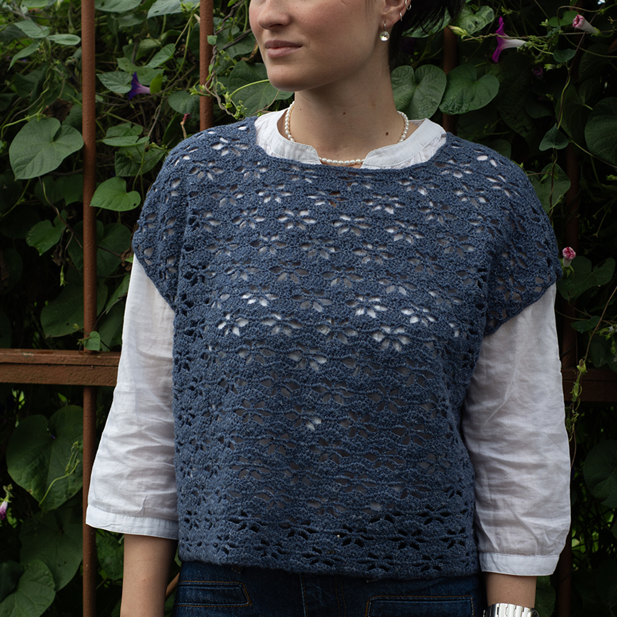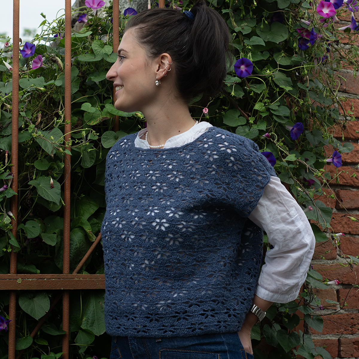 mYak’s Fior di Lino blend is the absolute game-changer for crochet garments. Trust us, this yarn isn’t just a knitting superstar. It’s got the softness, drape, and that perfect amount of structure you want in a crochet top. And can we talk about the color? We’re using the Denim shade, and it’s exactly what we were was looking for to crochet the Water Clover. It’s like it was made for this pattern!