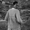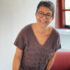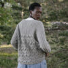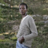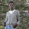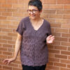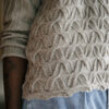 Woven Bands is a modified drop shoulder sweater that is worked bottom up in the rnd. Once the armhole has been reached, the body is divided into front and back. Short rows on the back shape a shoulder slope. With working decreases along the edges of the fronts, you shape the V-neck and achieve the same shoulder slope as on the back. Therefore, the fronts have 6 more rows than the back. Then back and fronts are subsequently joined with a 3-Needle Bind-Off. For the sleeve, sts are picked up around the armhole, and it is worked in the rnd with decreases to the cuff.