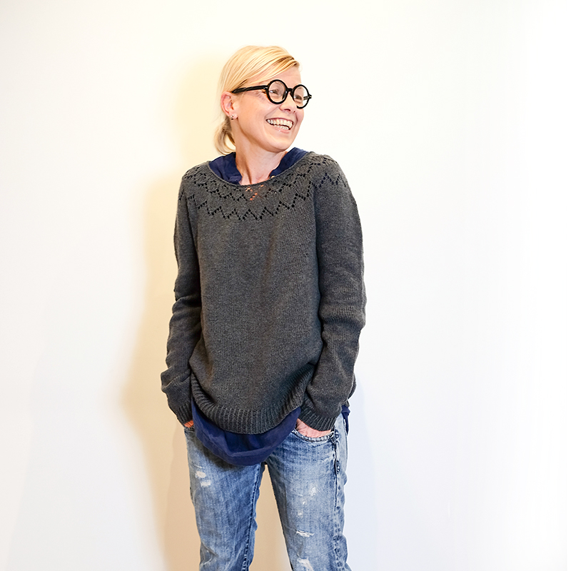 Yume is worked seamlessly from the top down. First some short-rows are worked back and forth to create a higher back neck and then the round- yoke is worked top down to sleeve separation. Some last short-rows are worked to finish the yoke shaping right before sleeve stitches are placed on hold, then the body is worked in rounds down to the hem. Sleeves are worked top down to the cuffs last.