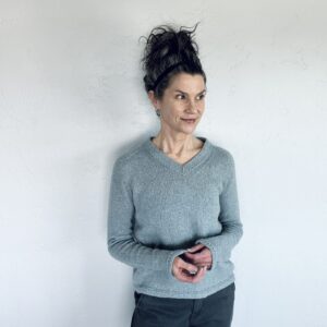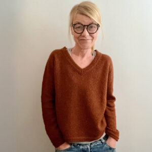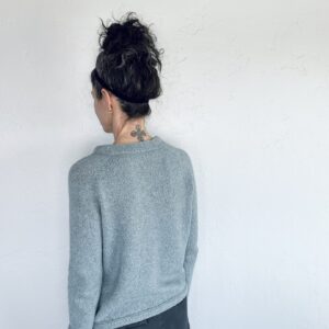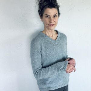 Zora is worked seamlessly from the top down. The yoke is shaped by using a modified version of the contiguous set-in sleeves method developed by Susie Meyers. Starting with the cast-on of the saddle shoulders and the back, the yoke is worked back and forth with increases for the front(s), the back and the saddle(s), respectively sleeves and V-neck until the V-neck shaping is complete. From there, the yoke is worked in rounds to sleeve and body separation. At underarm, the sleeve stitches are placed on hold and the underarm stitches are cast on using your preferred method. Then the body is worked in rounds to the folded hem. The folded V-neck finishing is worked next. Sleeve stitches are then picked up again to work the sleeves top down in rounds to the folded cuffs.