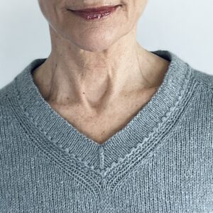 US 3 (3.25 mm) 16” (40 cm) and 32” (80 cm) circular needle and DPNs (or preferred needle to work small circumferences) for outer body hem, outer V-neck finishing and outer sleeve cuffs.