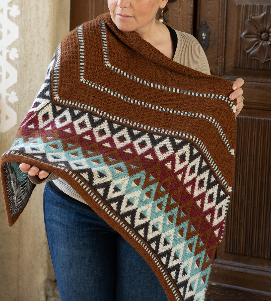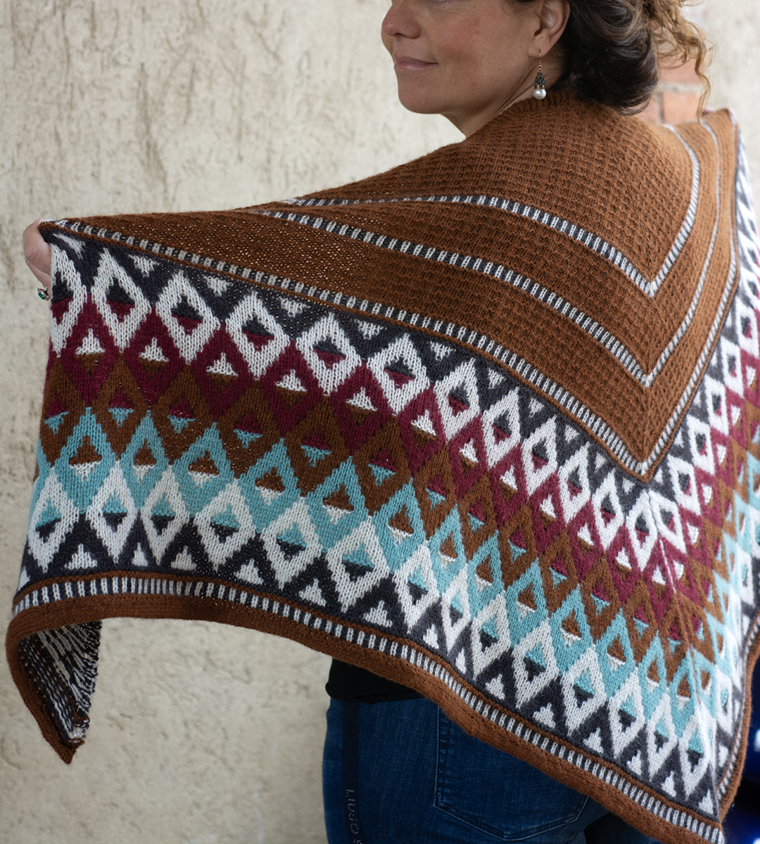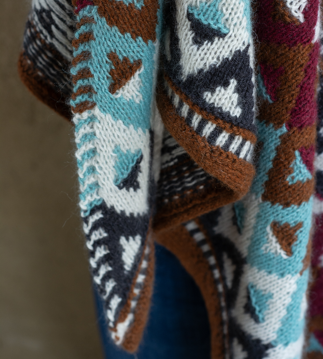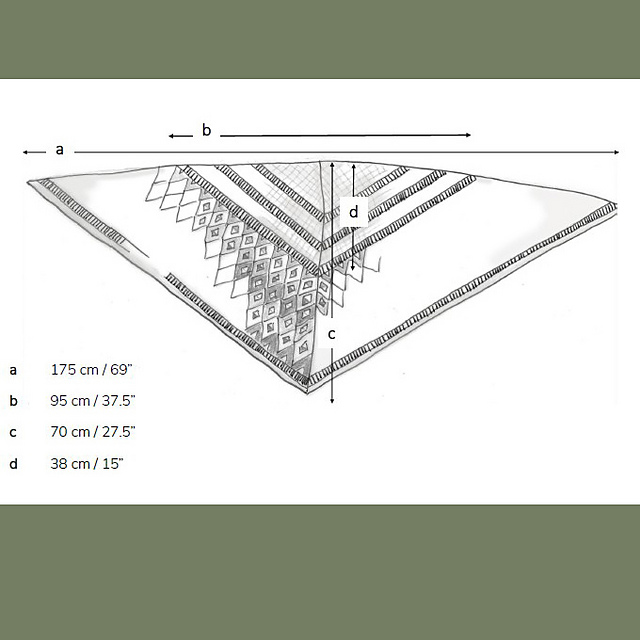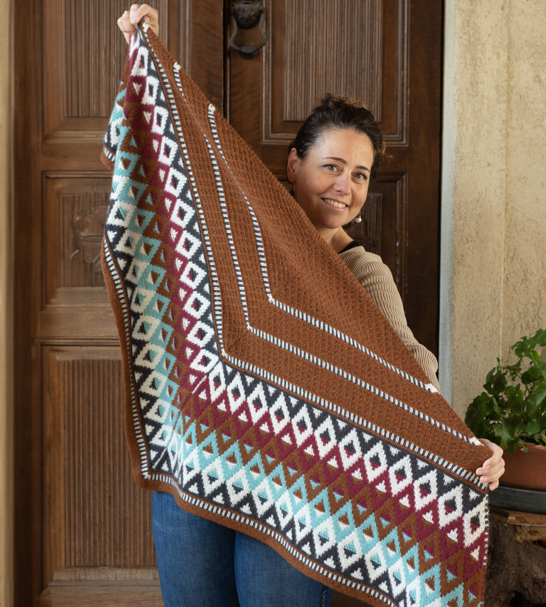Artus è uno scialle triangolare lavorato dall’alto verso il basso, partendo dal centro e iniziando con un classico avvio a legaccio. Lo scialle presenta strette fasce di colore 1×1 create con la tecnica del filo intrecciato. L’accattivante bordo dello scialle è lavorato con la tecnica del mosaico, utilizzando un solo filo di filato per ogni giro.