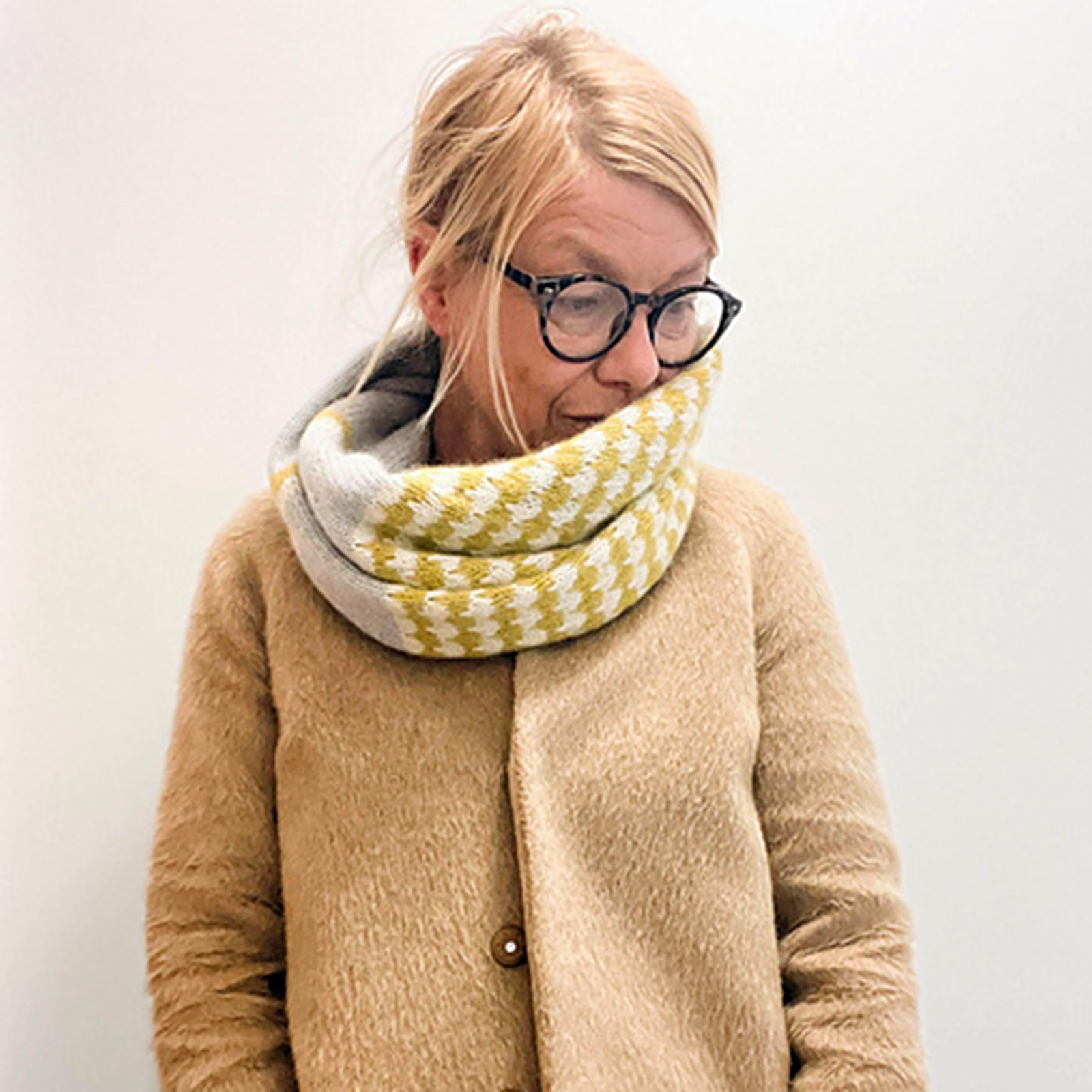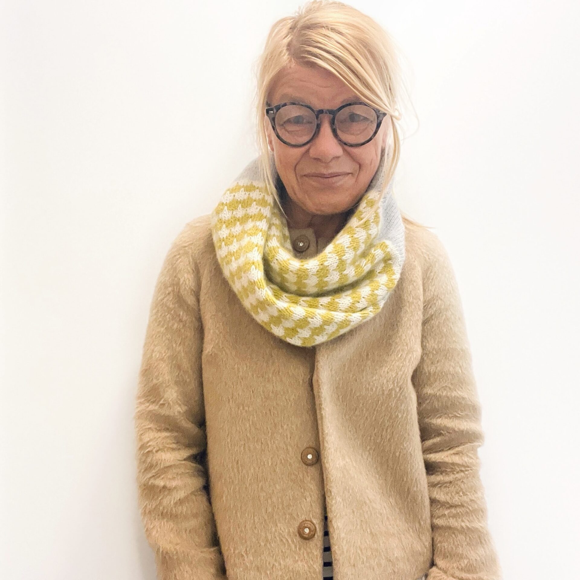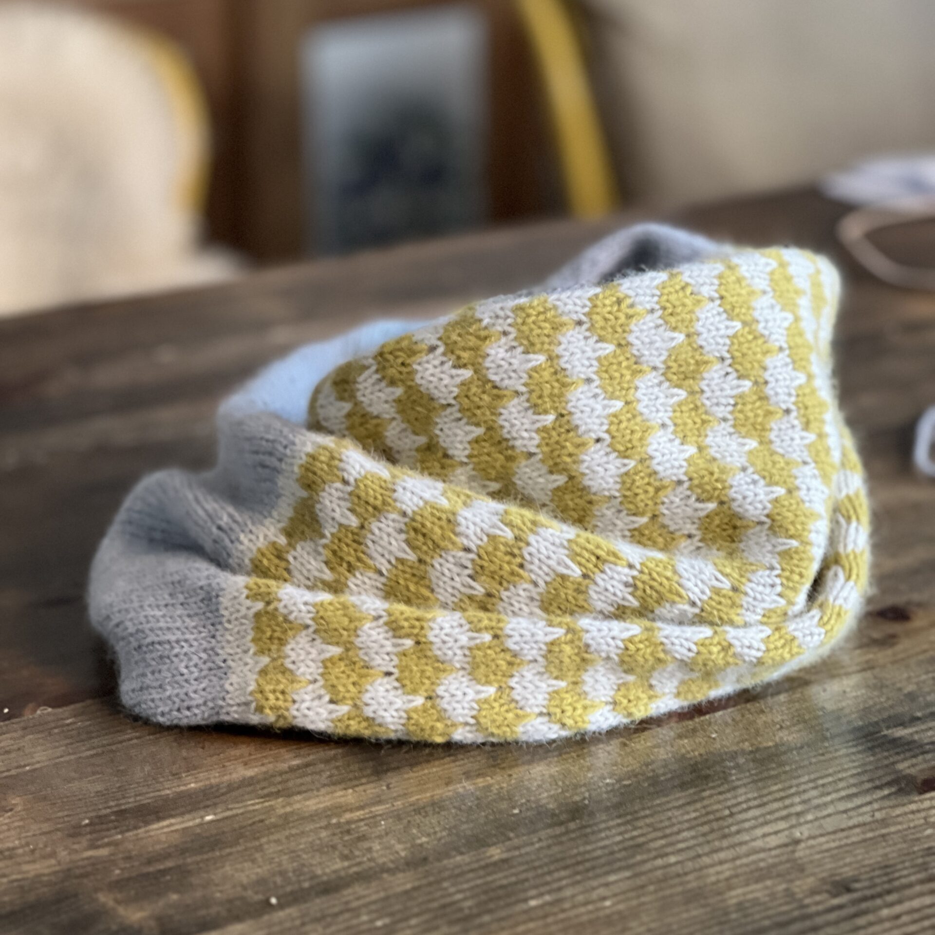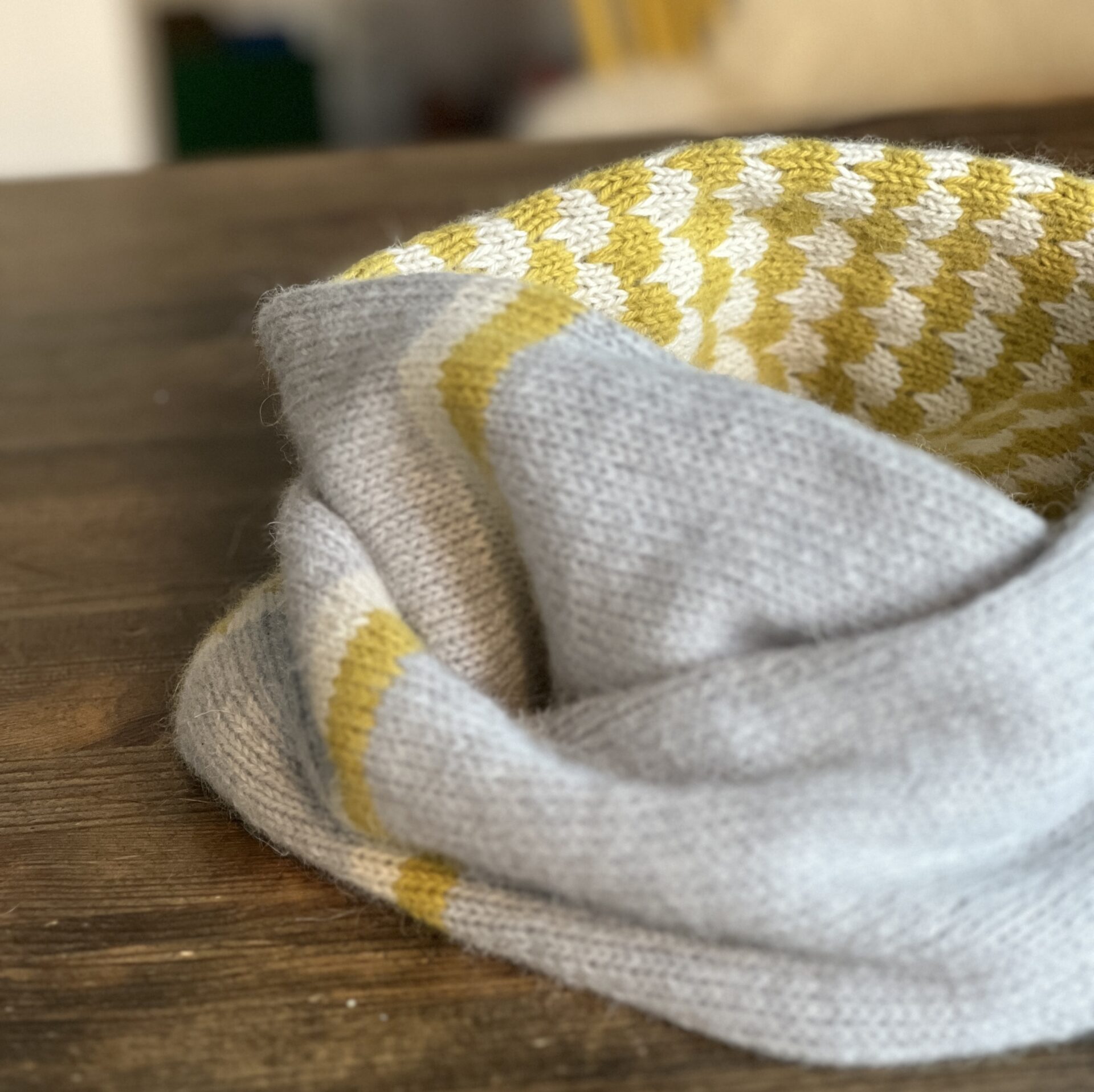 The tubular, twisted (Mobius) cowl features the beautiful and fun stitch pattern I used for the HEIMATHAFEN pullover in combination with generous Stockinette stitch sections and a narrow contrasting stripe.