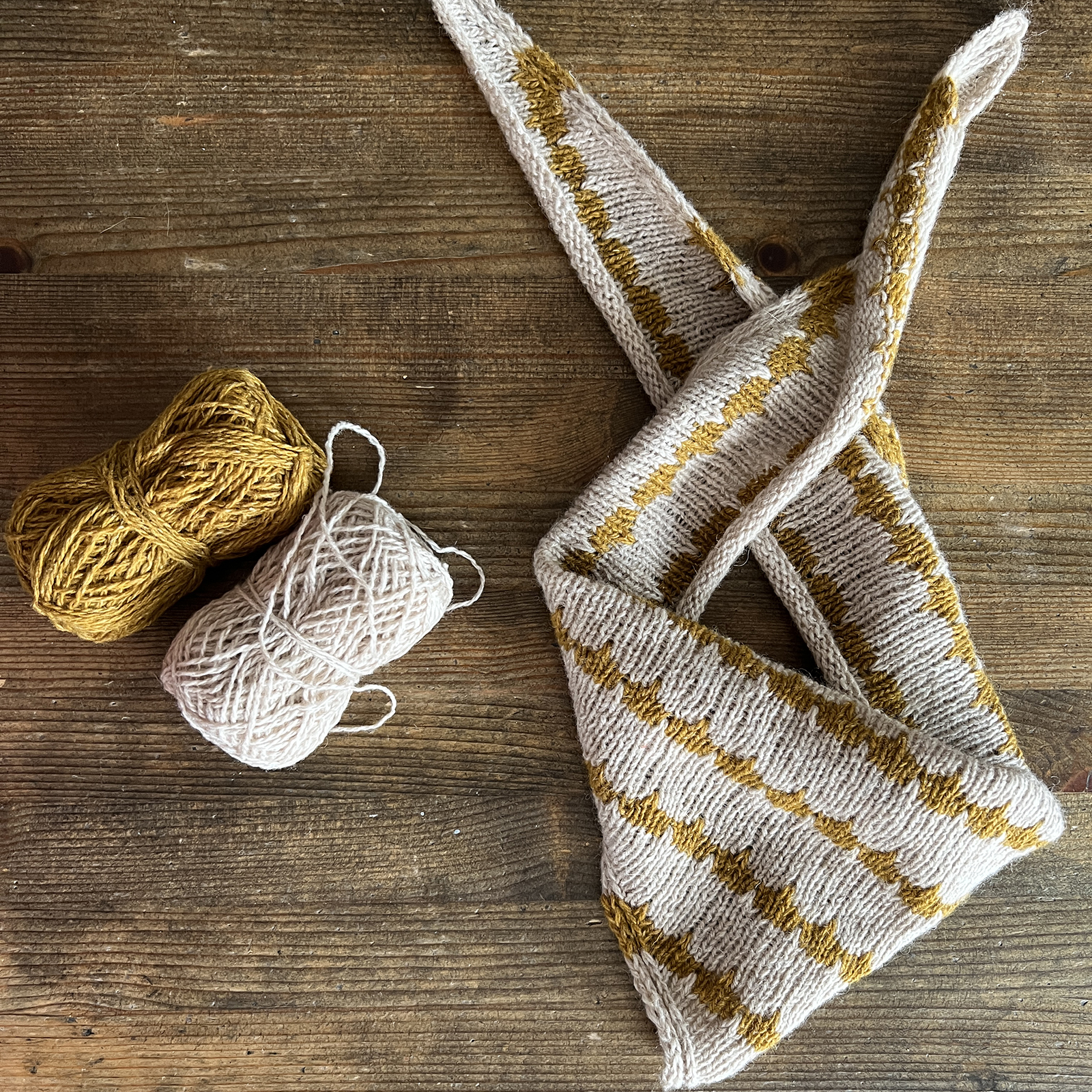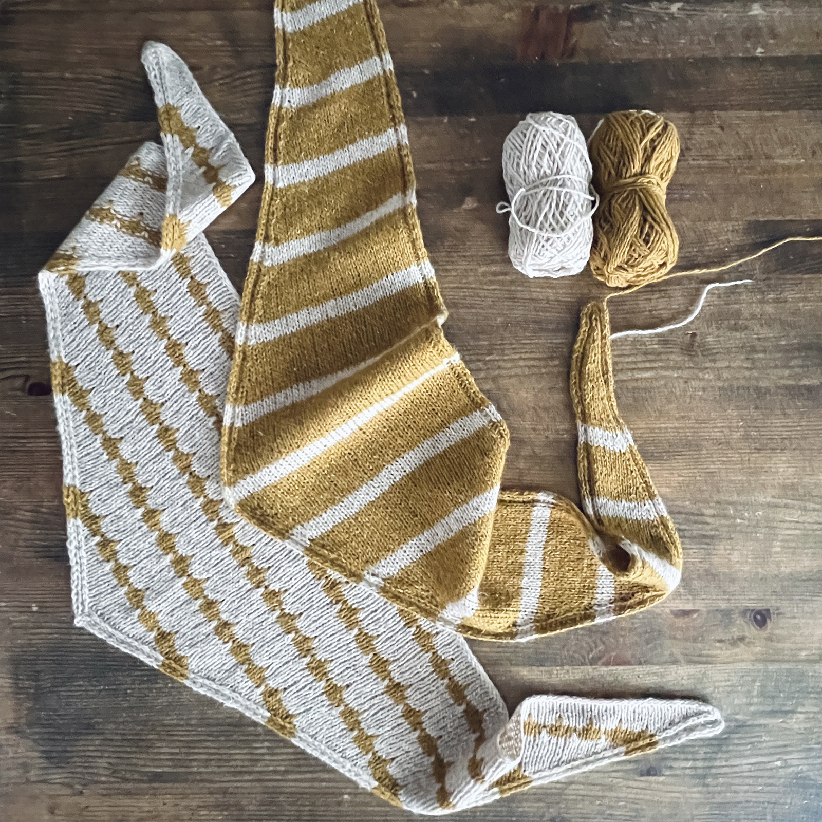 Starting with the cast-on of all stitches needed for the top edge, this little scarf is worked in dip stitch stripe pattern back and forth. Decreases are worked on both the RS and WS rows until there are only 3 sts left. Yarn overs will be worked and dropped at the start and end of each row to make sure the shawl edges won’t pull in.