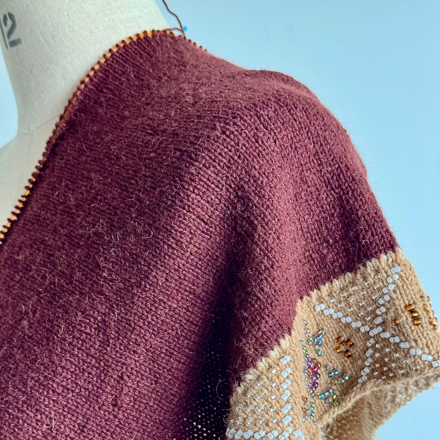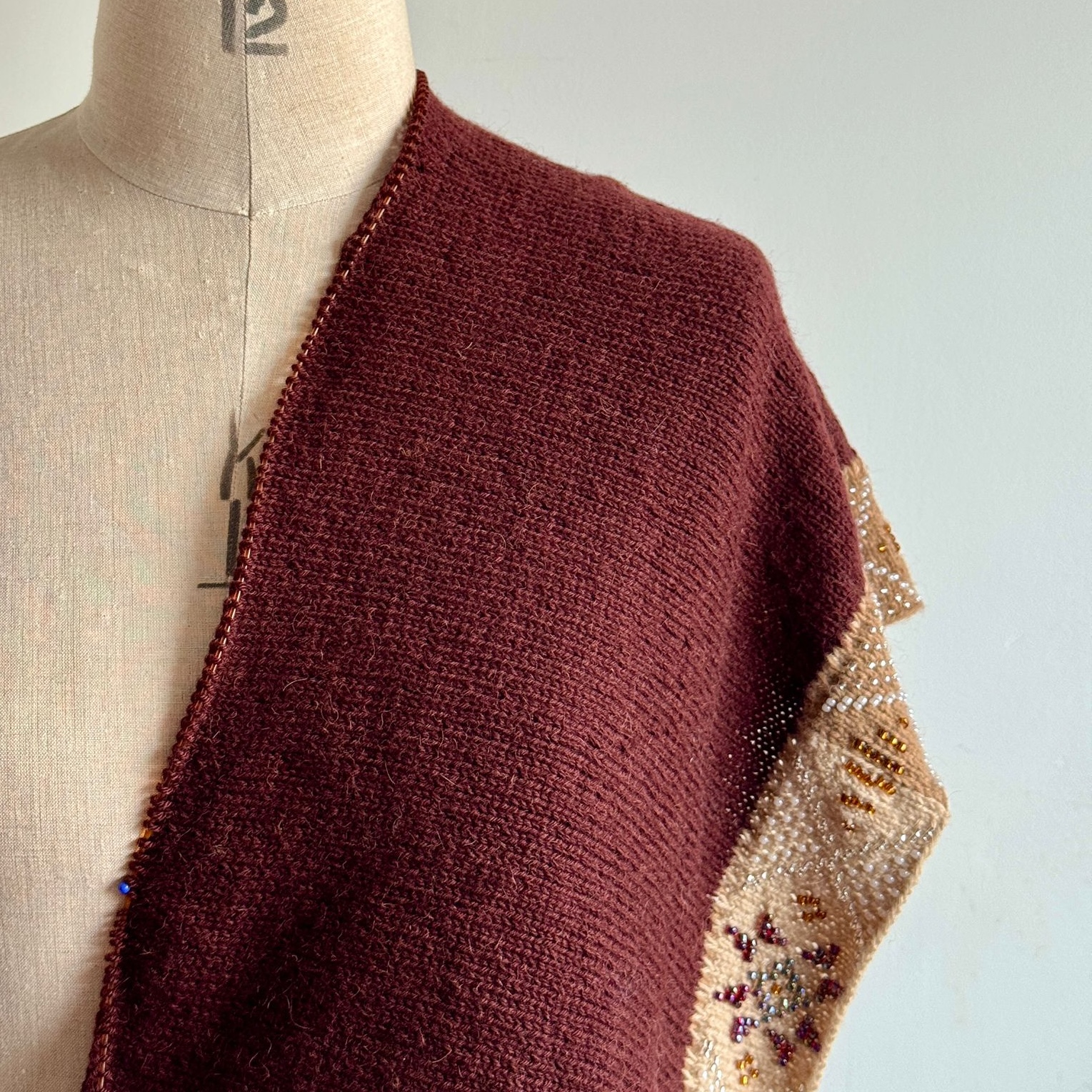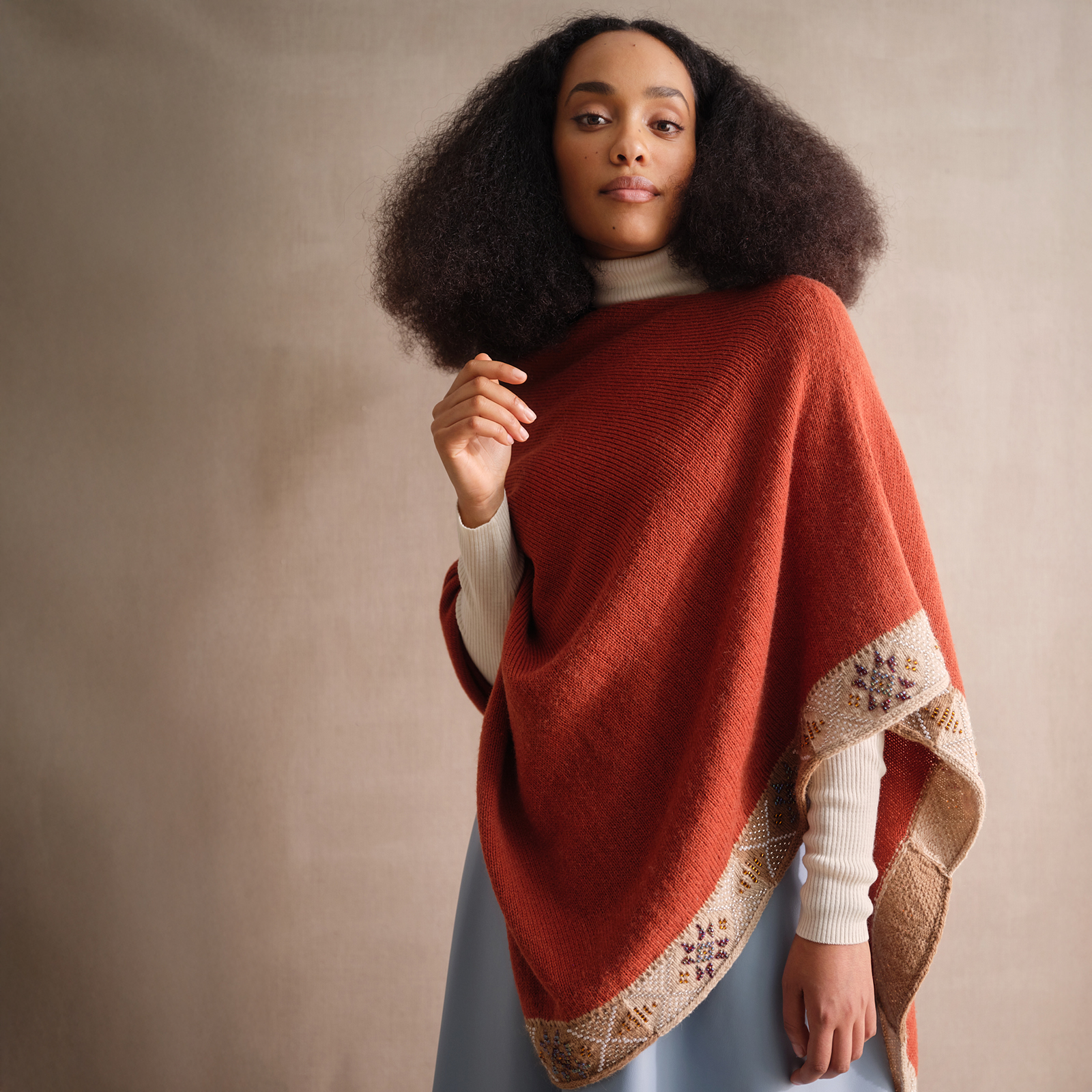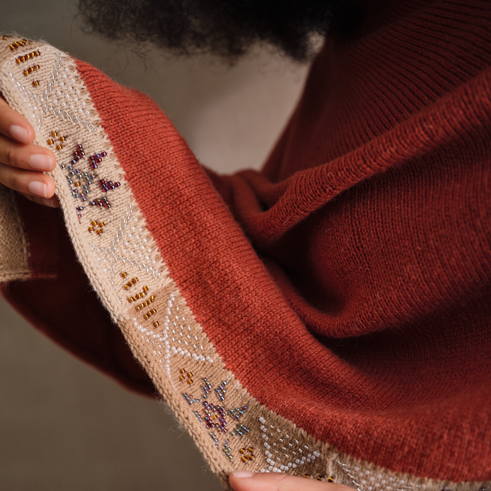 This elegant poncho shows what is possible when you combine different sizes of bead within a project. While swatching for this design, I felt there was too much ‘bling’ using only the larger size 6 beads, which of course also contributes to the weight of the garment. I found I could address both issues by using size 6 beads to create the central star shapes and use the smaller, size 8 beads for the X-shaped motifs. Each beaded block in this design is worked individually, almost like a sample. Once joined into to a single panel, the rest of that section is worked in stockinette stitch. The softness of mYak’s Baby Camel helps make this garment a timeless layering piece.