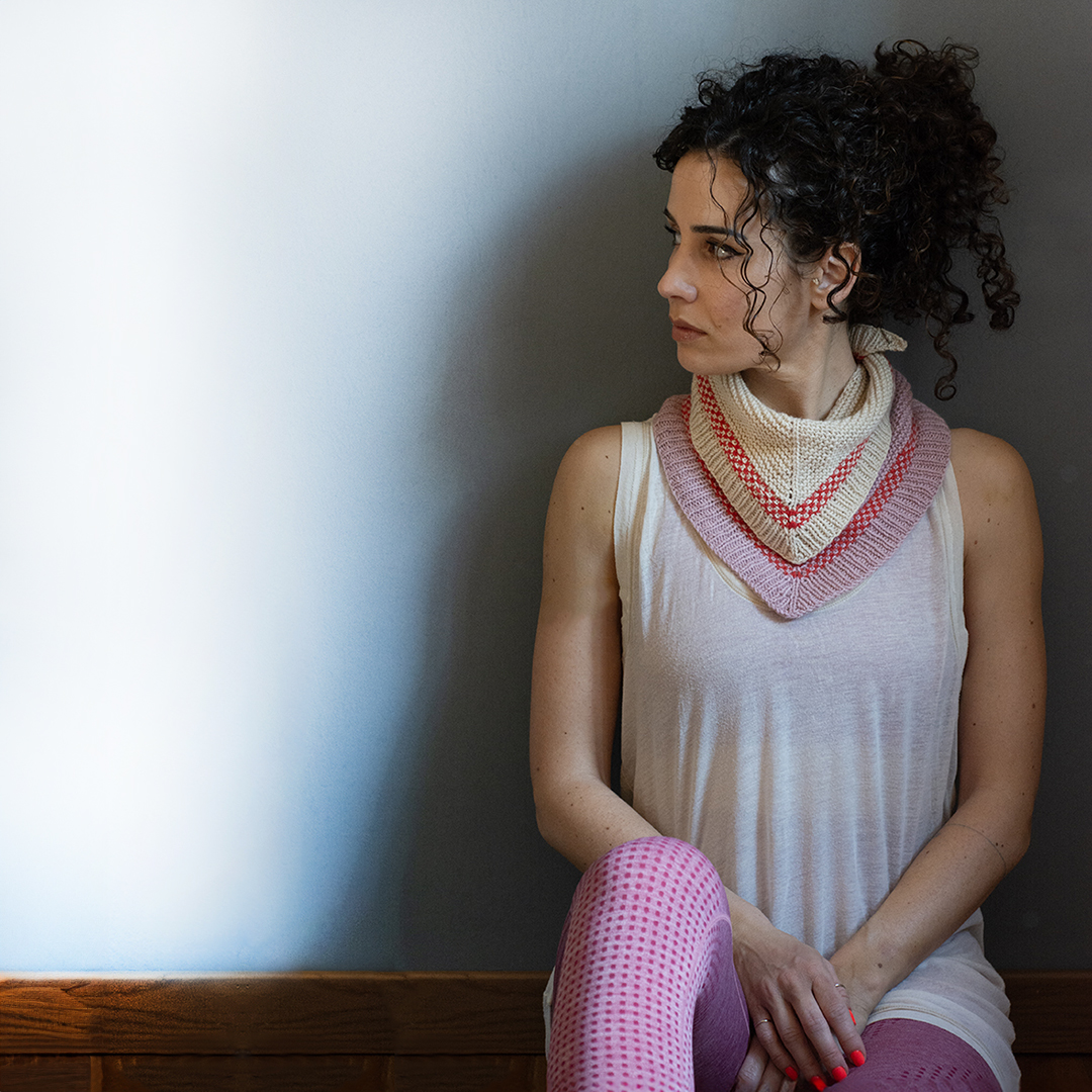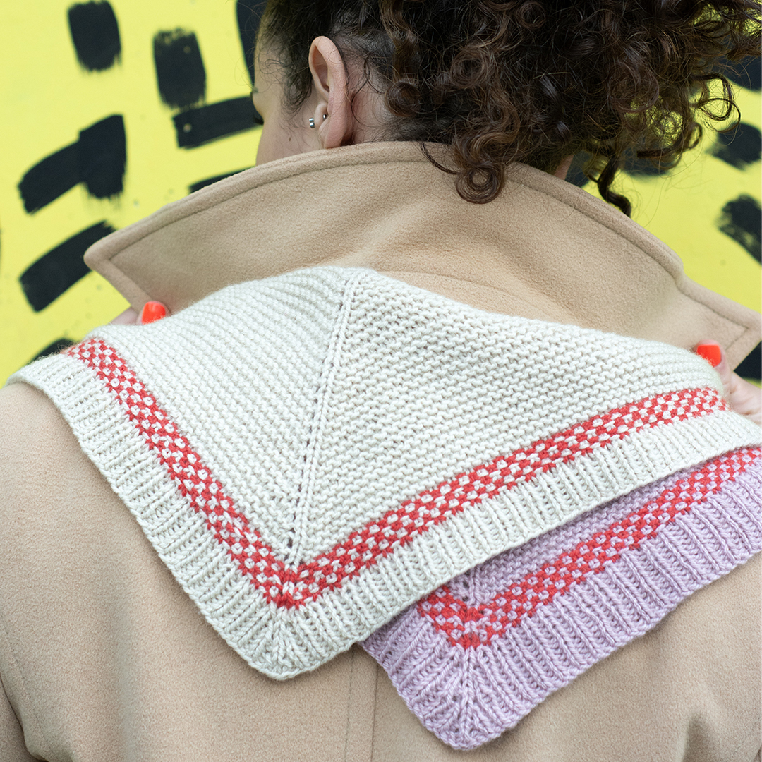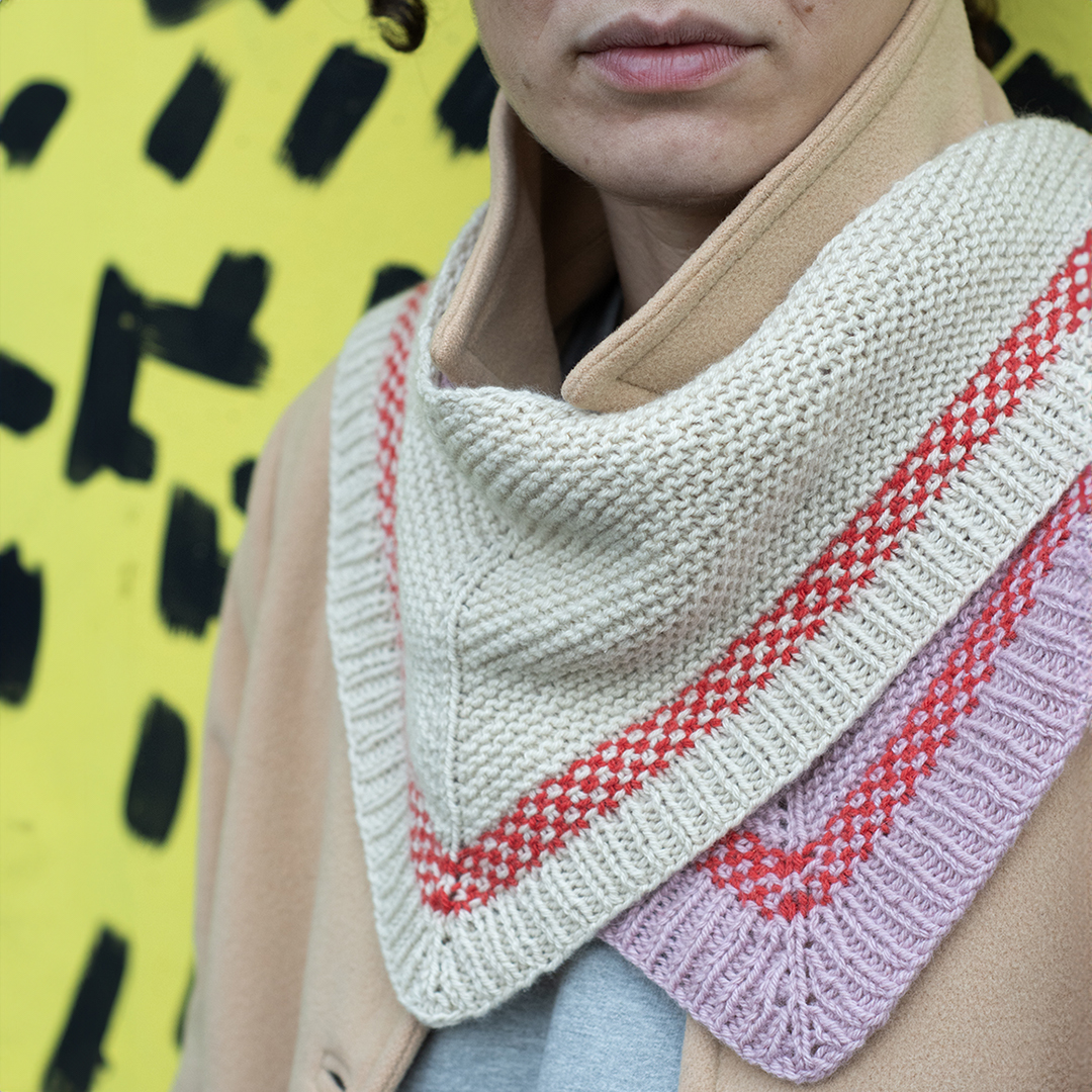 This charming garter stitch bandana with a two-colour linen stitch trim is knitted in a single piece back and forth and from top to bottom, creating a right triangle with a “vee” effect. The textured dots introduce a very minimal touch of fantasy. Enjoy choosing two vibrant colours to infuse energy and joy or two nuanced colours that make it an everyday accessory.
