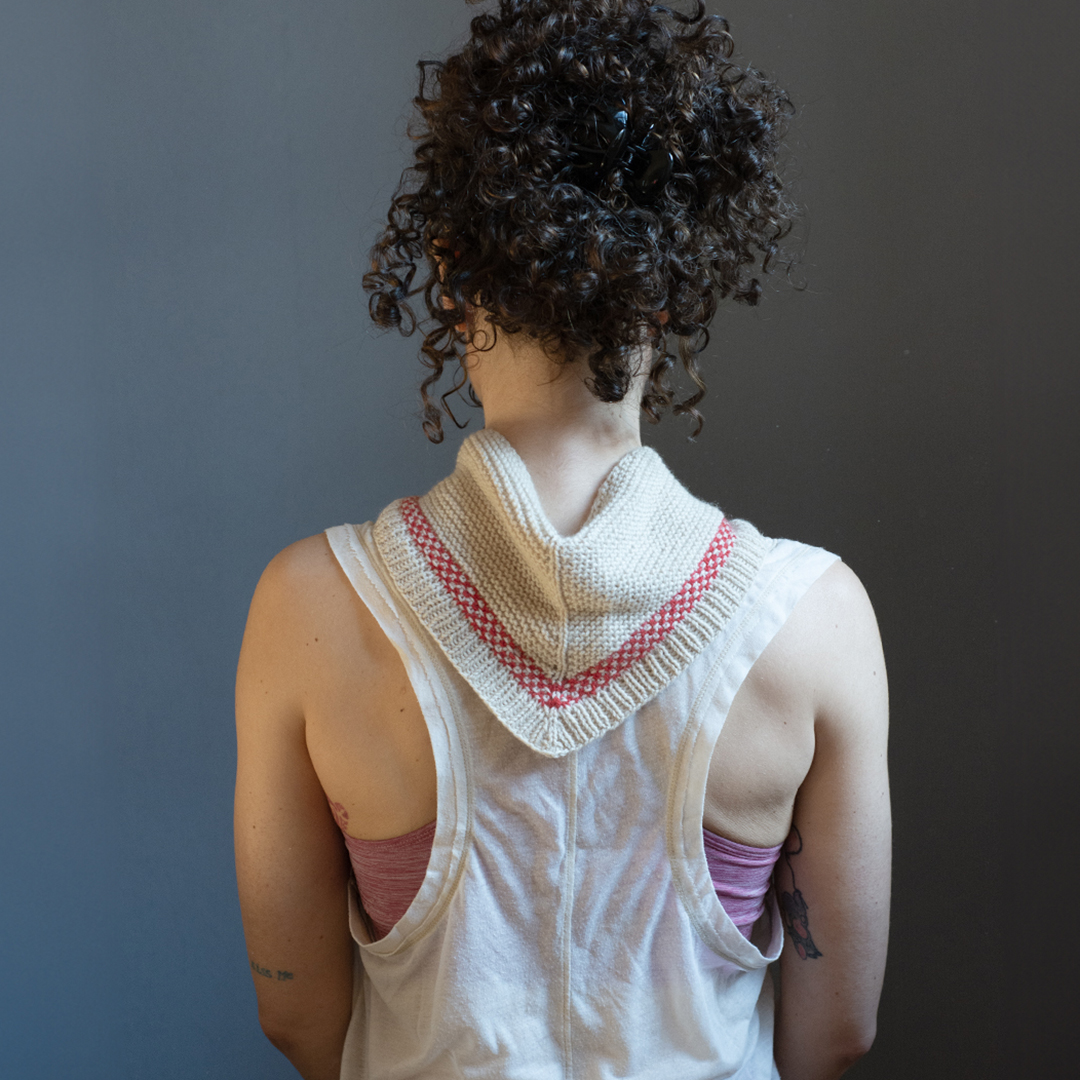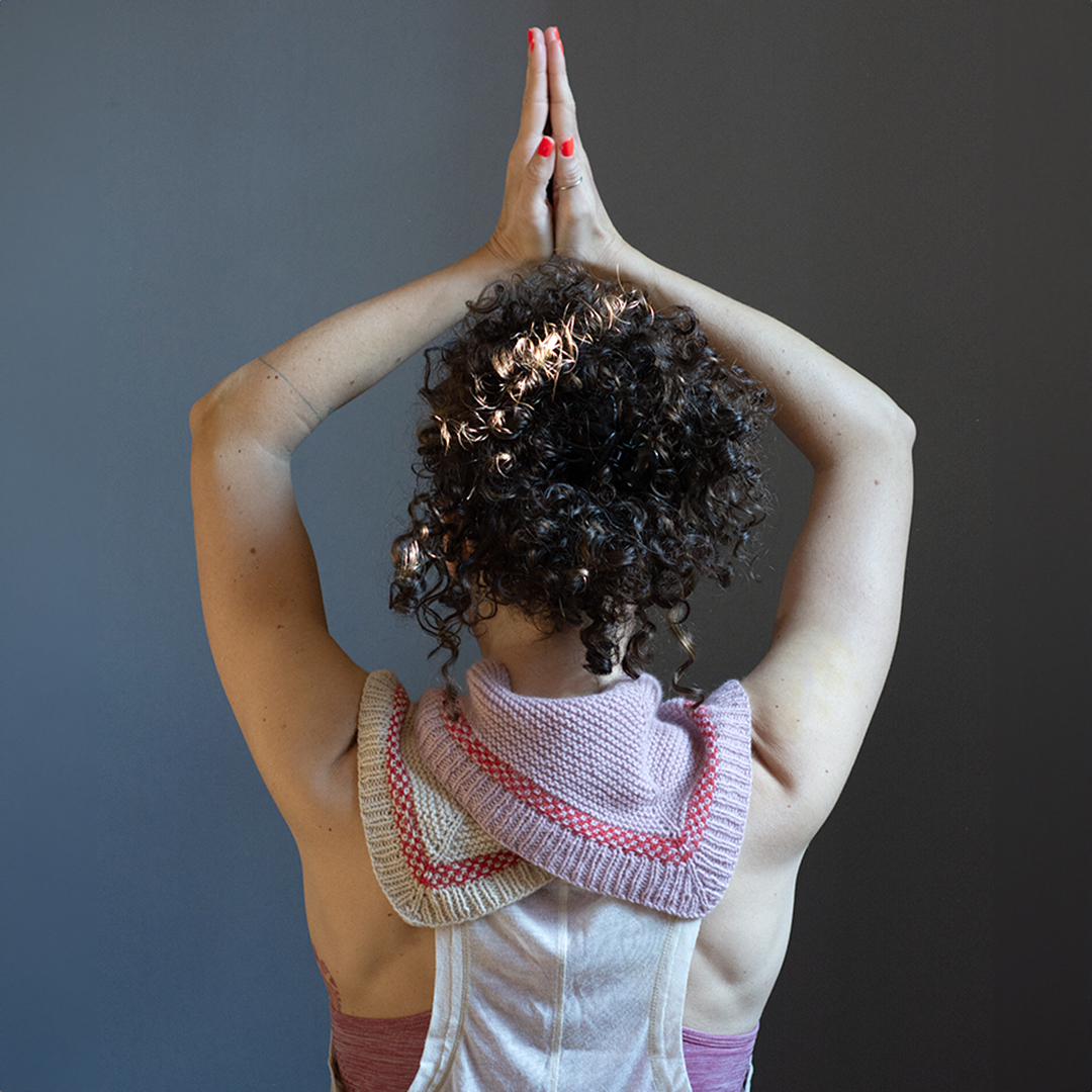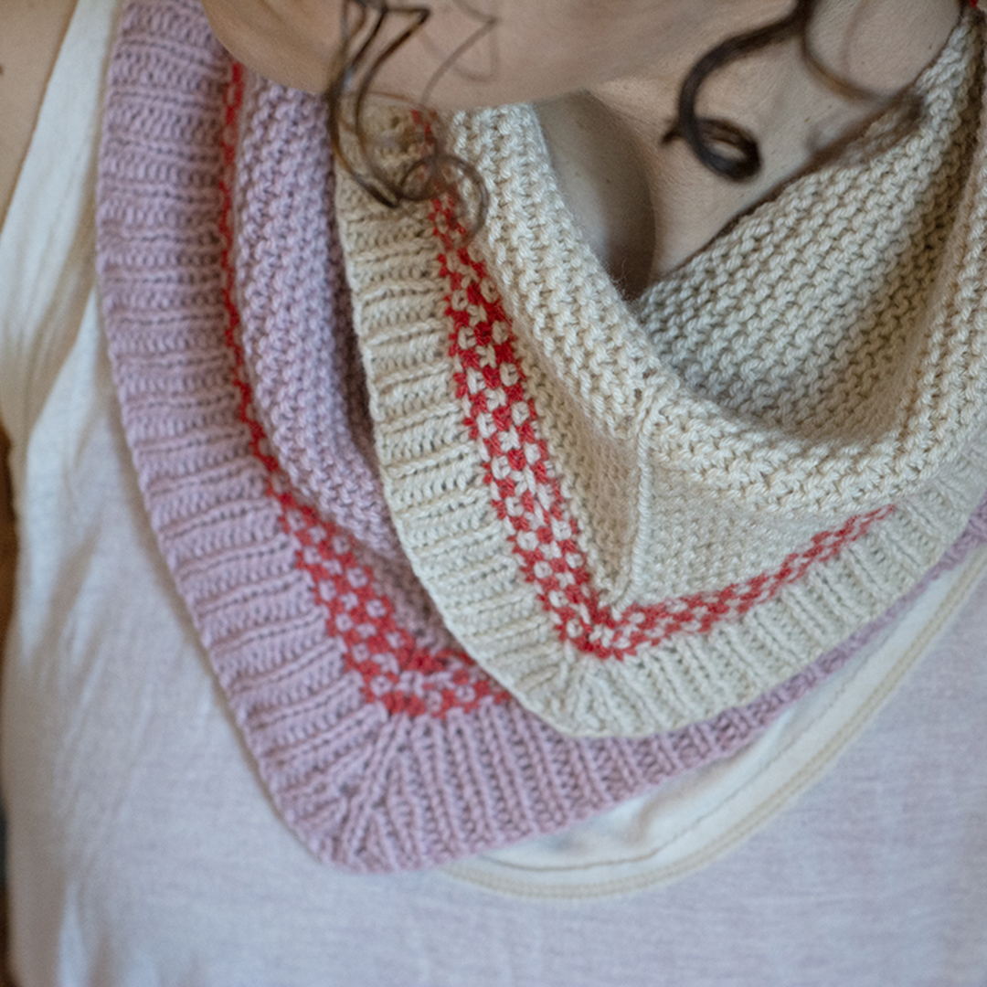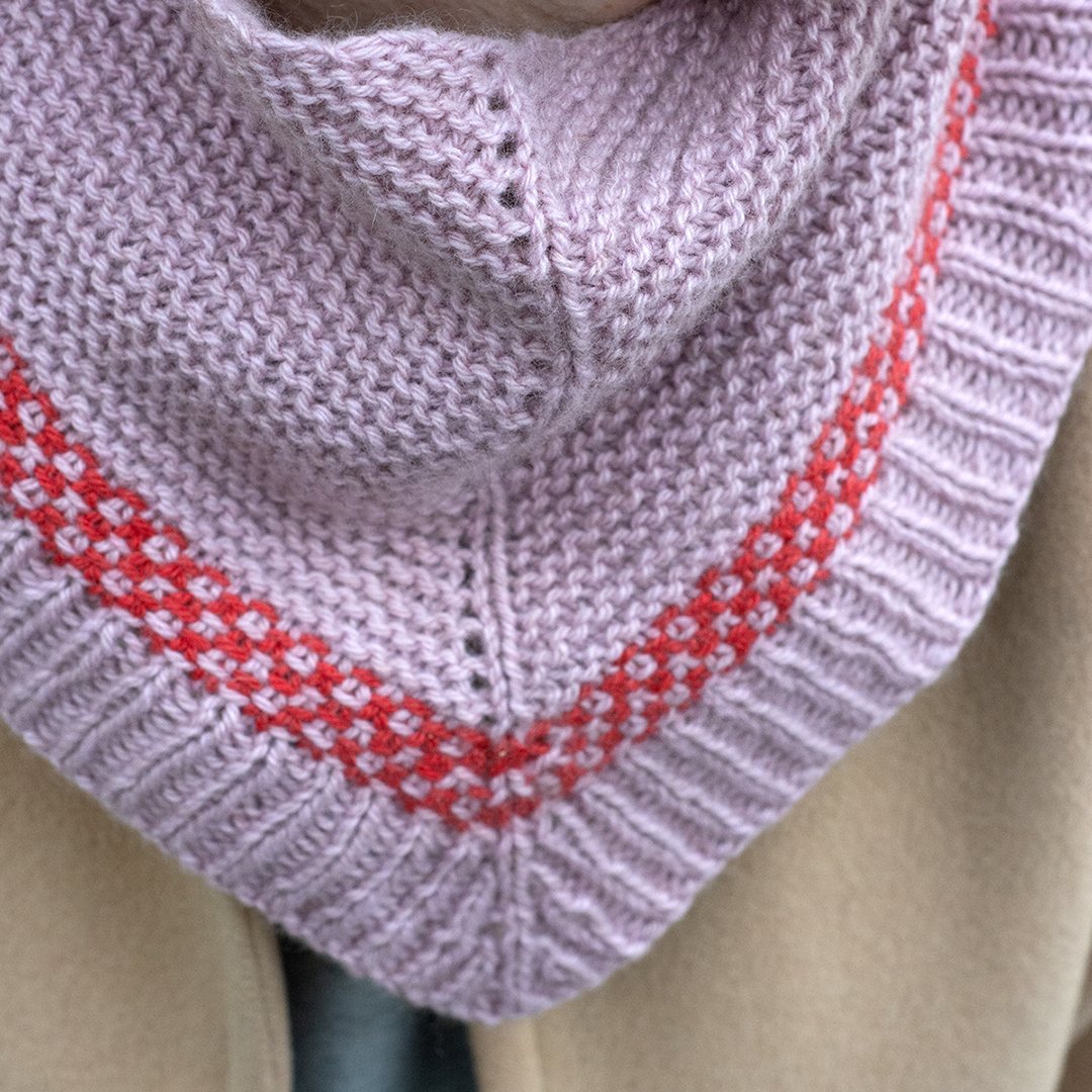 This charming garter stitch bandana with a two-colour linen stitch trim is knitted in a single piece back and forth and from top to bottom, creating a right triangle with a “vee” effect. The textured dots introduce a very minimal touch of fantasy. Enjoy choosing two vibrant colours to infuse energy and joy or two nuanced colours that make it an everyday accessory.