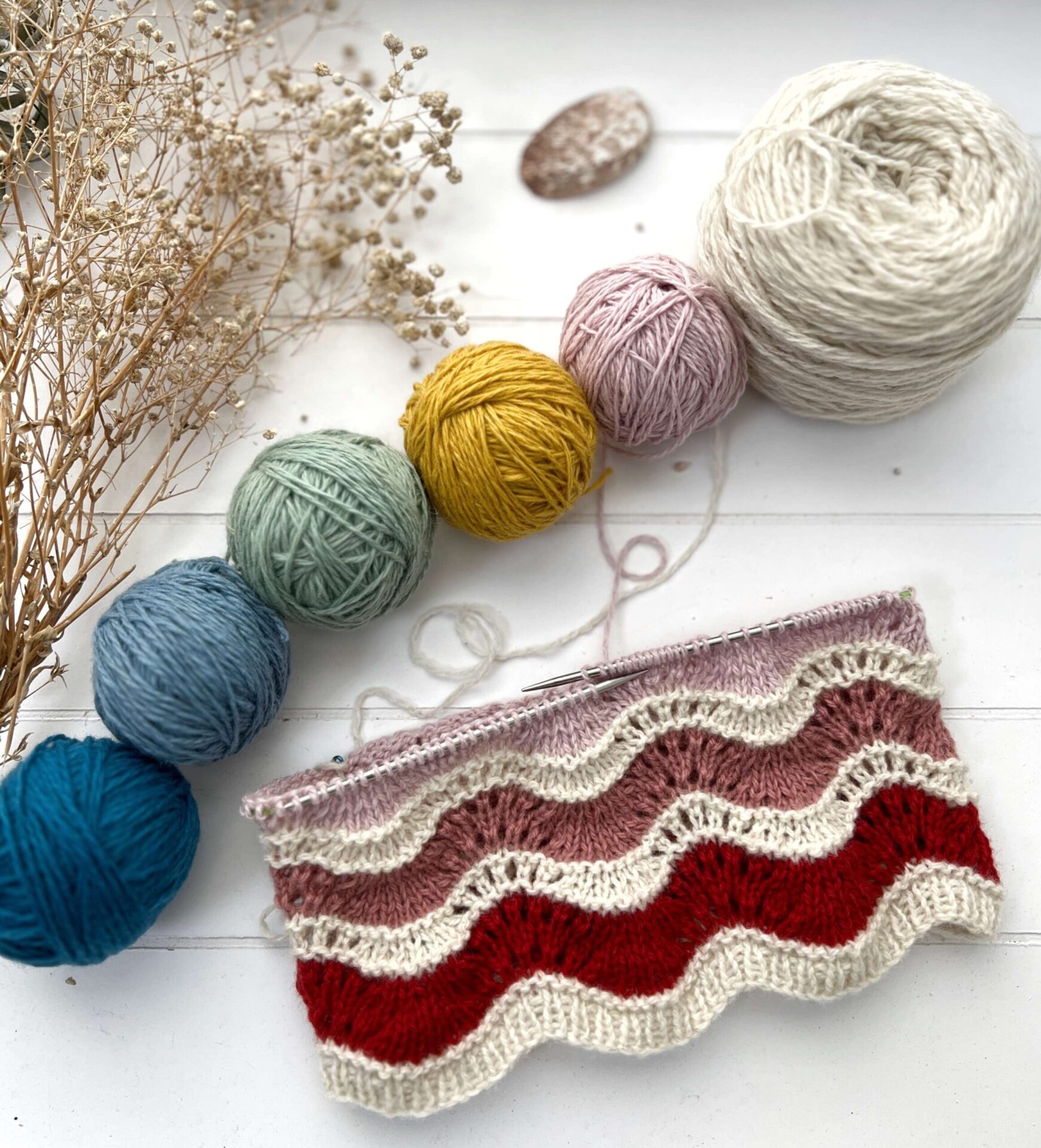 NOTE on color combination: This pattern has been inspired by our Tibetan Harmonies box. We replaced the discontinued colors Callicarpa and Ortensia with Peony and Stone Blue.