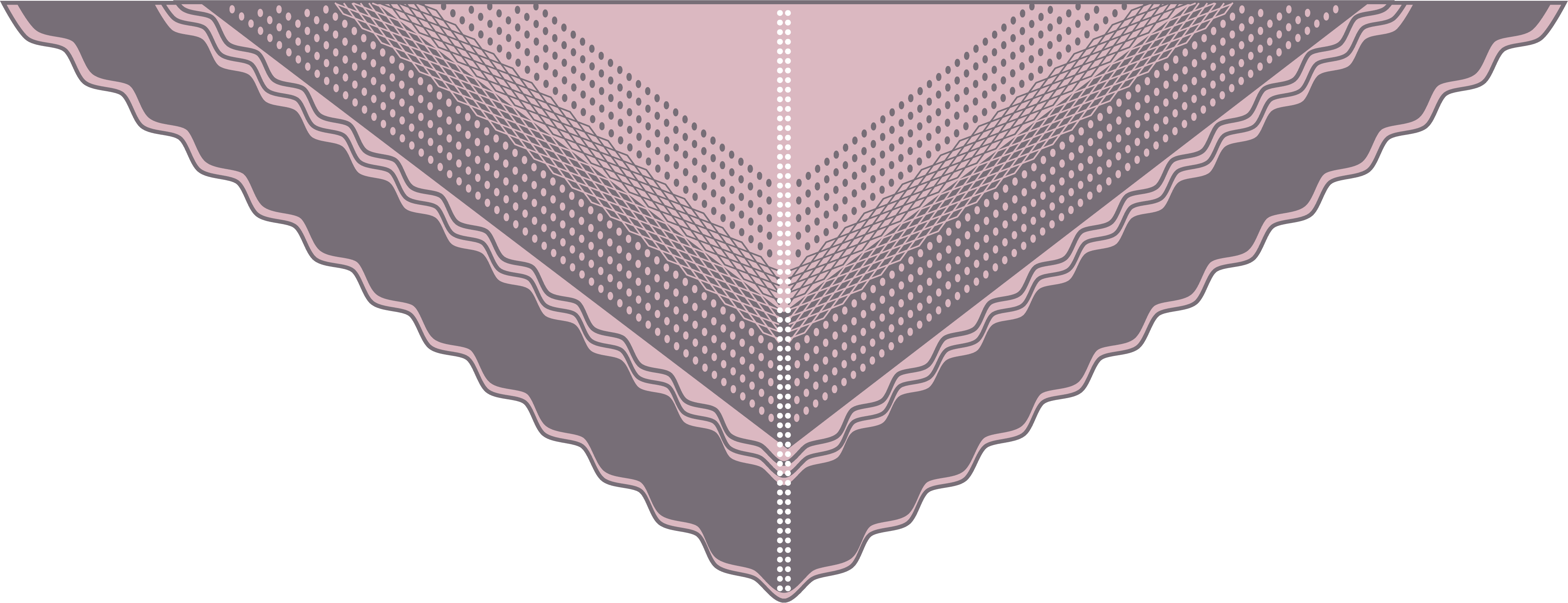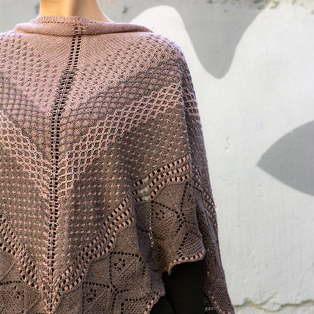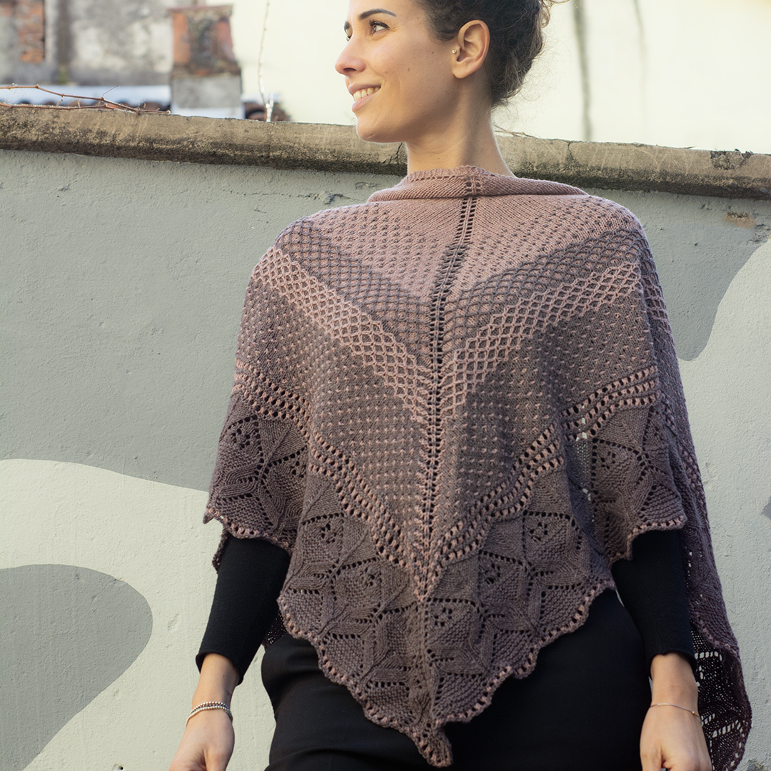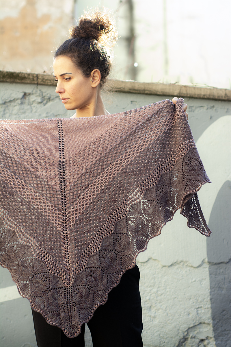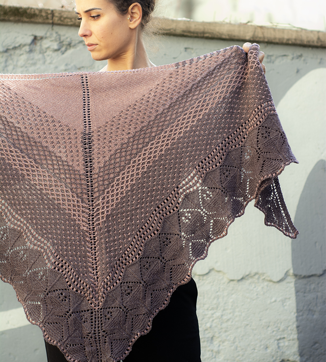 Worked in luxurious cashmere yarn, this triangular shawl is worked from the top down. Both charts and written instructions are given for the stitch patterns.