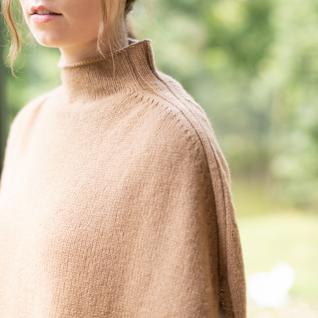 The pop-over is worked flat in pieces from the bottom up, then pieces are sewn together along shoulders, leaving sides open. The collar is worked circularly from live stitches.